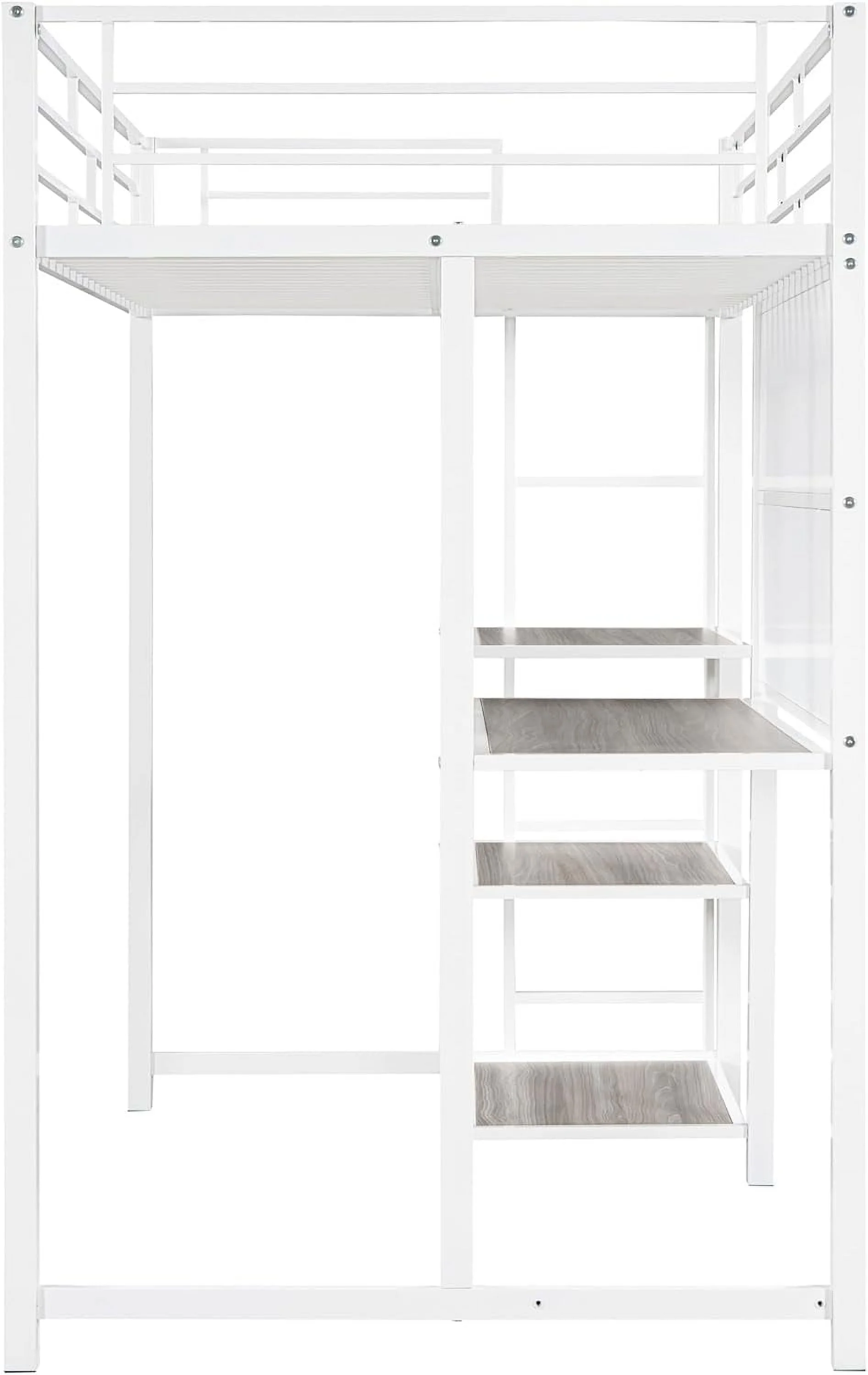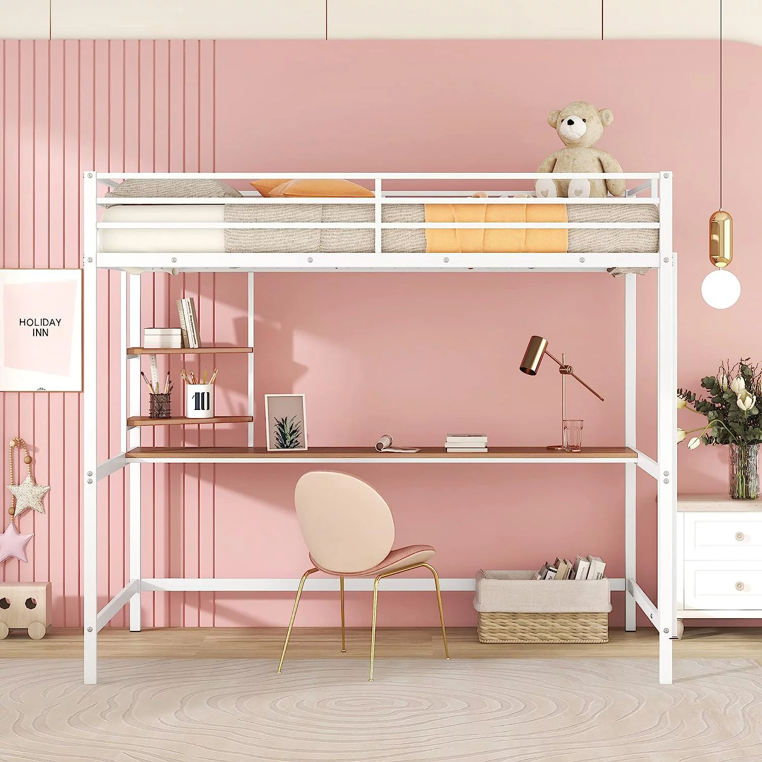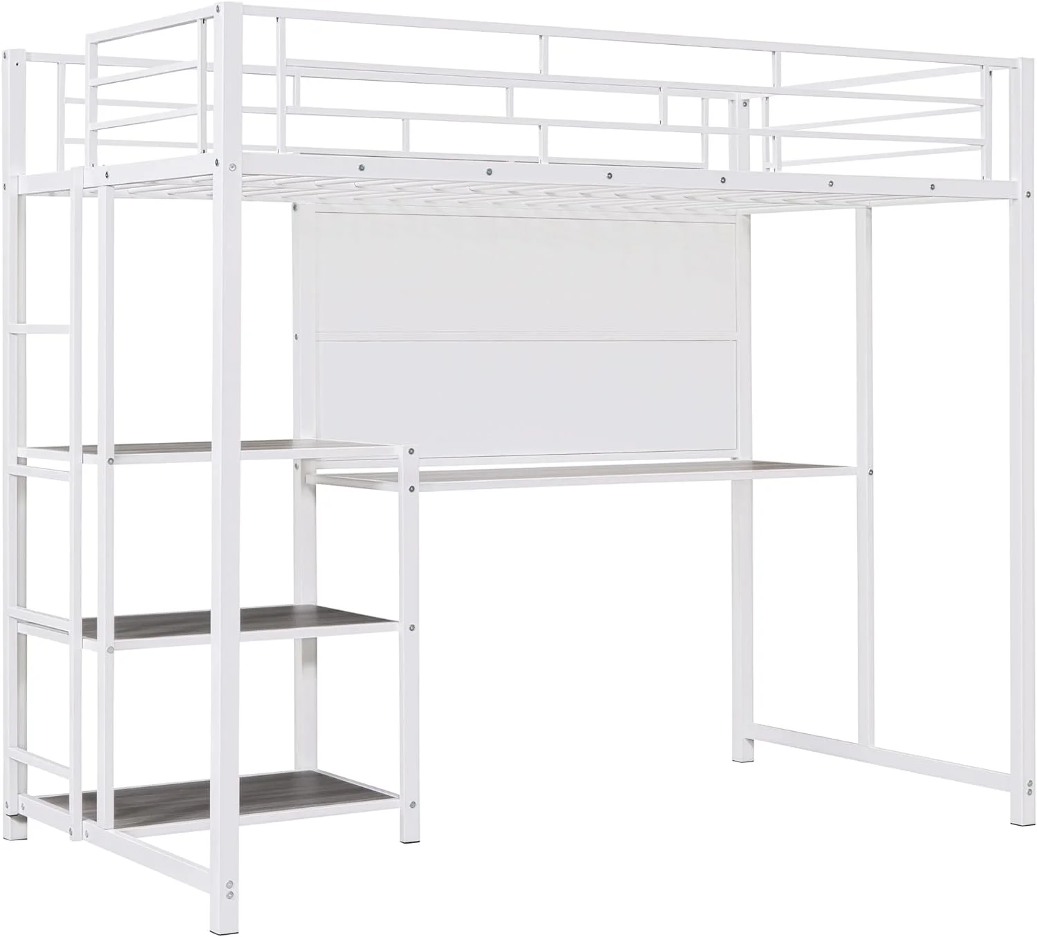 Loft Bed With Desk And 3 Shelves, Metal Size Loft Bed With Writing Board, Sapce Saving Loft Bed For Kids, Boys,Girls,Teens,White