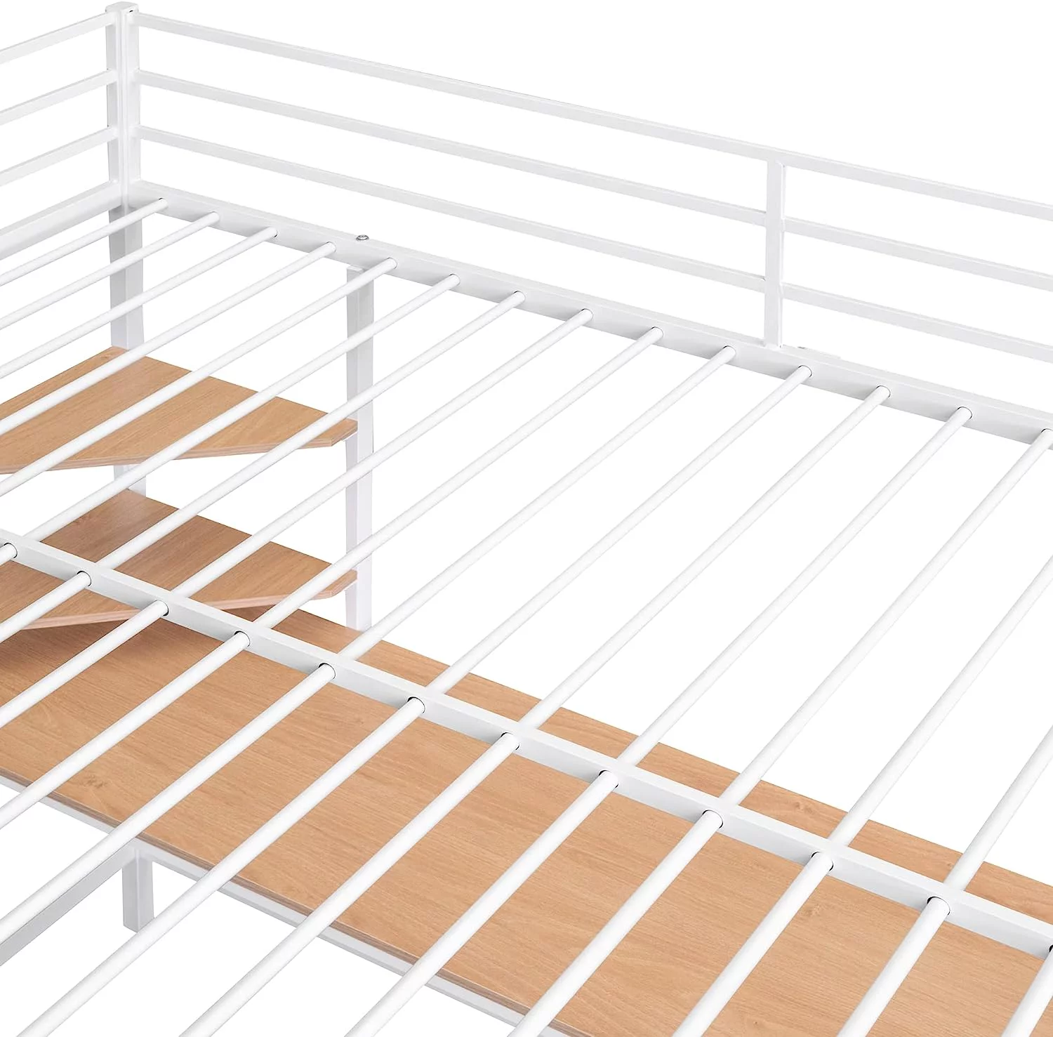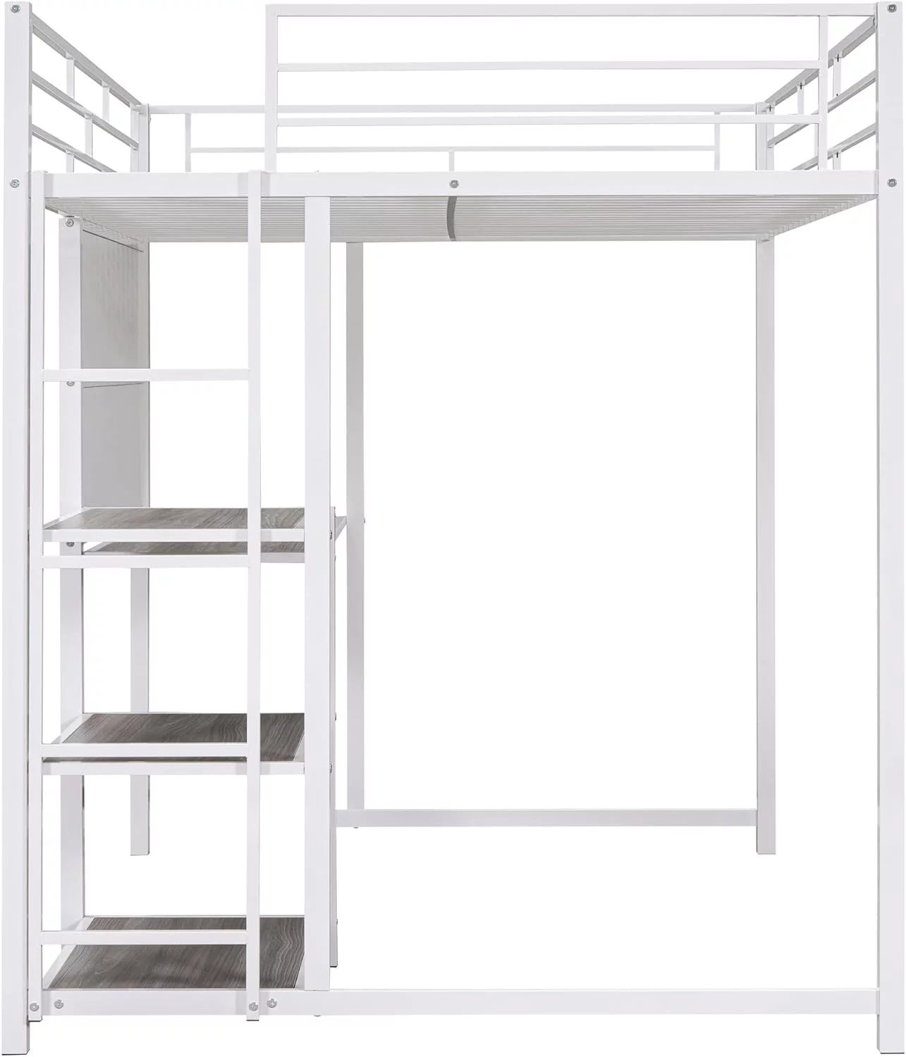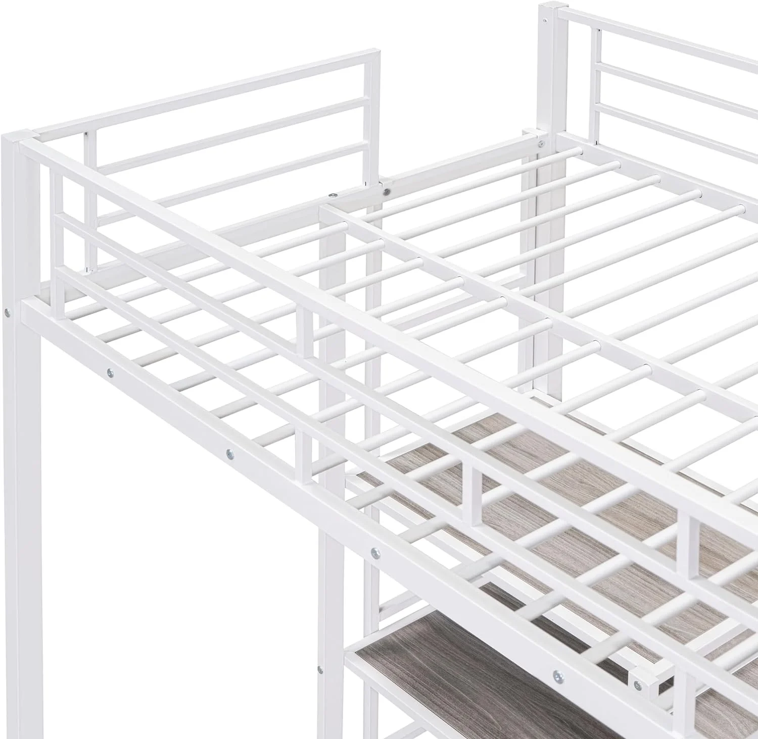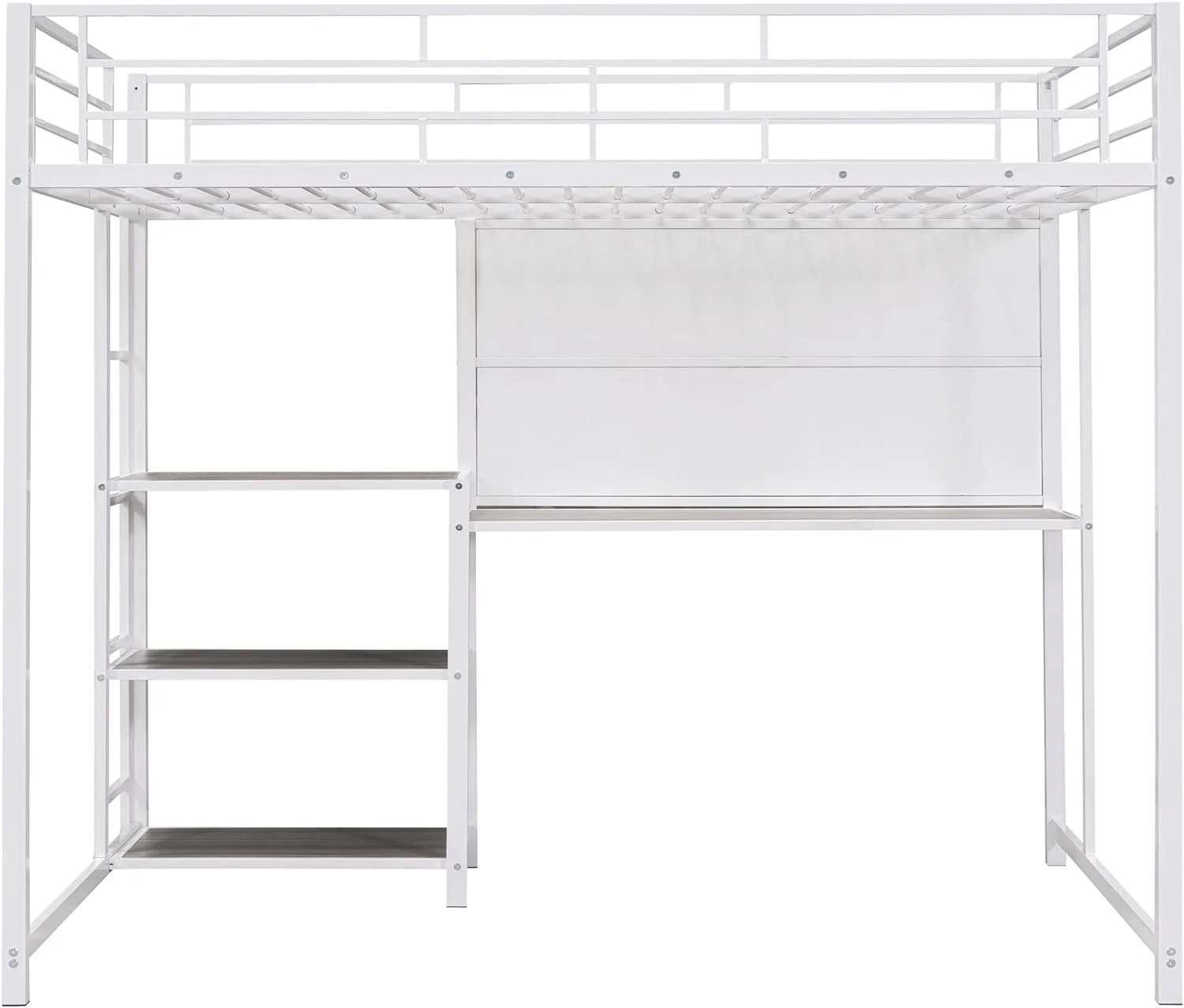 Loft Bed With Desk And 3 Shelves, Metal Size Loft Bed With Writing Board, Sapce Saving Loft Bed For Kids, Boys,Girls,Teens,White