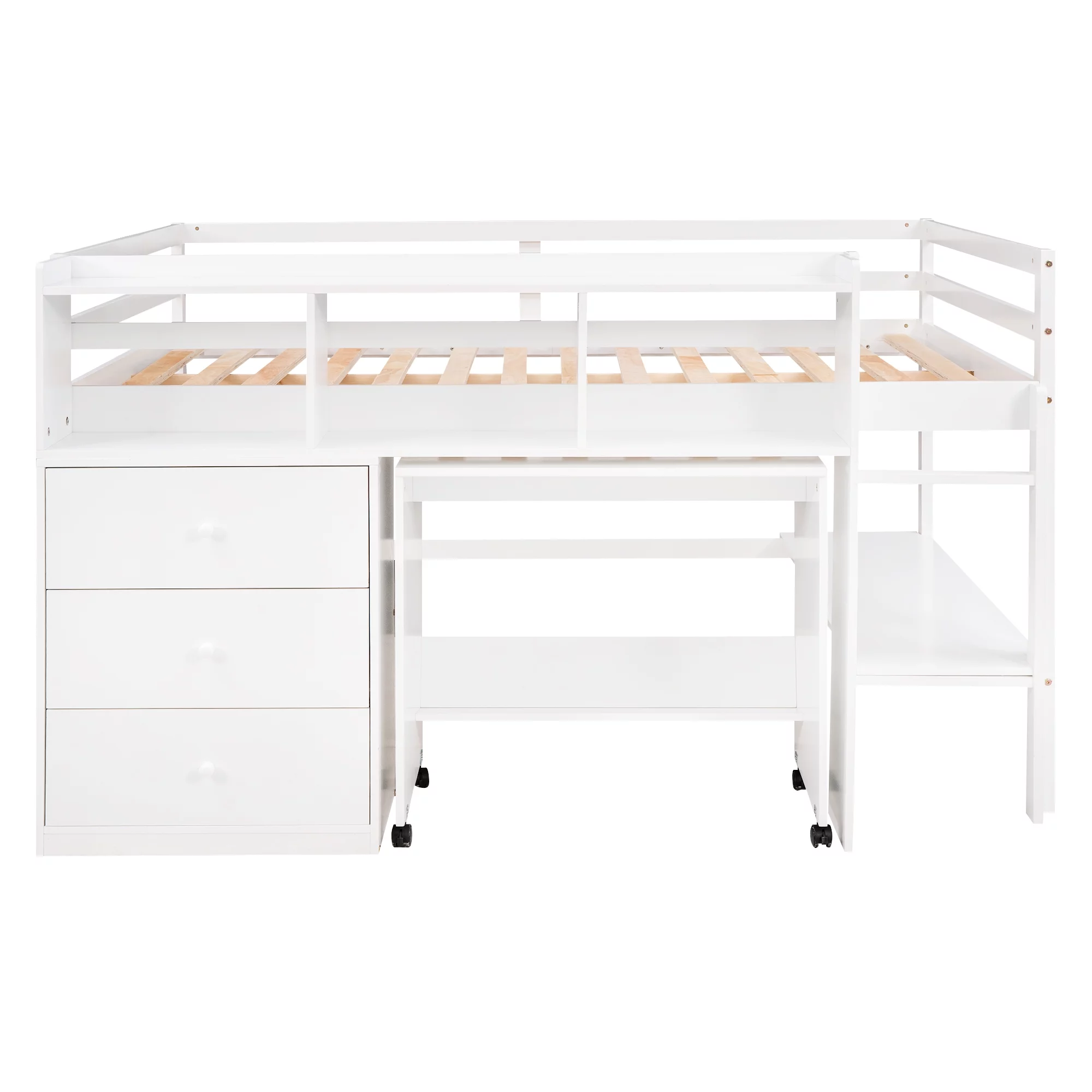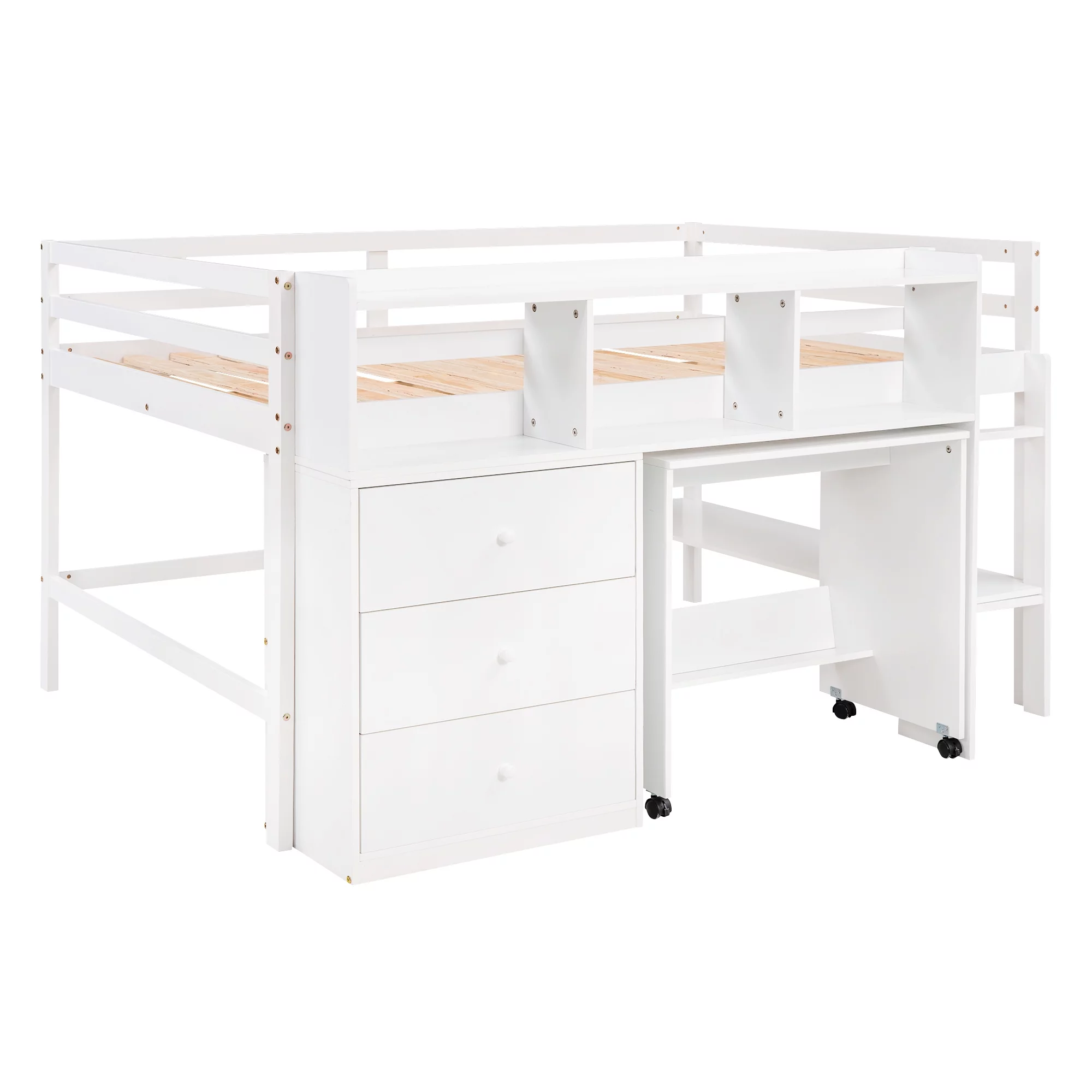 Leadzm Full Size Low Loft Bed with Rolling Portable Desk, Drawers and Shelves, White