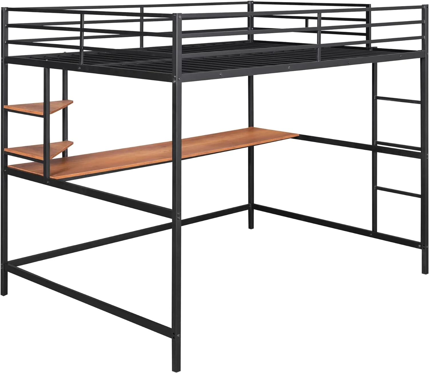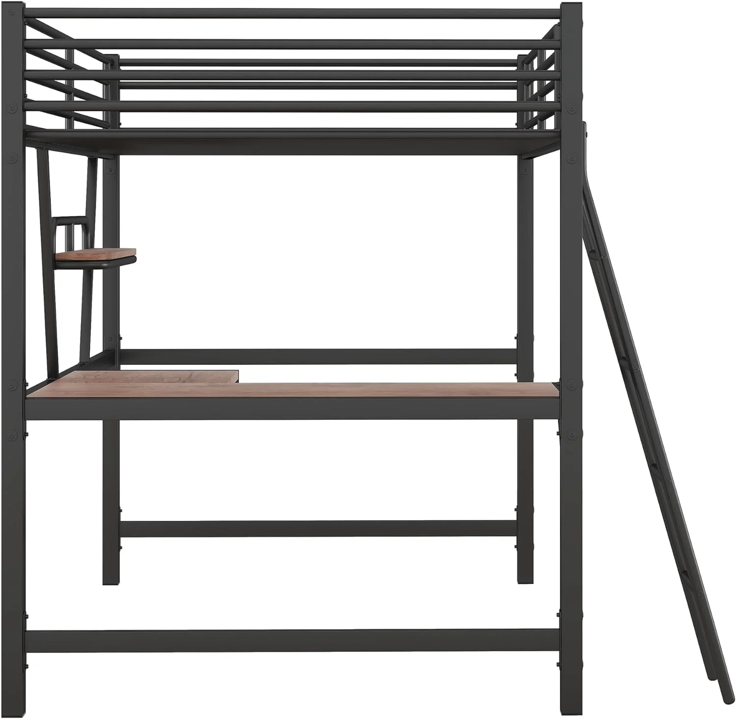 Metal Loft Bed Size With Desk And Bookcase, Loft Bed Full-Length Guardrail, No Box Spring Needed (Black)