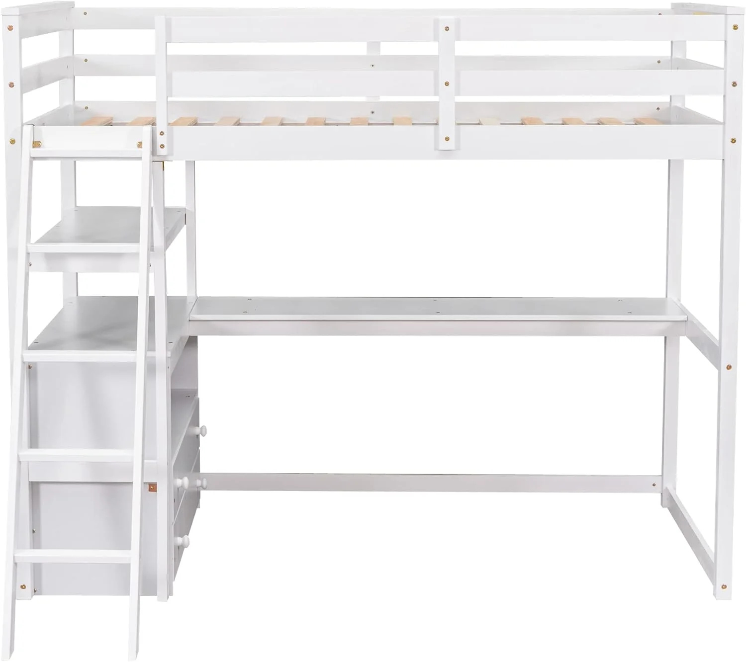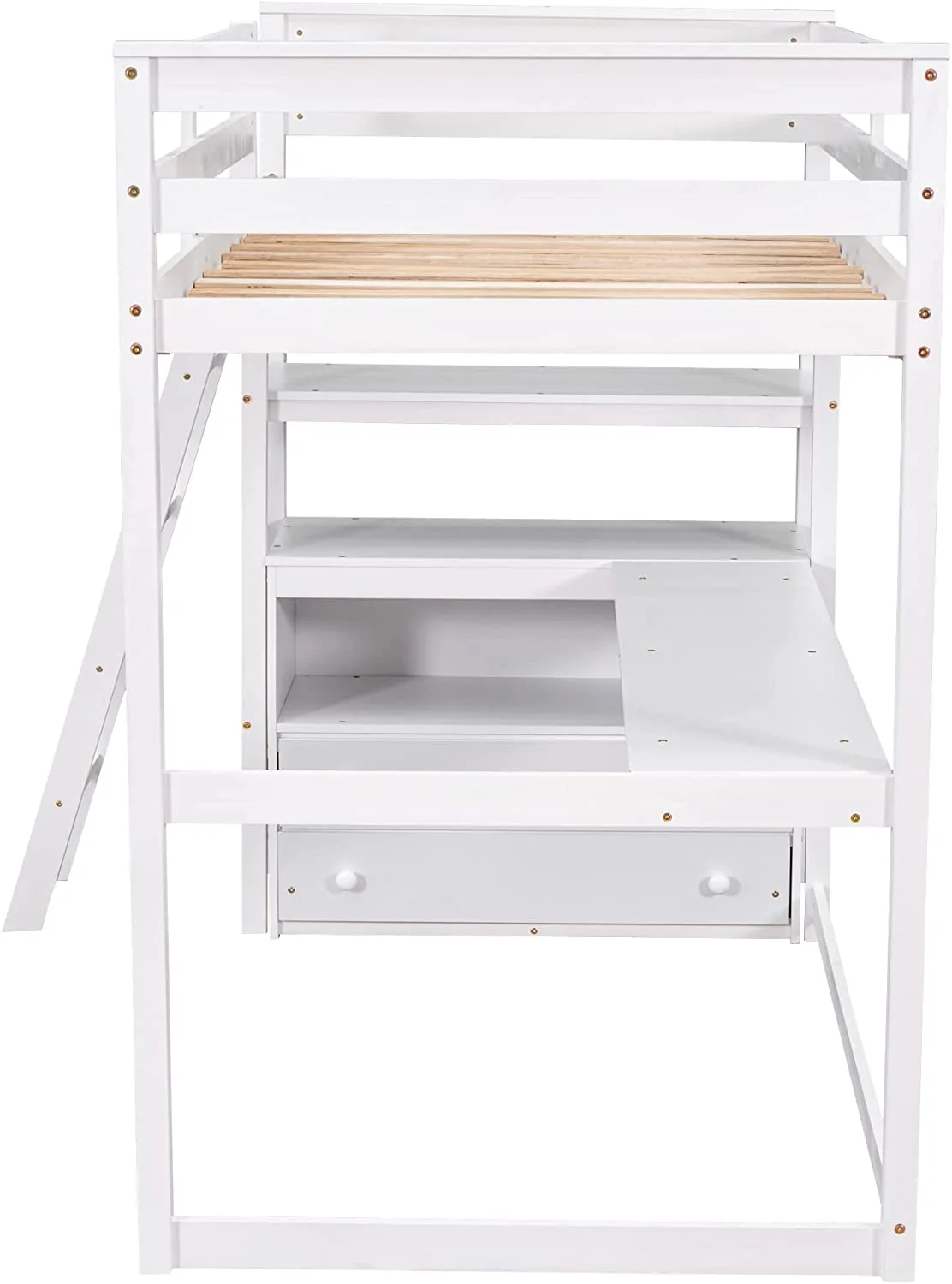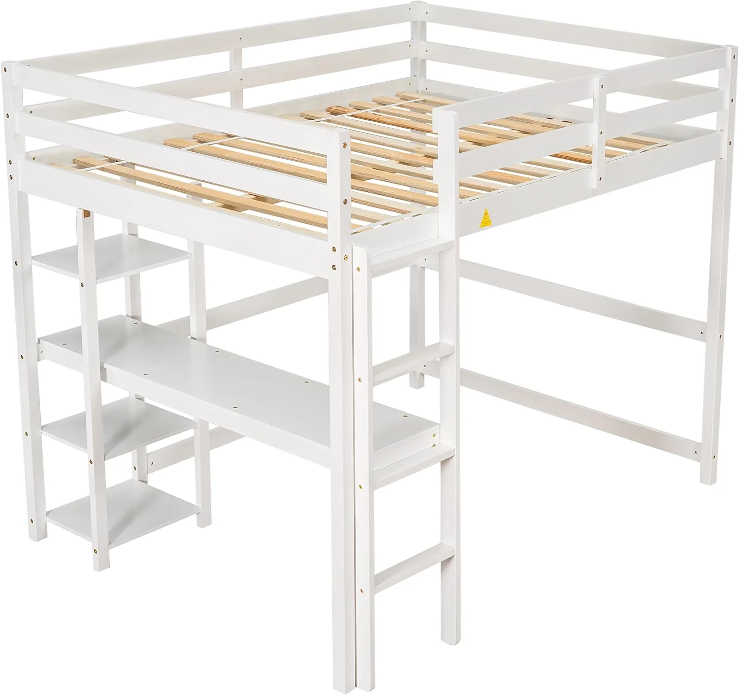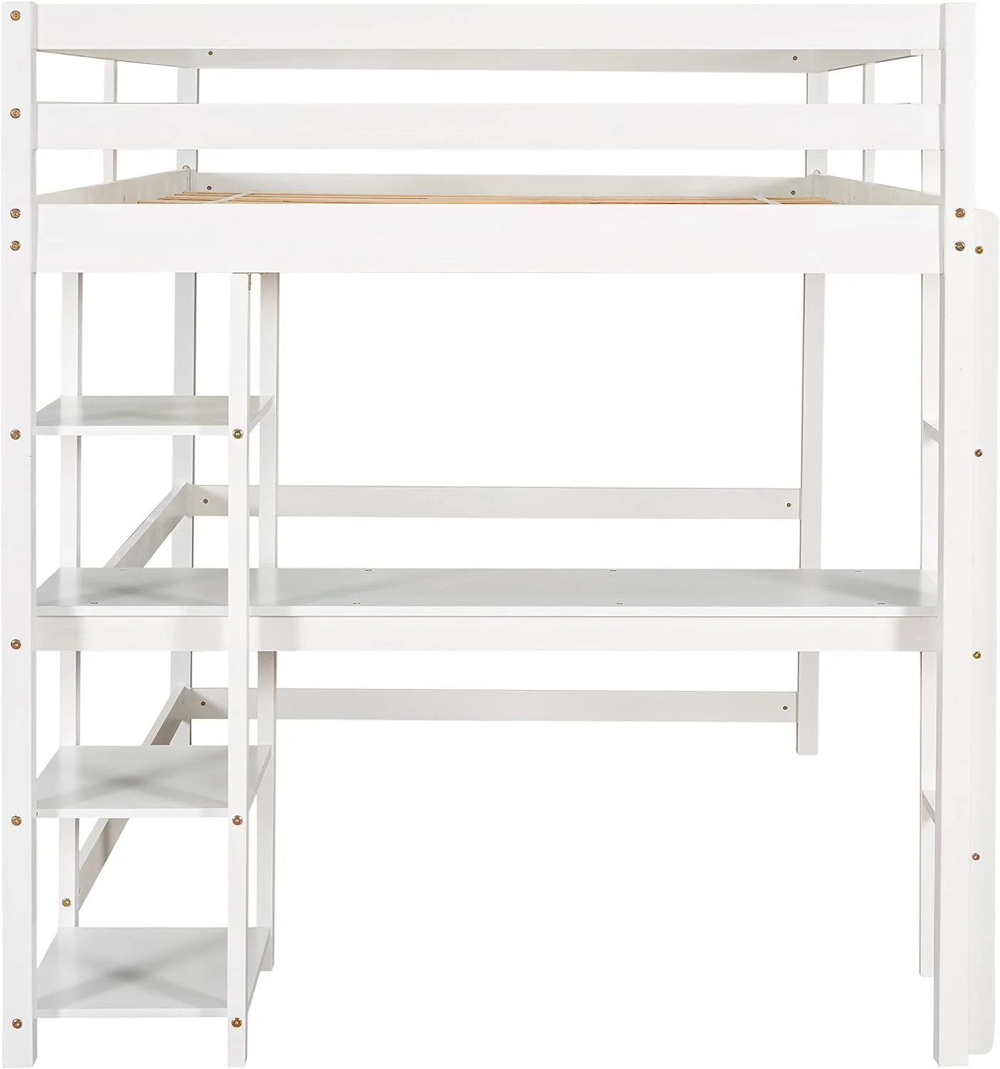 Full Size Loft Bed With Desk, Solid Wood Loft Bed Frame With Storage Shelves For Kids Tees Adults (White)