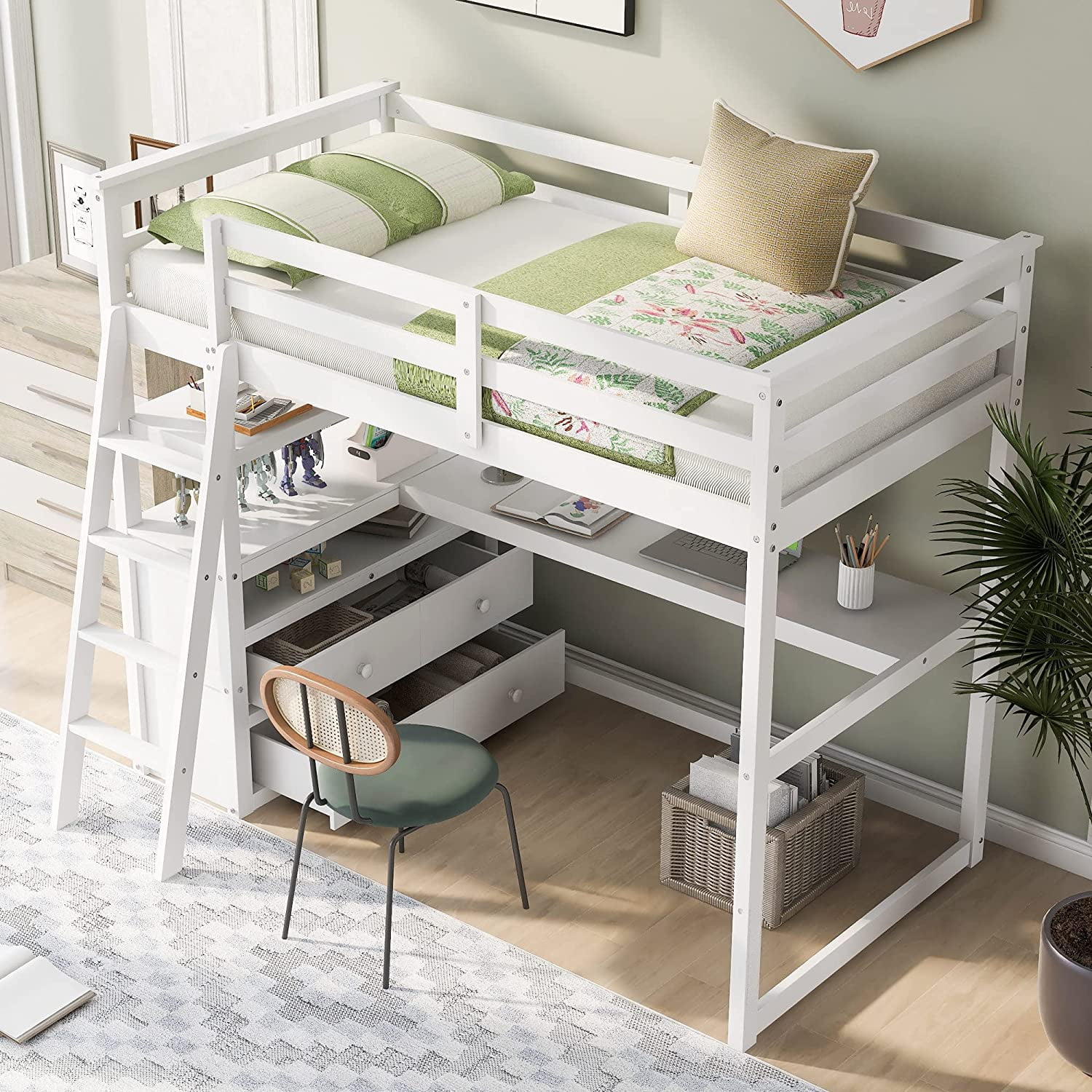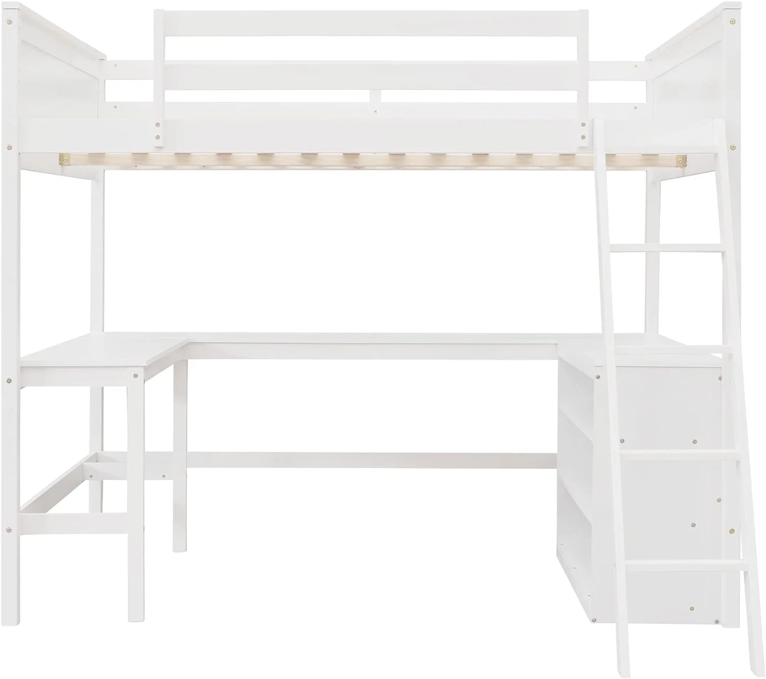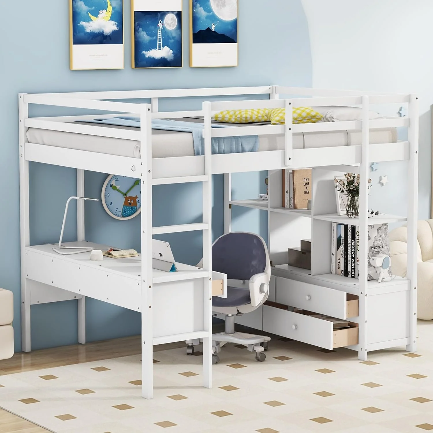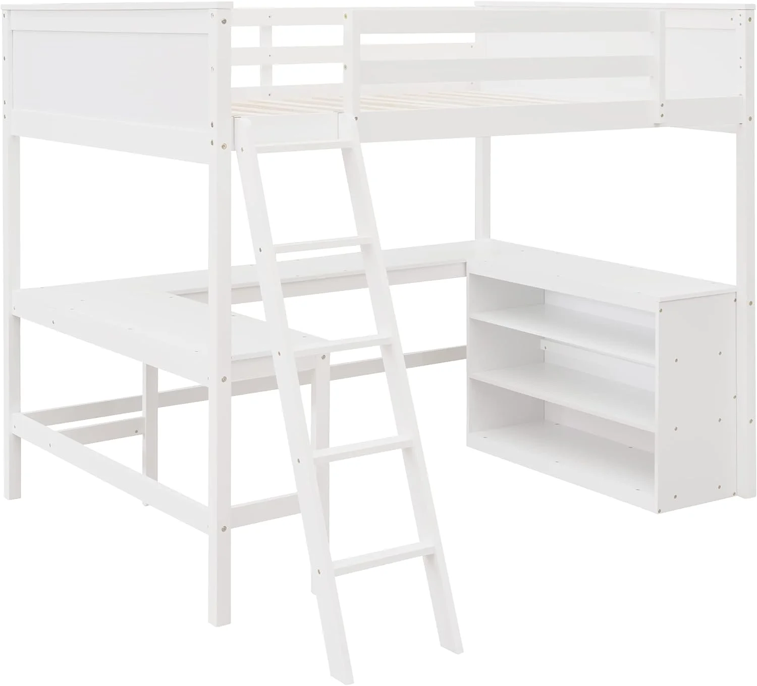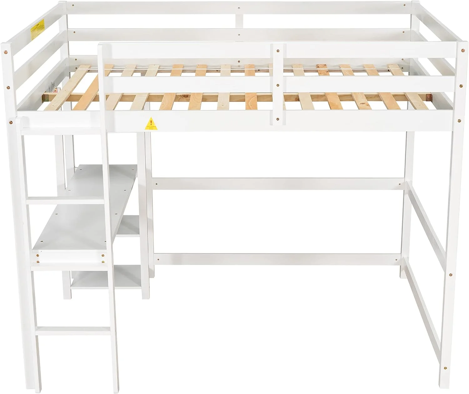 Full Size Loft Bed With Desk, Solid Wood Loft Bed Frame With Storage Shelves For Kids Tees Adults (White)