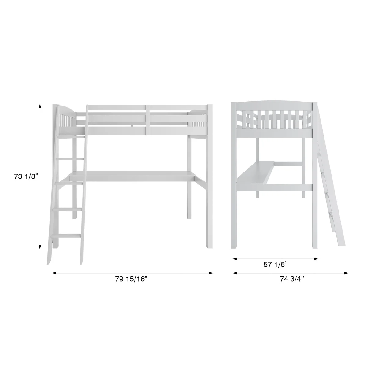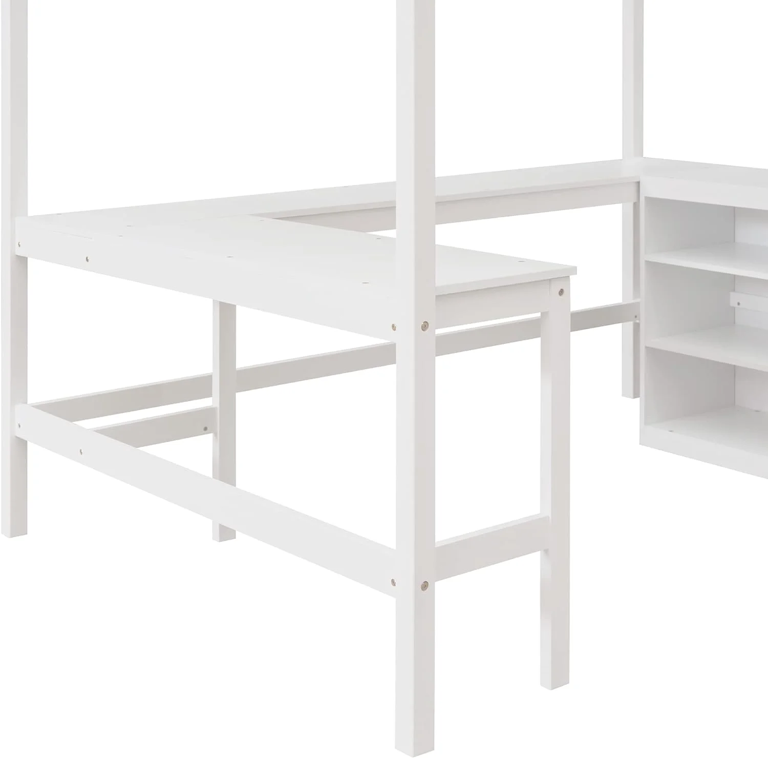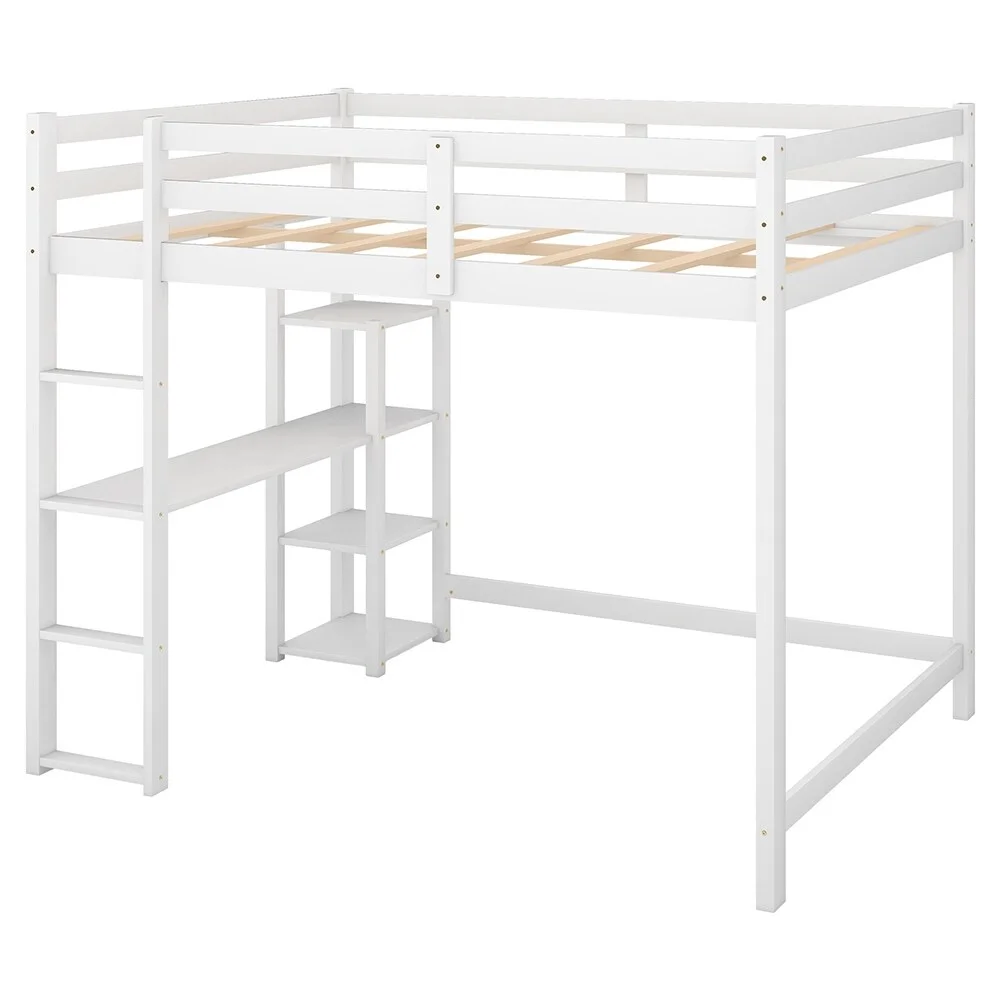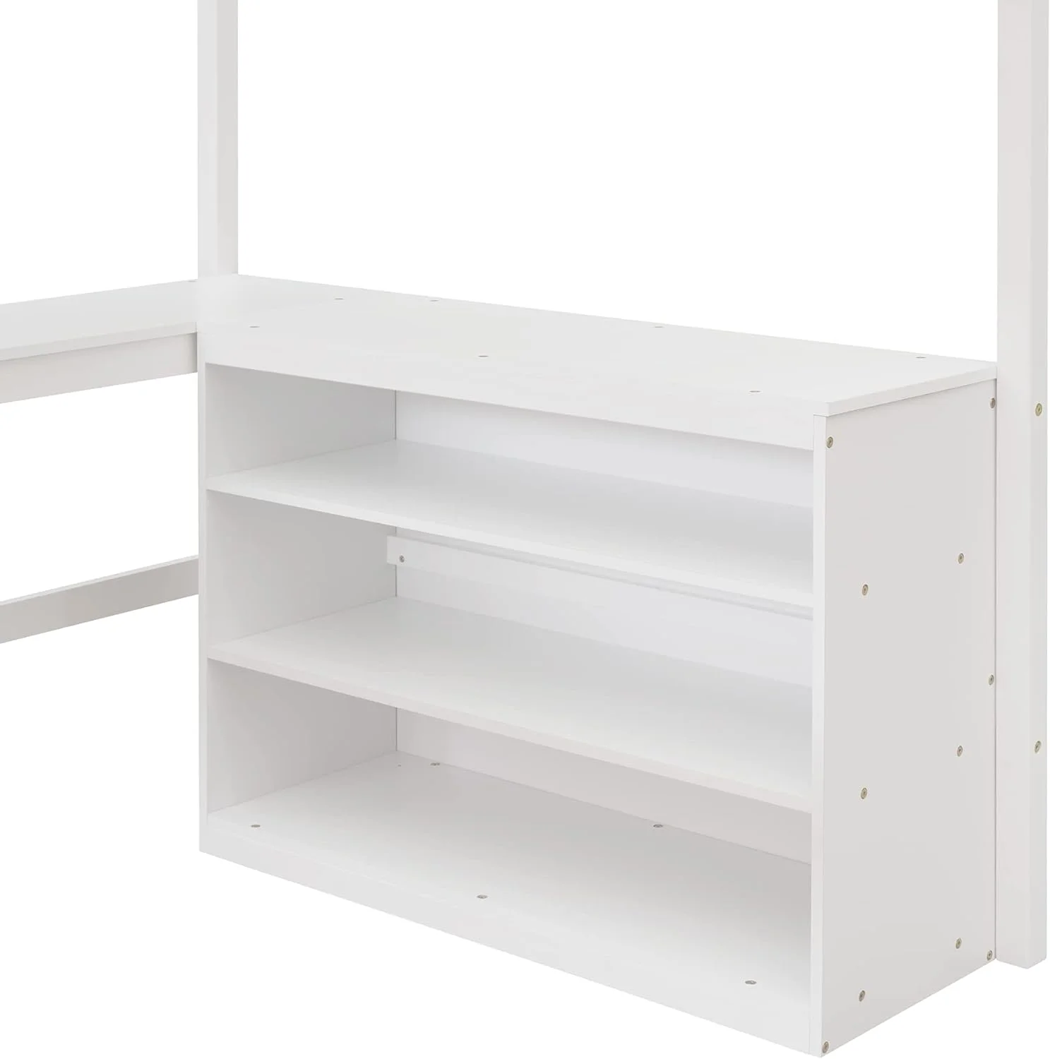 Full Size Loft Bed With Desk, Solid Wood Loft Bed Frame With Storage Shelves For Kids Tees Adults (White)