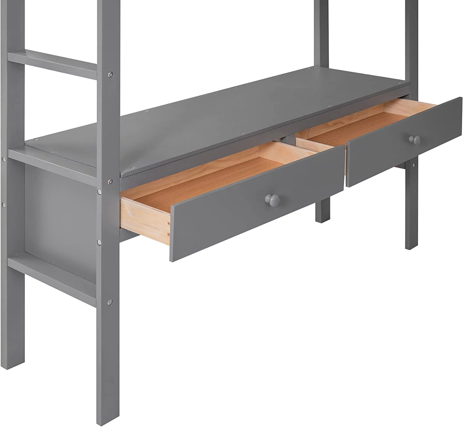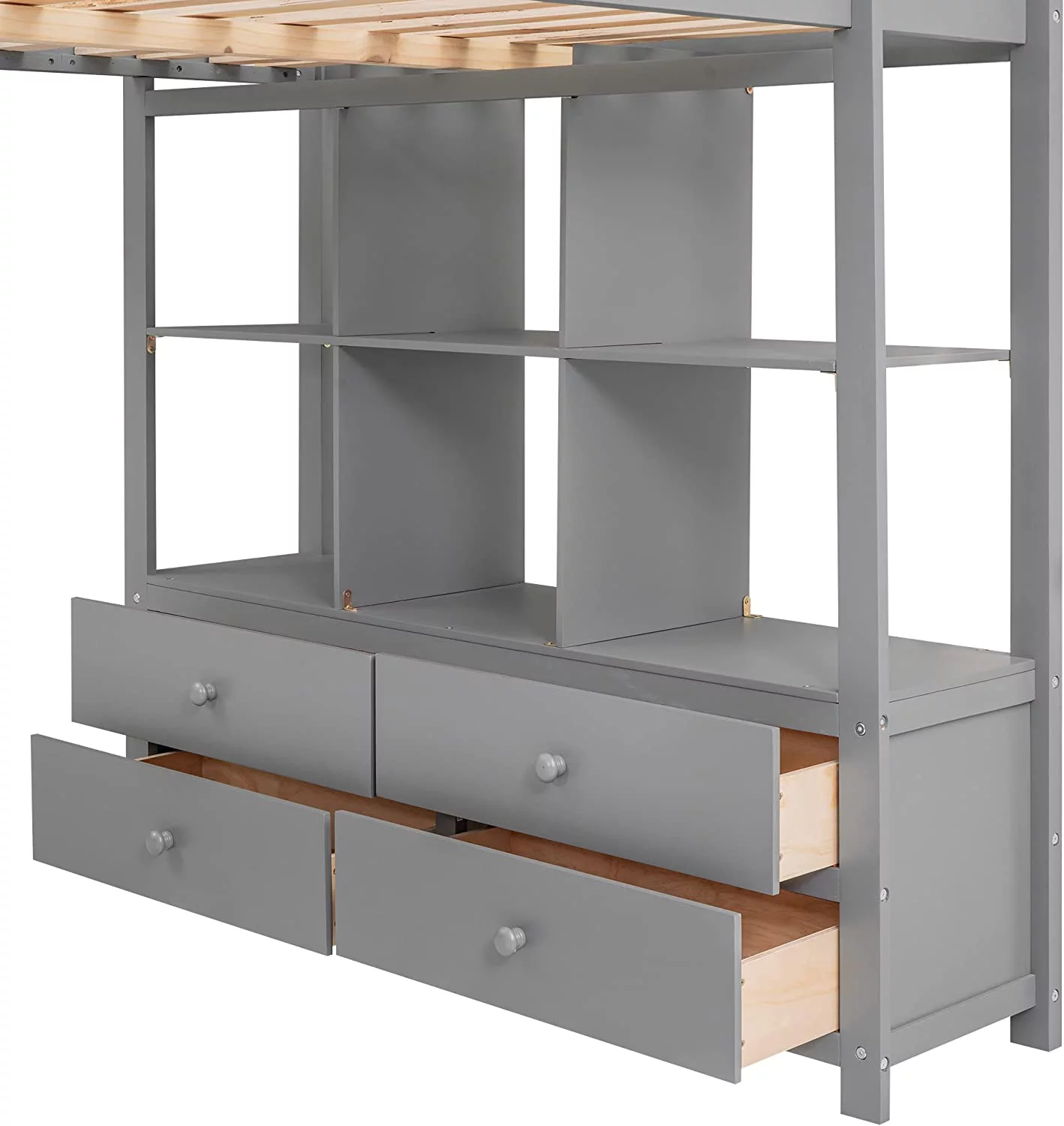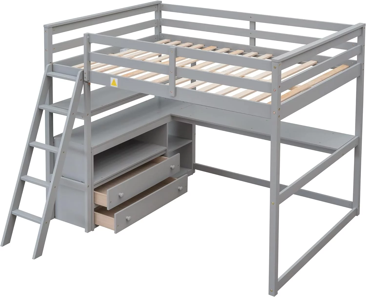 Full Size Loft Bed With Desk And Shelves, Wood Loft Bed With Storage Drawers For Kids Teens Adults, No Box Spring Needed, Gray