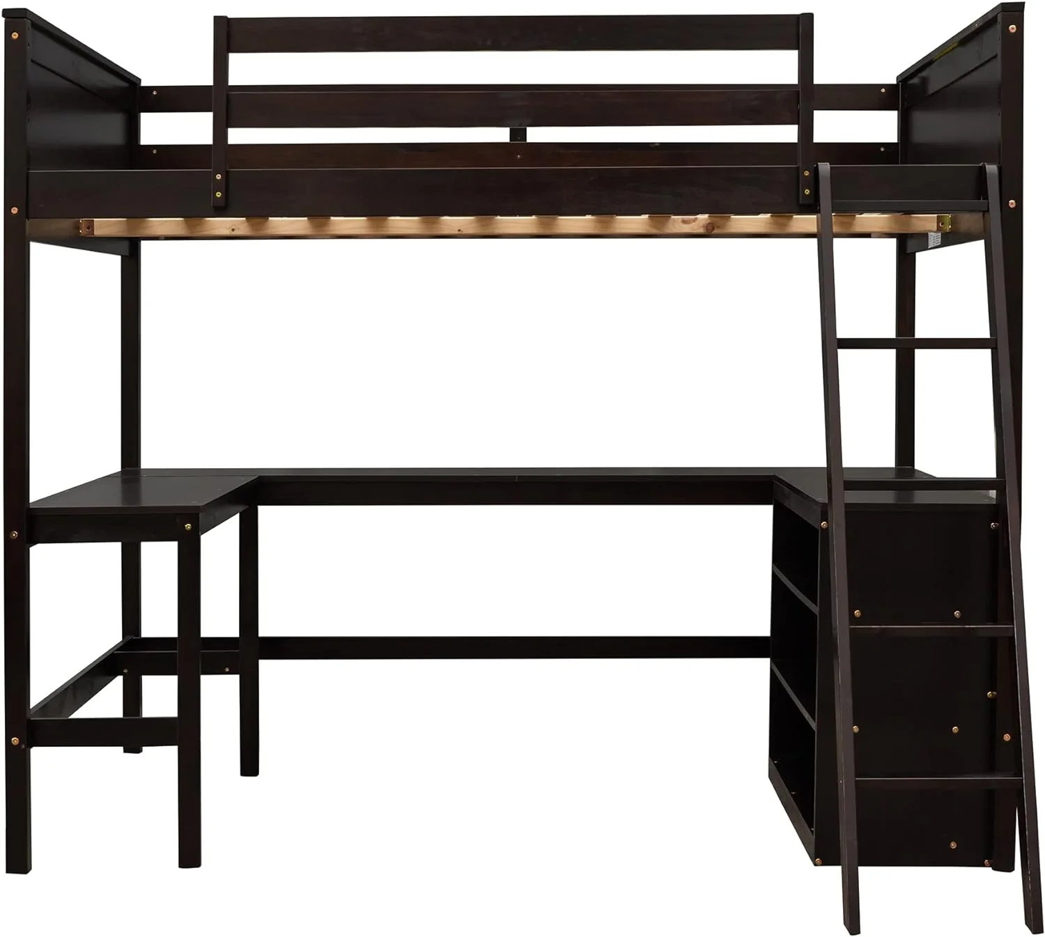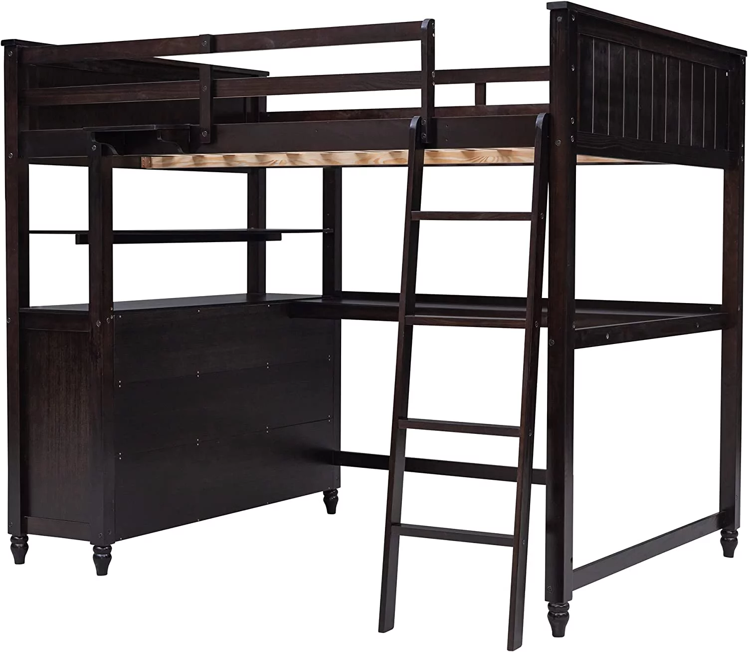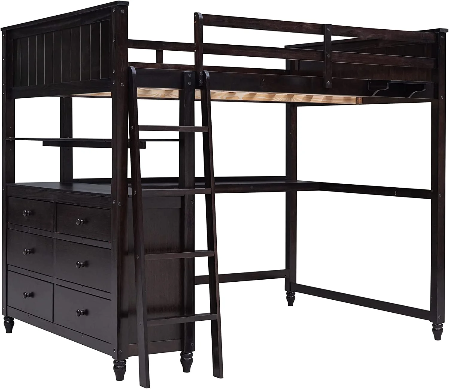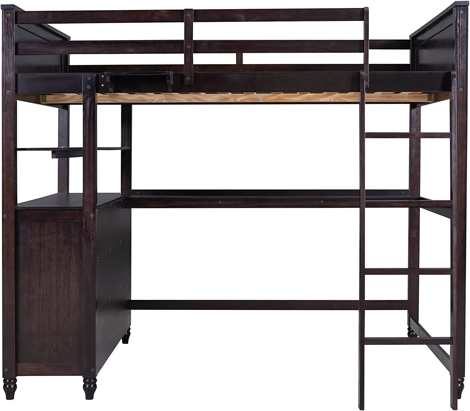 Full Size Loft Bed With Desk Ad Storage, Solid Wood Loft Bed Frame With Drawers Ad Shelves, For Kids Tees Adults - Espresso