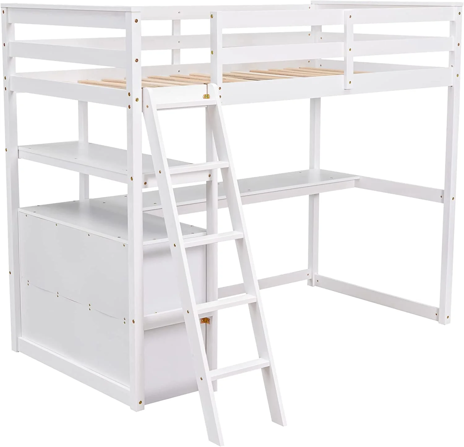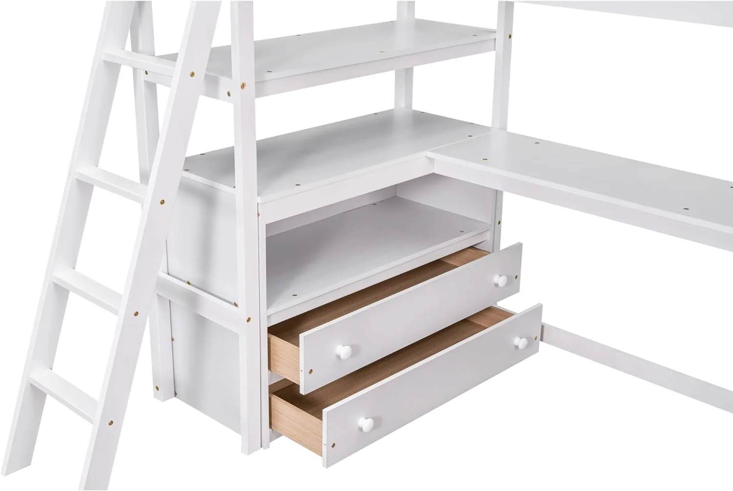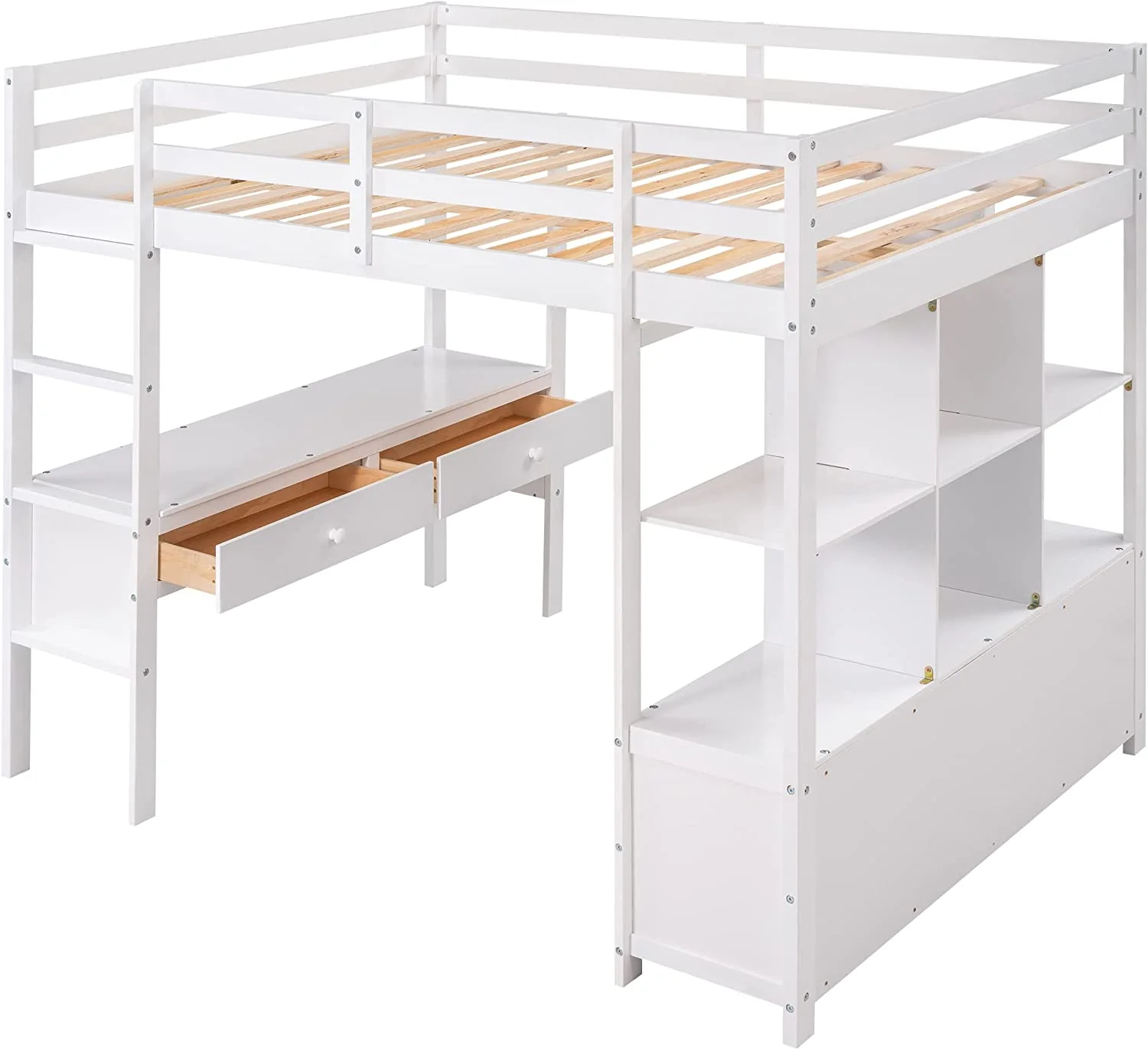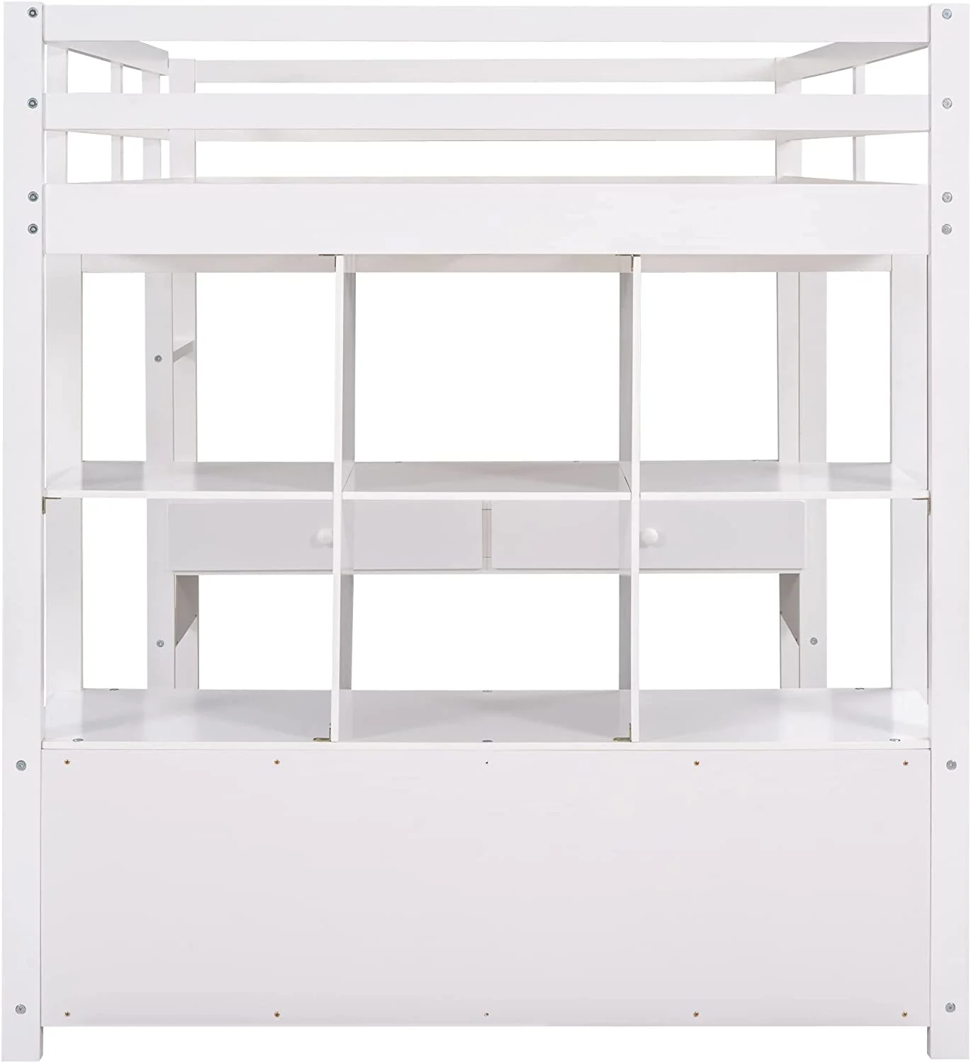 Full Size Wooden Loft Bed with Built-in Desk with Two Drawers, and Storage Shelves and Drawers For Kids White