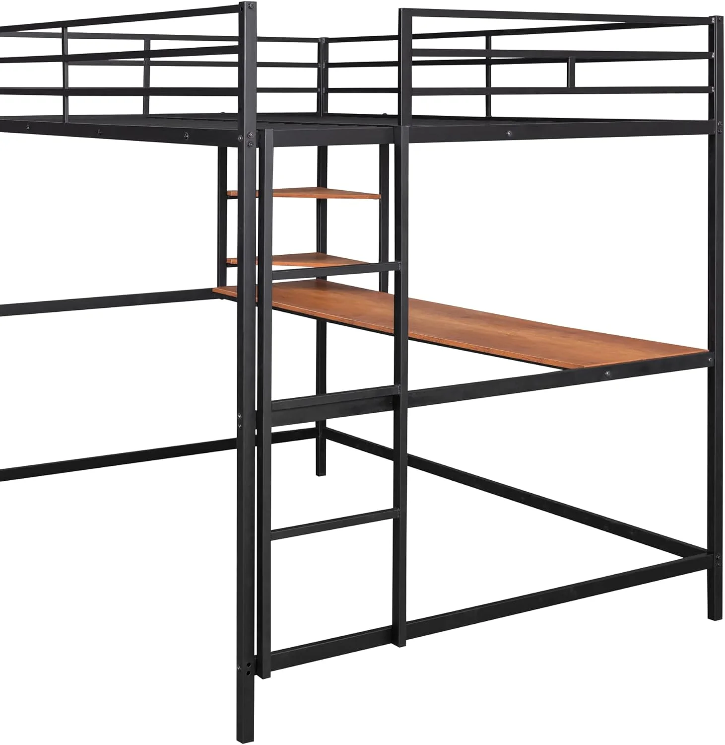 Full Size Metal Loft Bed With Long Desk, Shelves And Full Length Guardrails, Space-Saving Full Loft Bed For Bedroom, Black