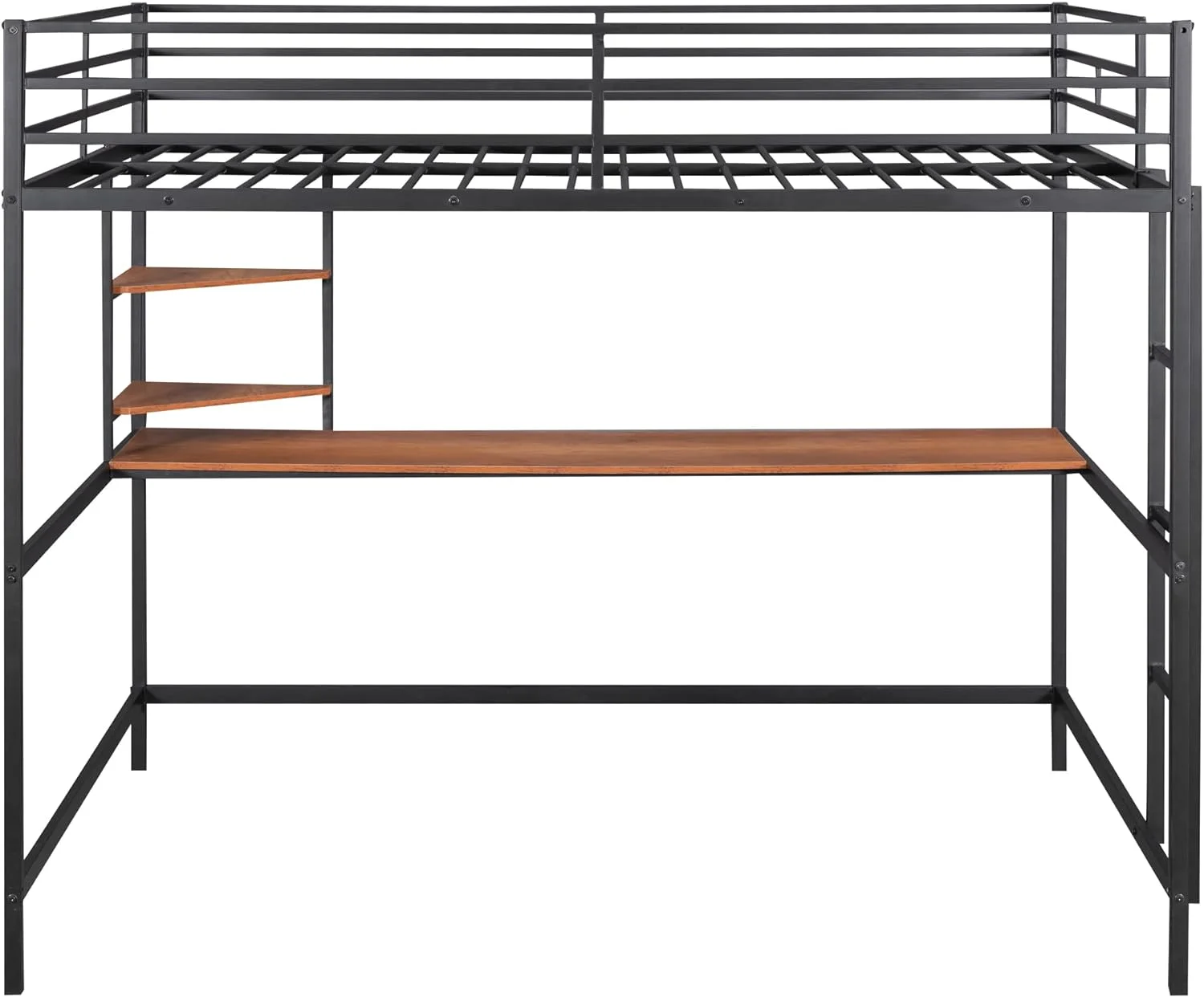 Loft Bed With Desk, Metal Size Loft Bed Frame With 2 Shelves, Bedroom Furniture, Black