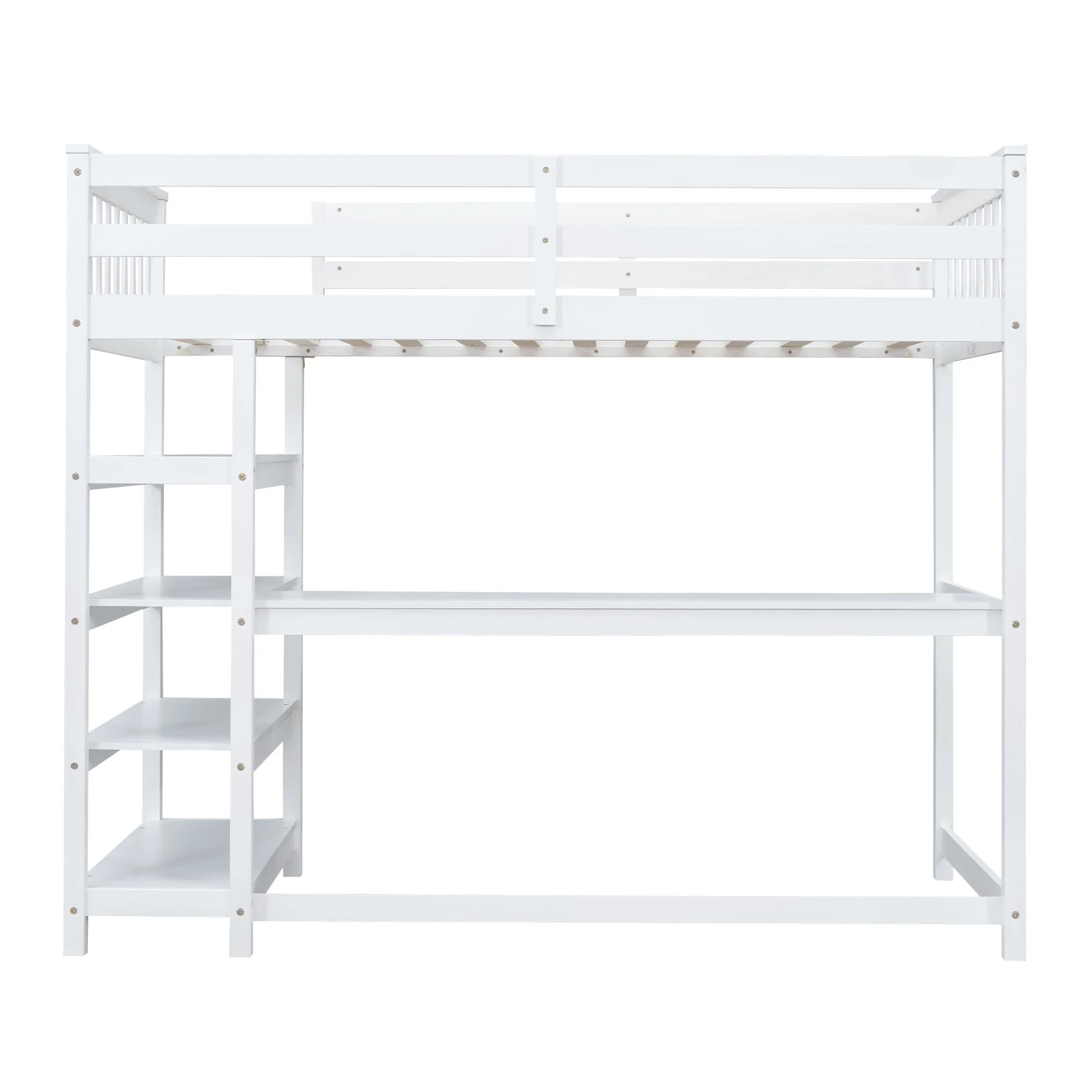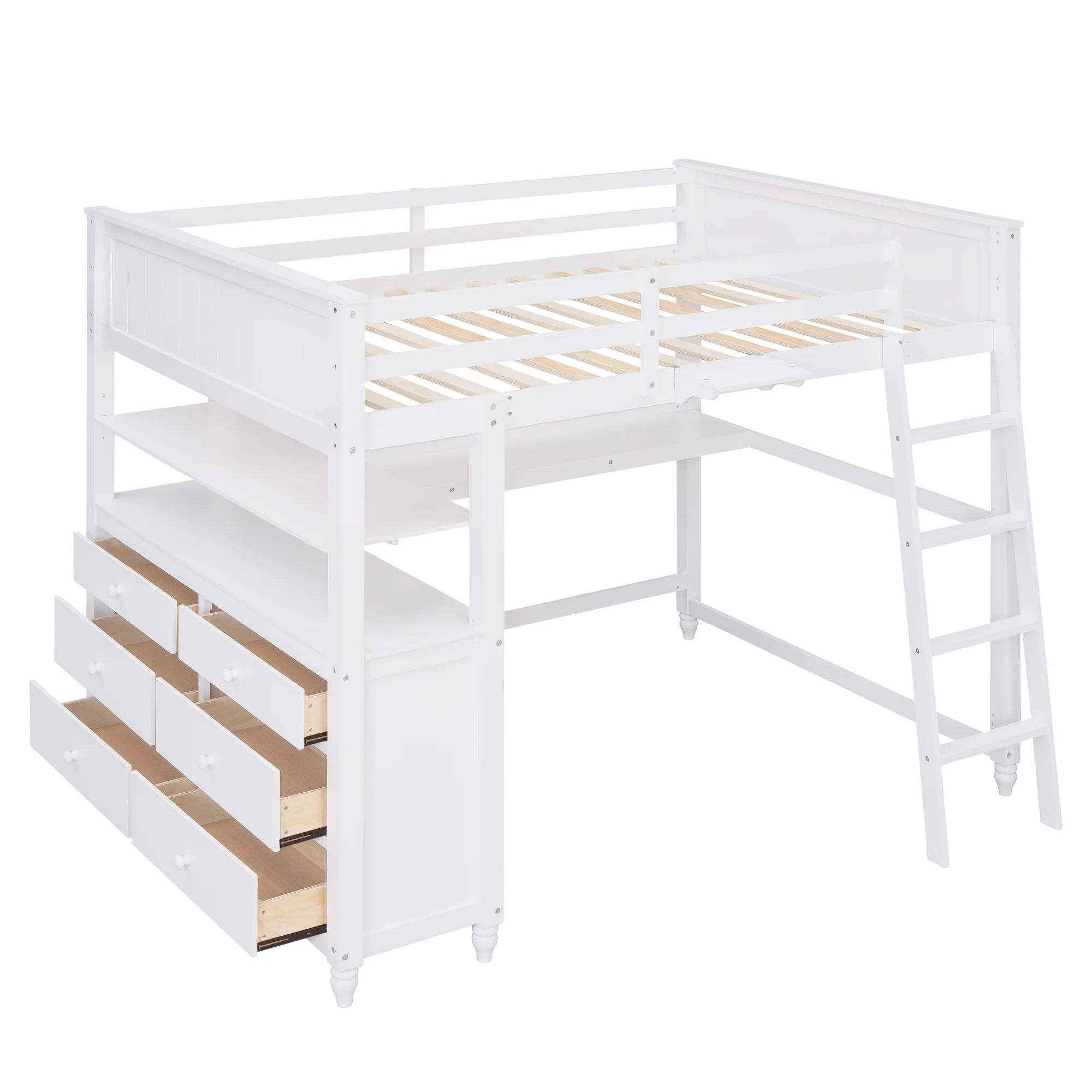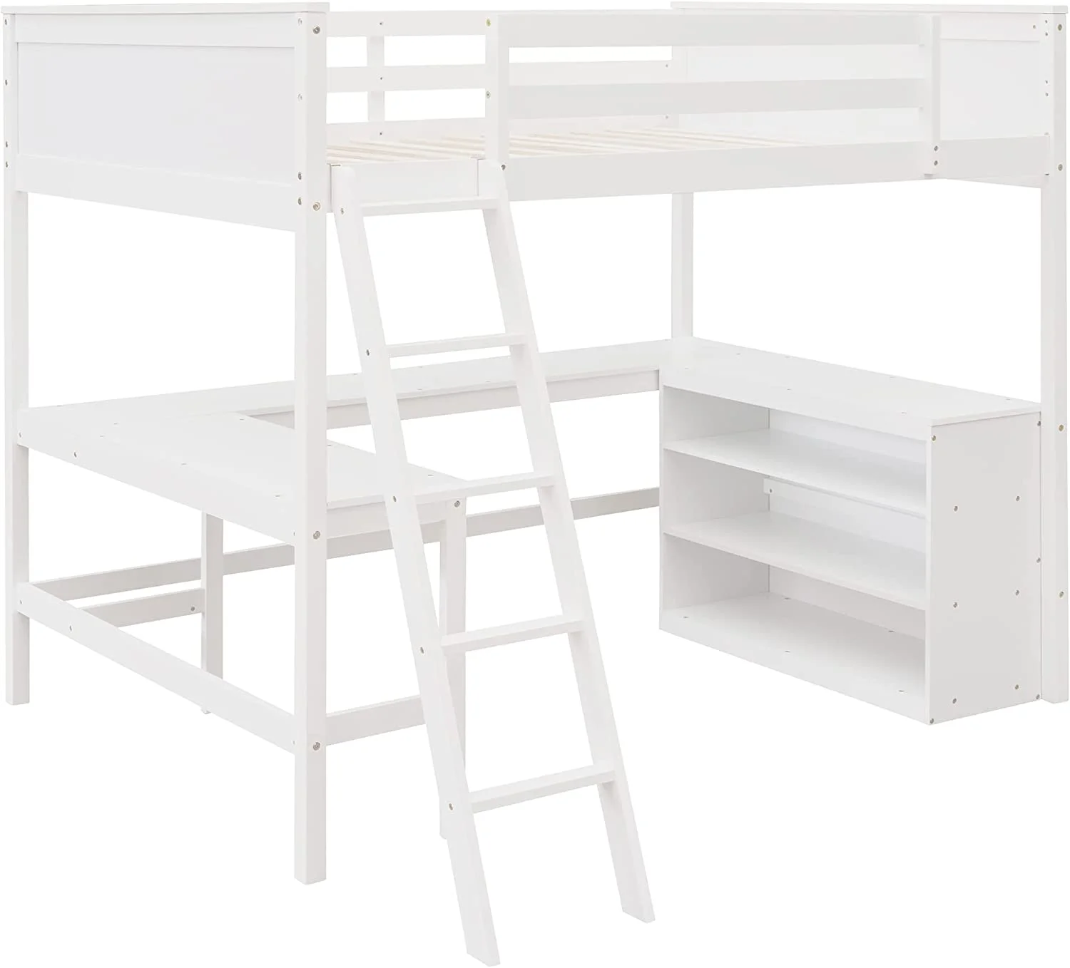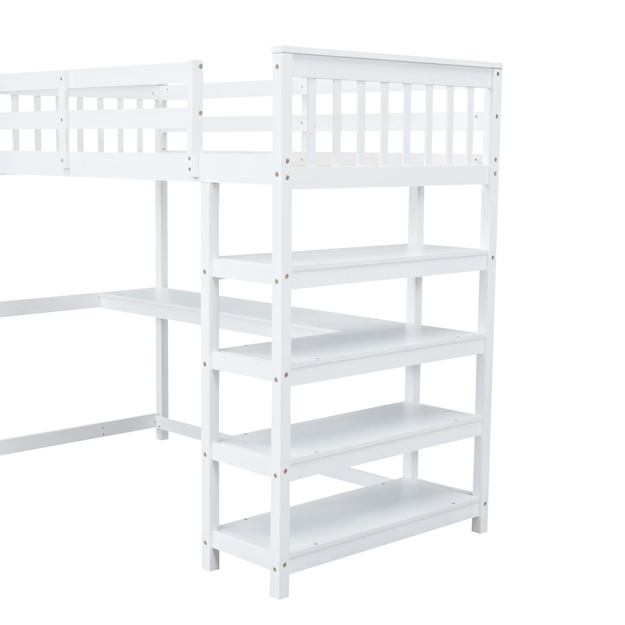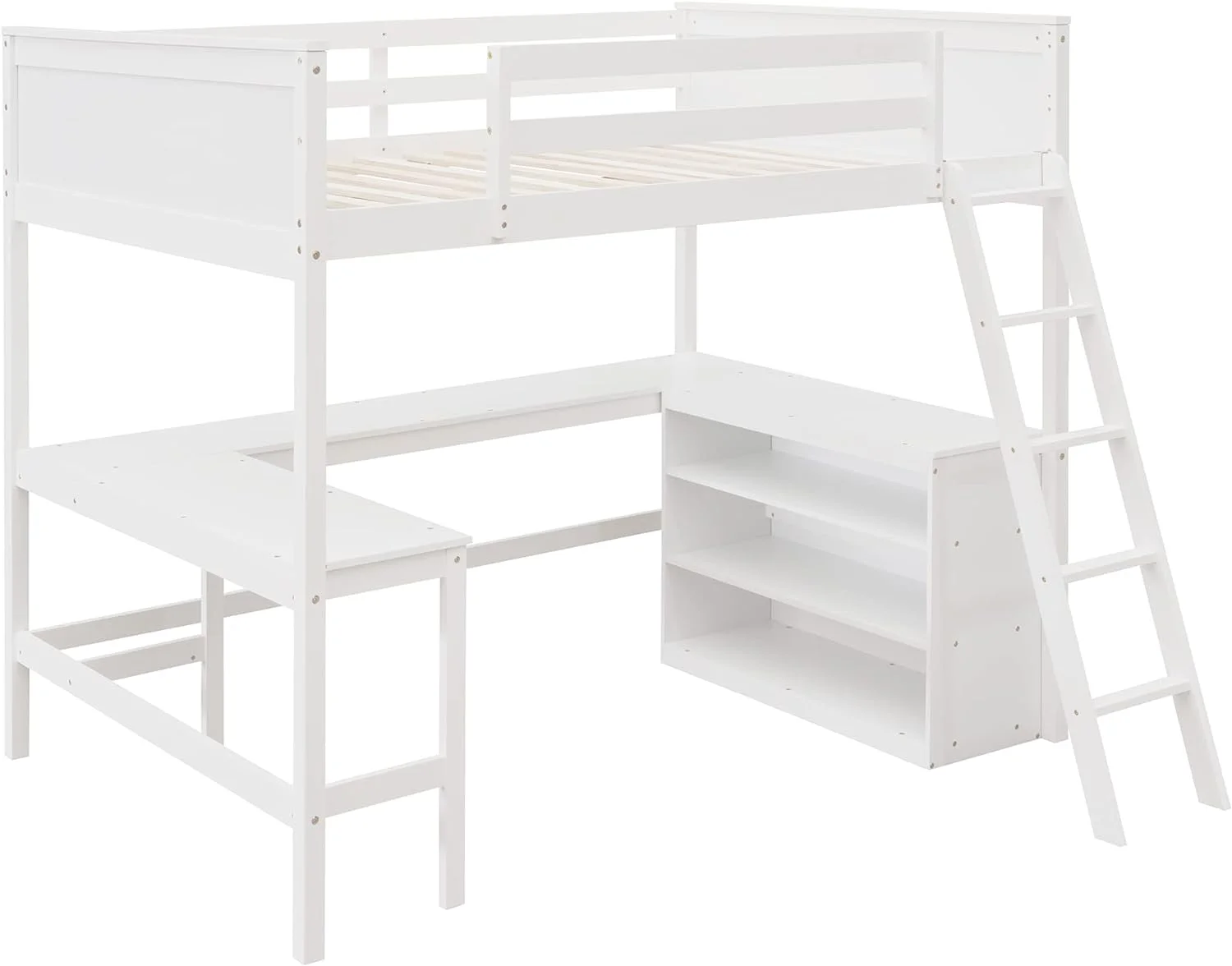 Full Size Loft Bed with Shelves and Desk, Wooden Full Loft Bed Frame with Desk, White