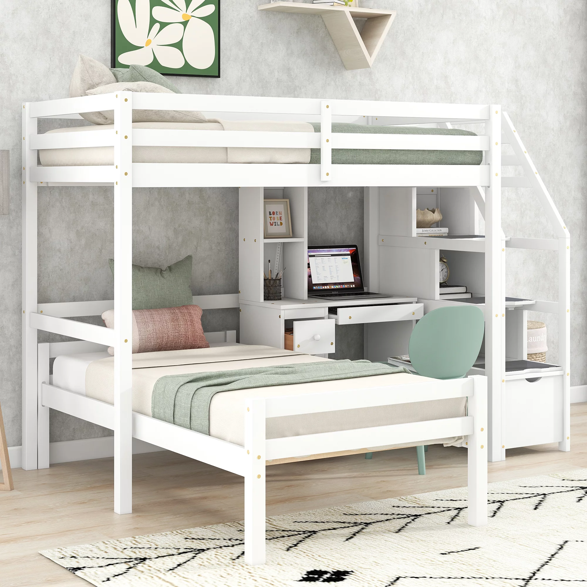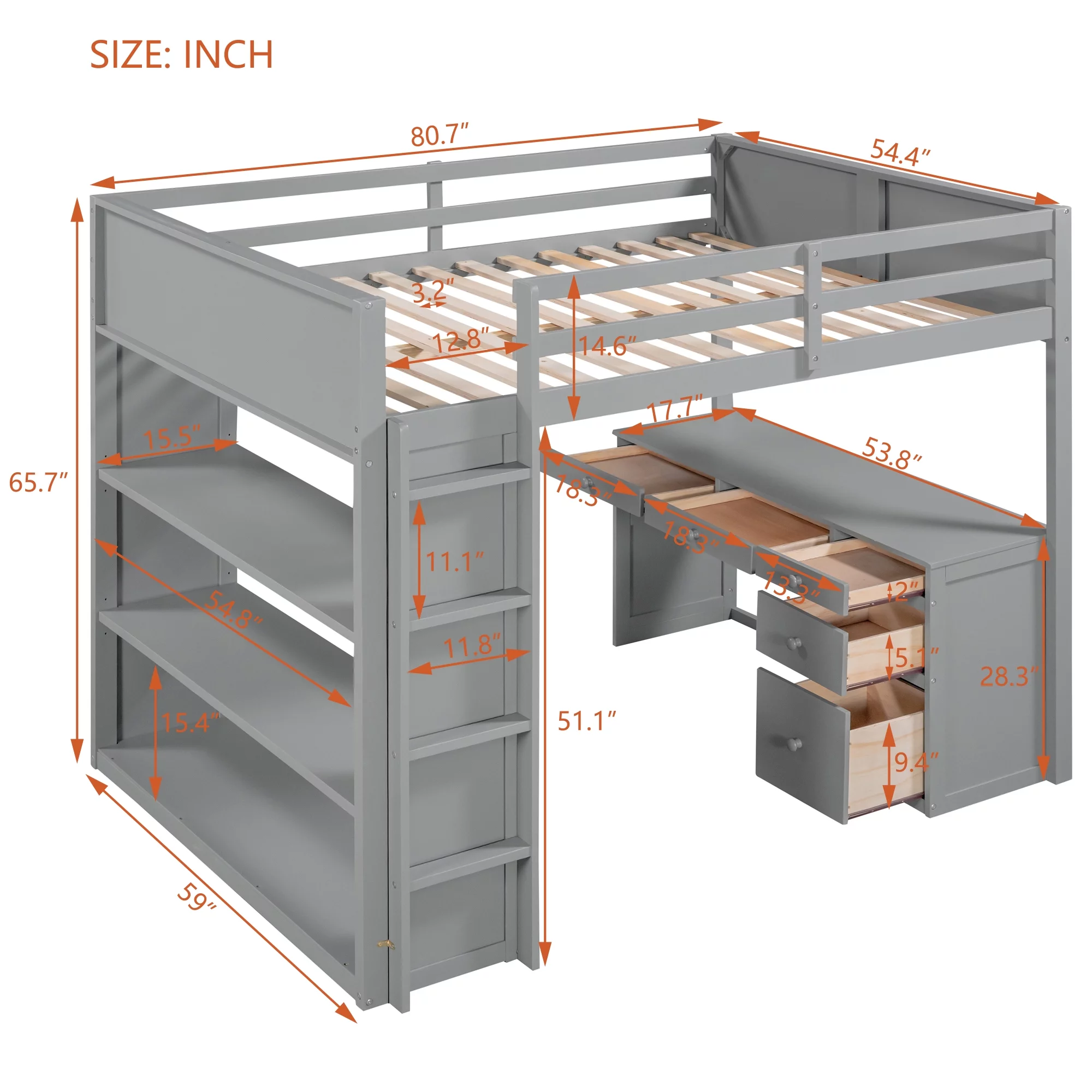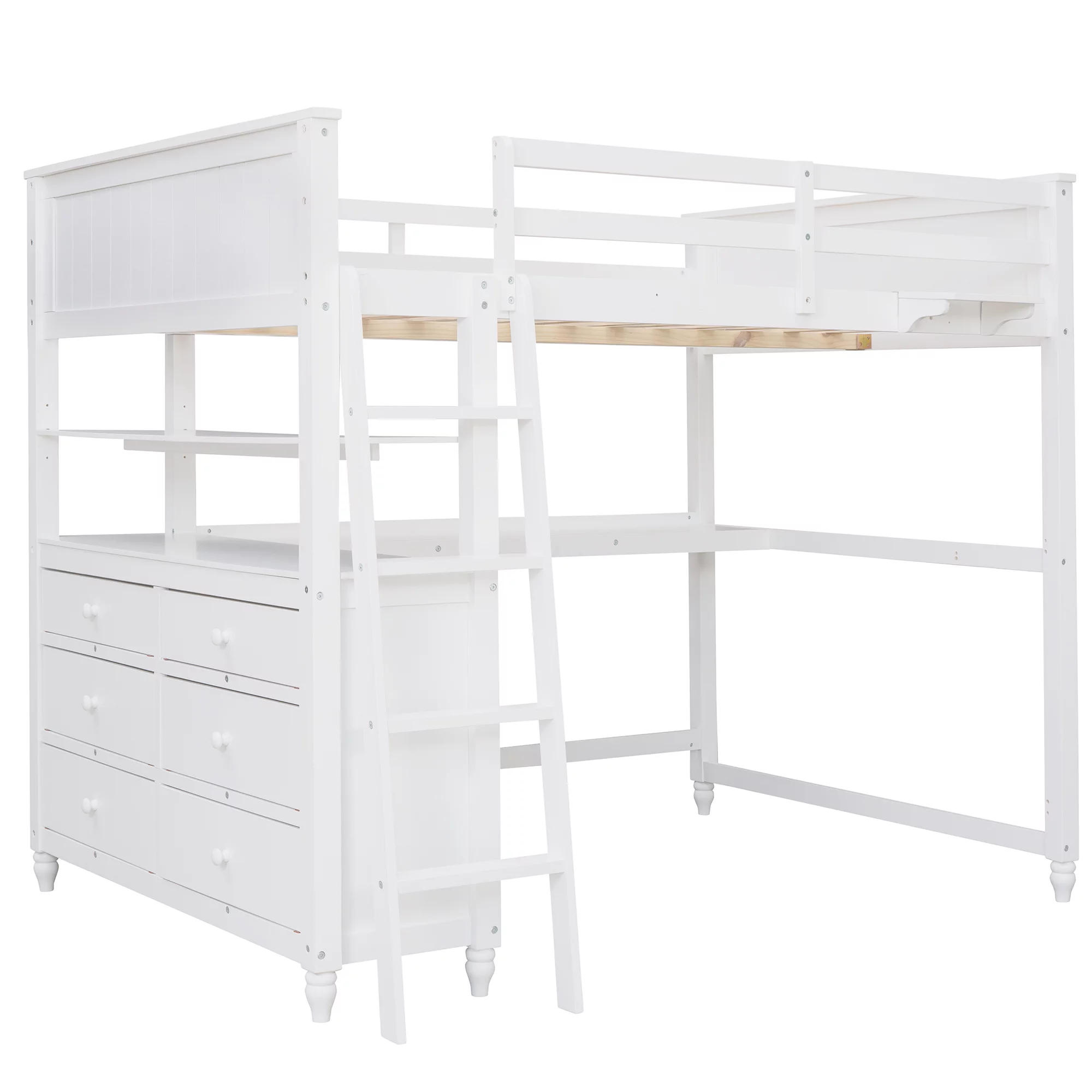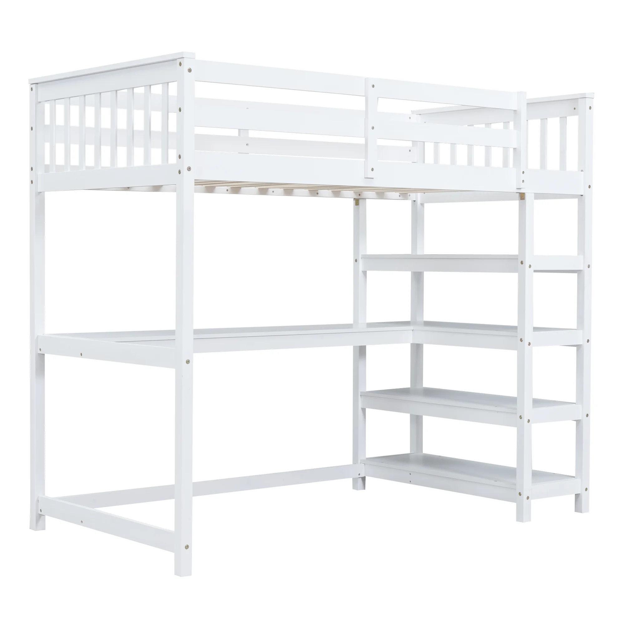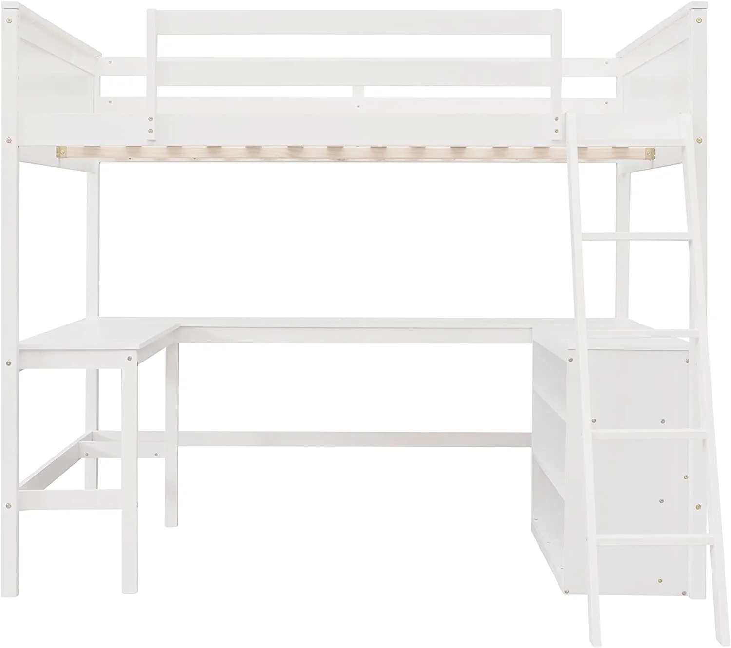 Full Size Loft Bed with Shelves and Desk, Wooden Full Loft Bed Frame with Desk, White