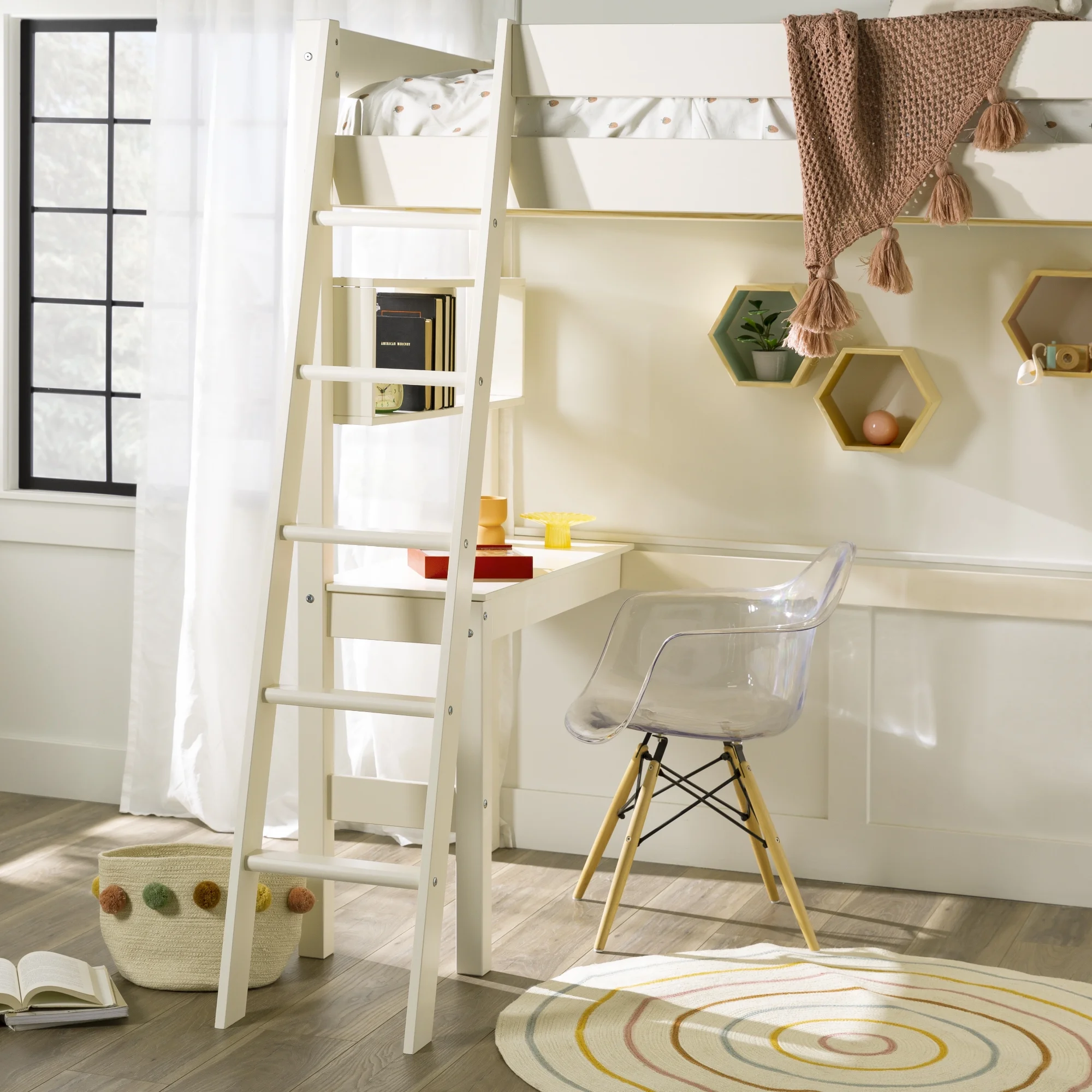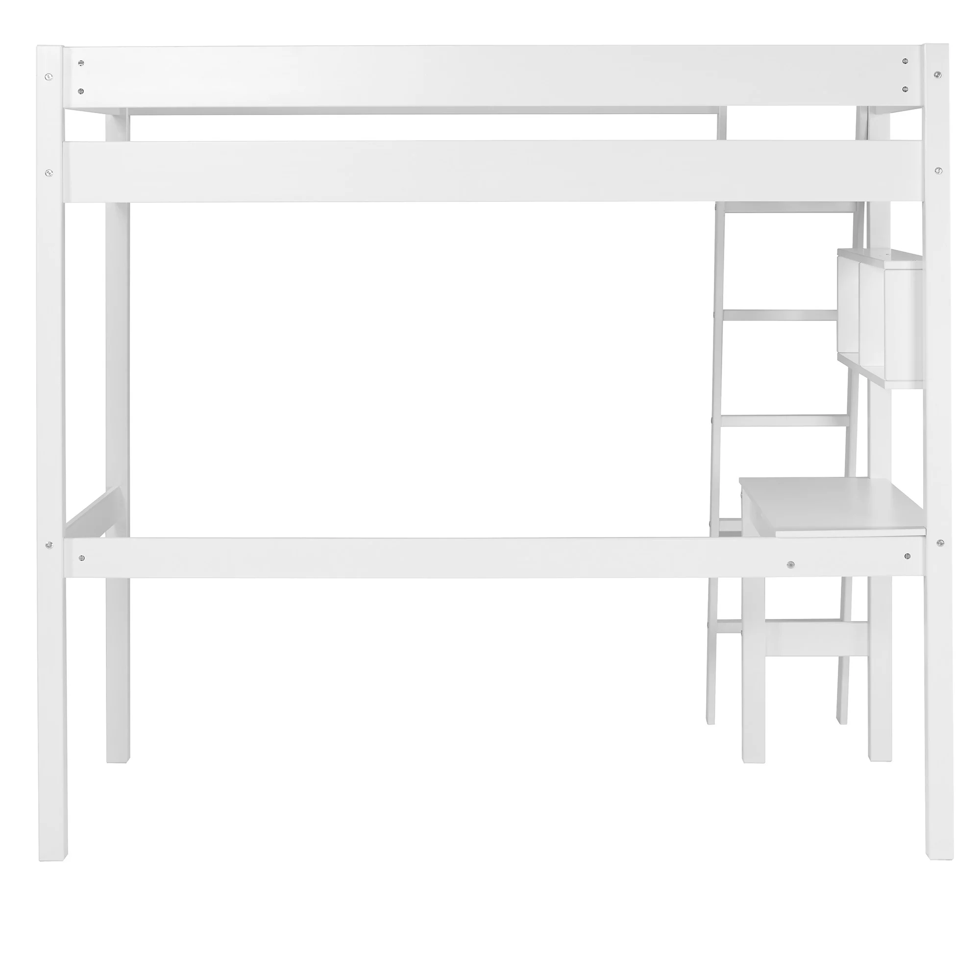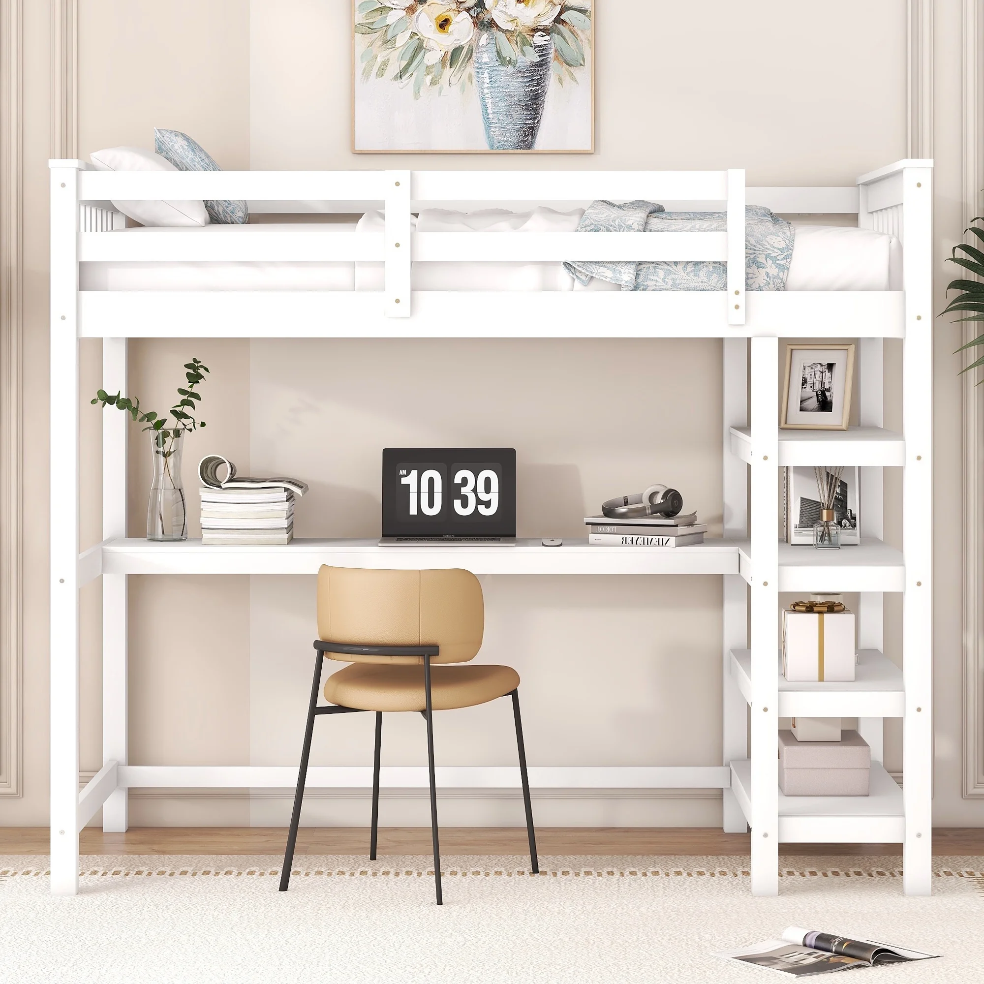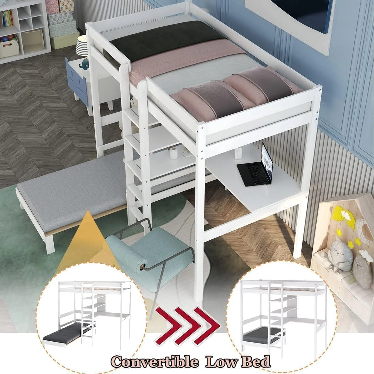 Twin Loft Bunk Bed with Desk White: Kids Loft Bed Wood Bed Frame with Ladder High Loft Beds for Teens