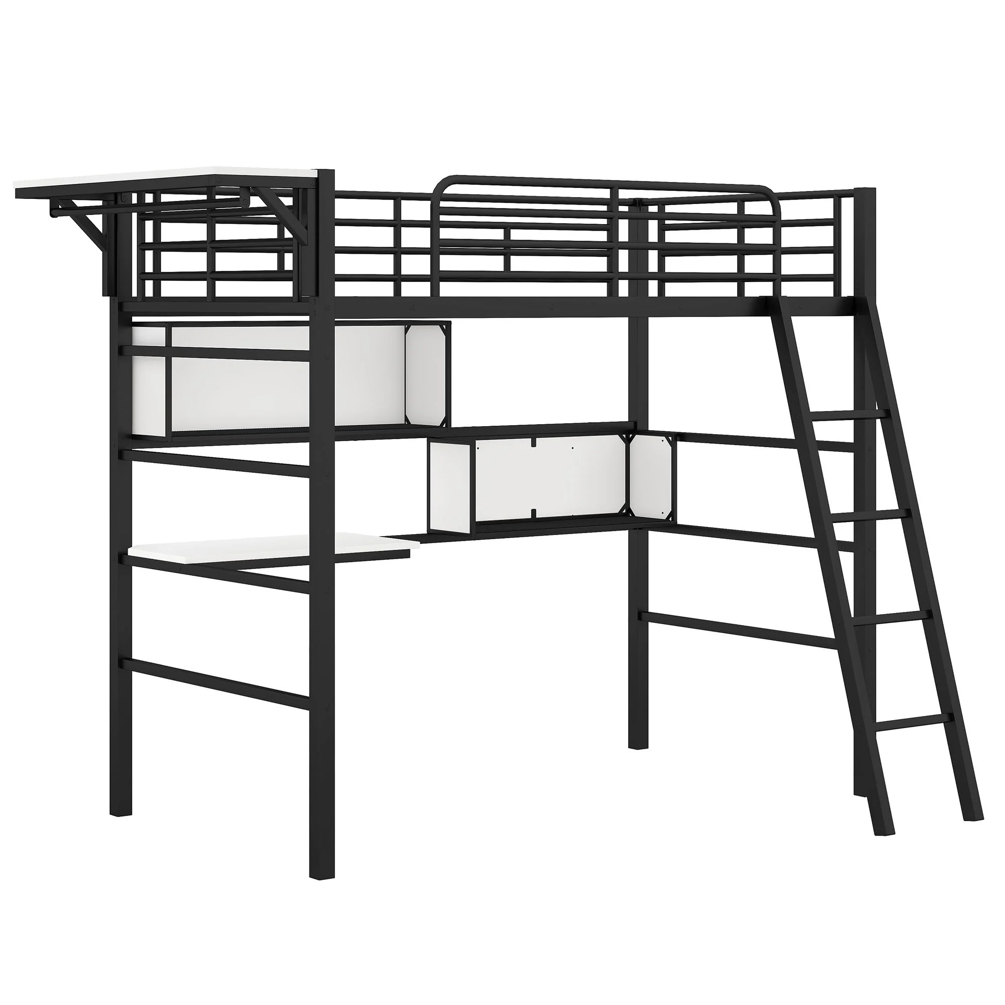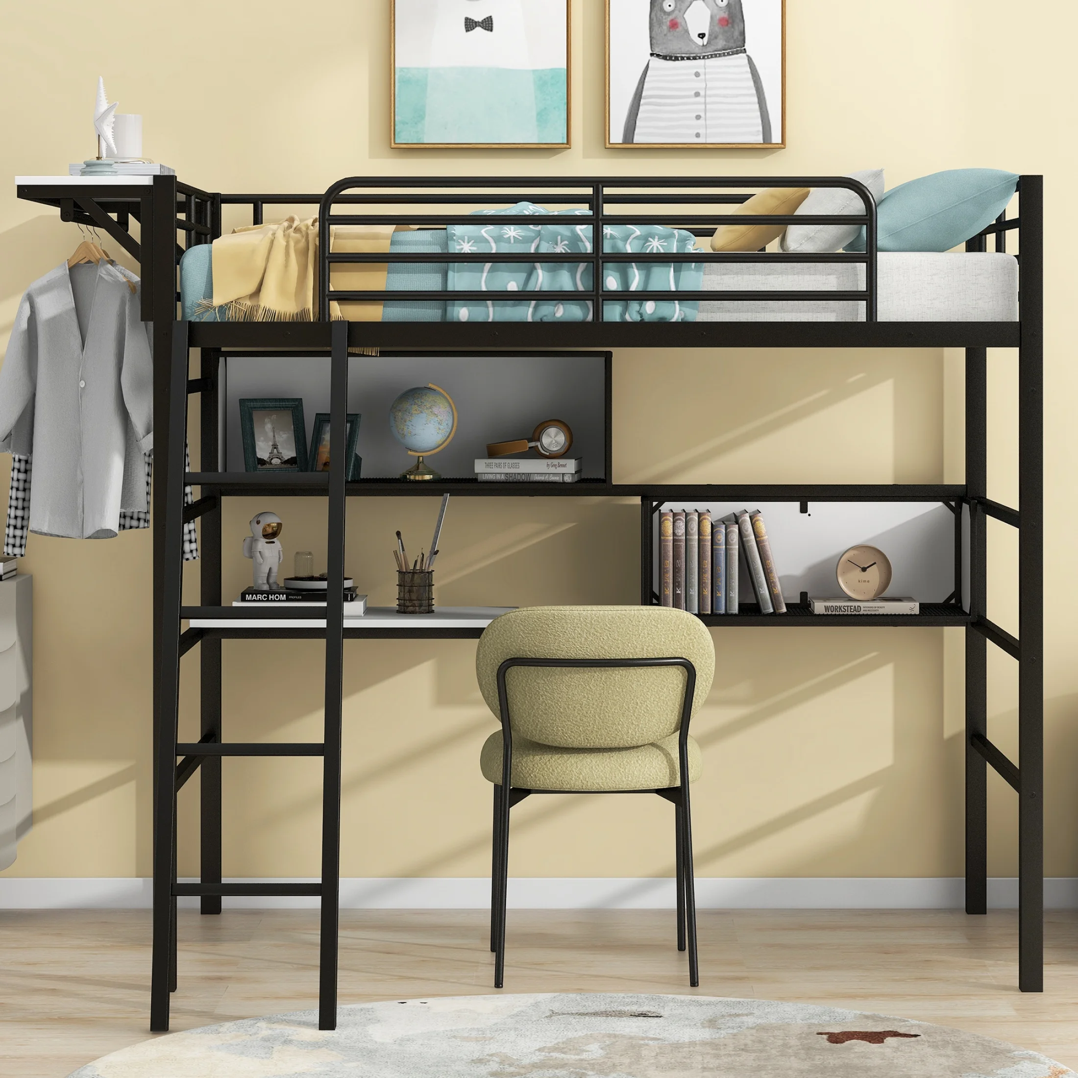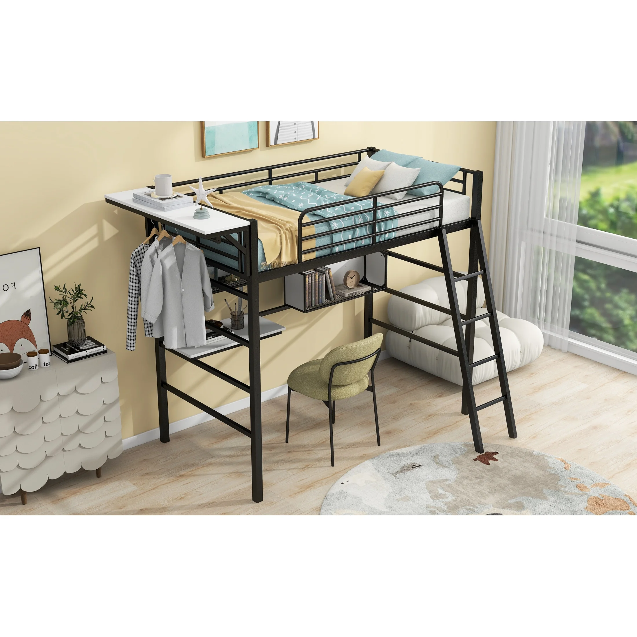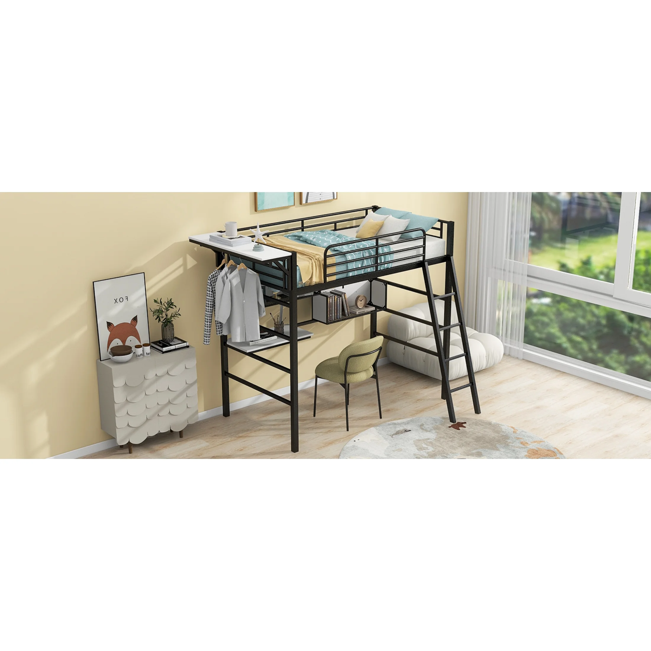 Twin Size Metal Loft Bed with 2 Shelves, a Desk and a Hanging Clothes Rack