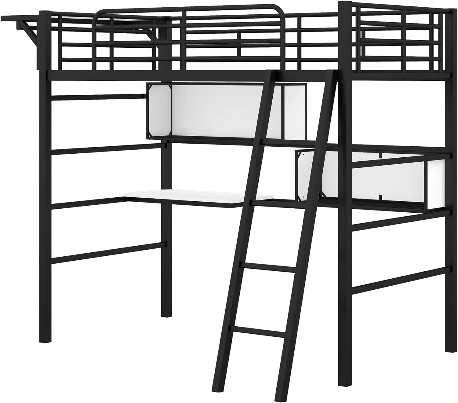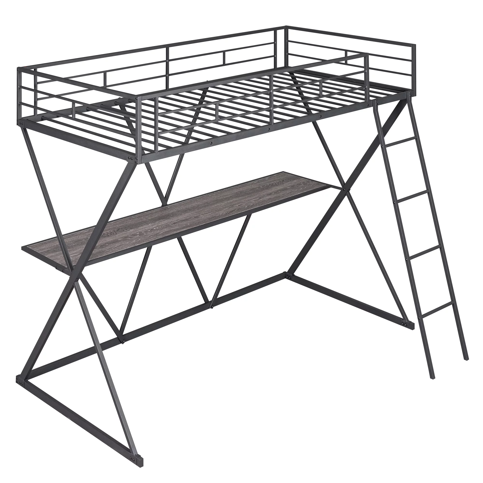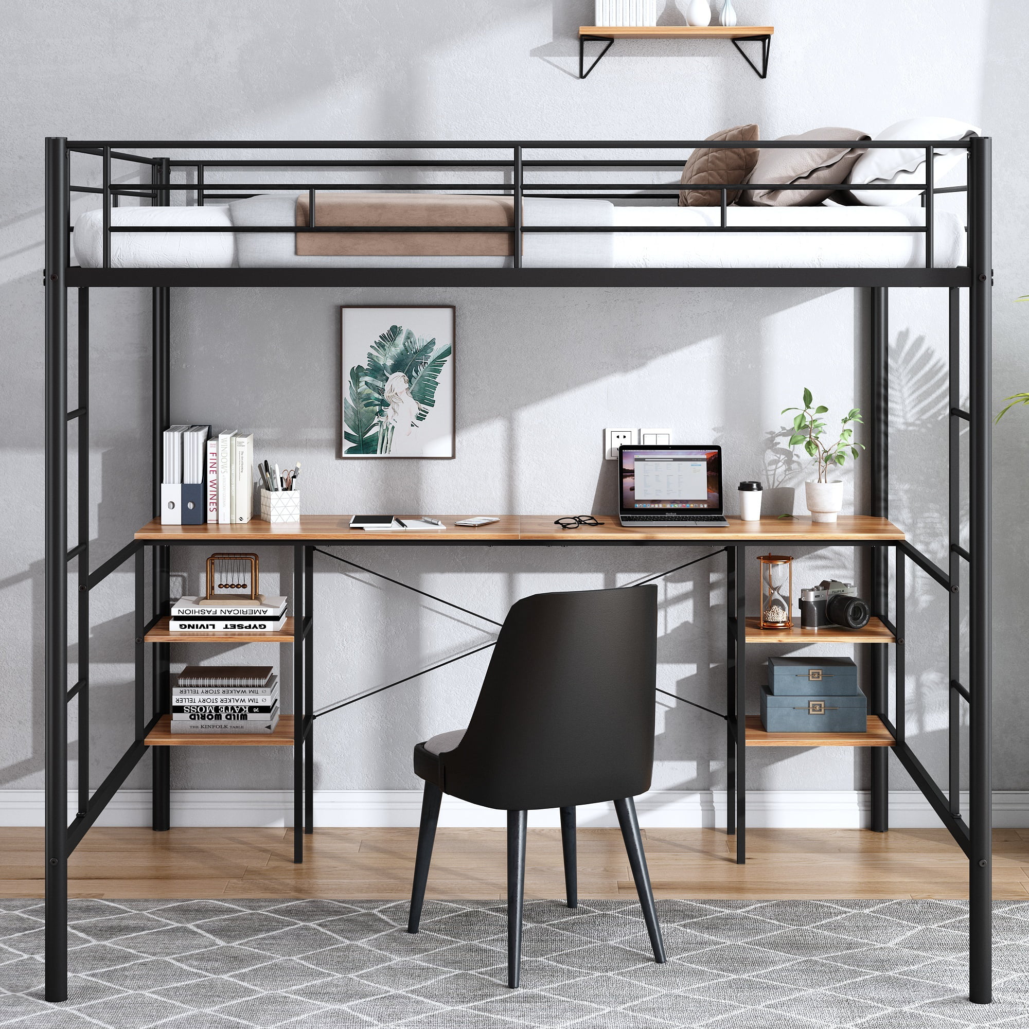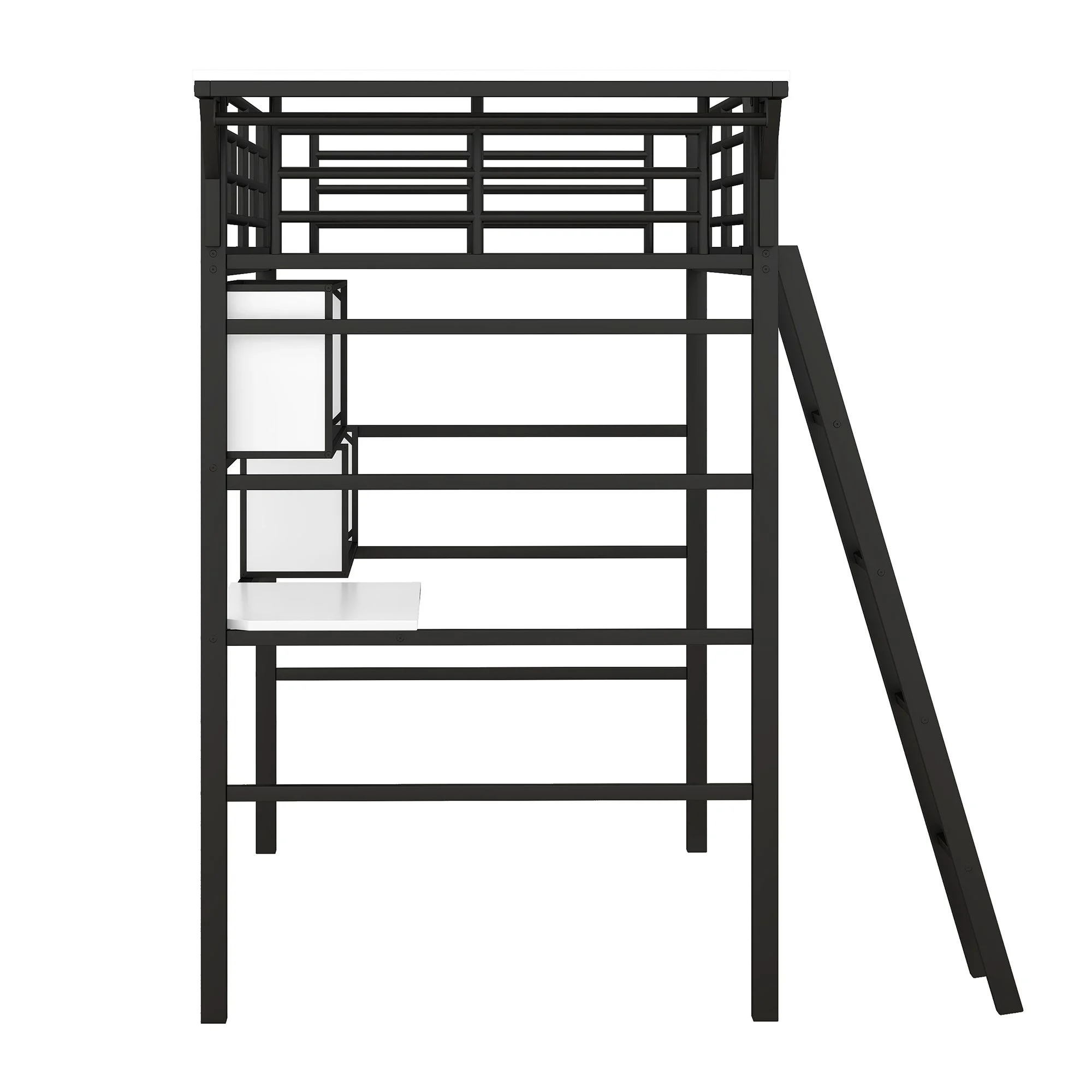Twin Size Metal Loft Bed with 2 Shelves, a Desk and a Hanging Clothes Rack