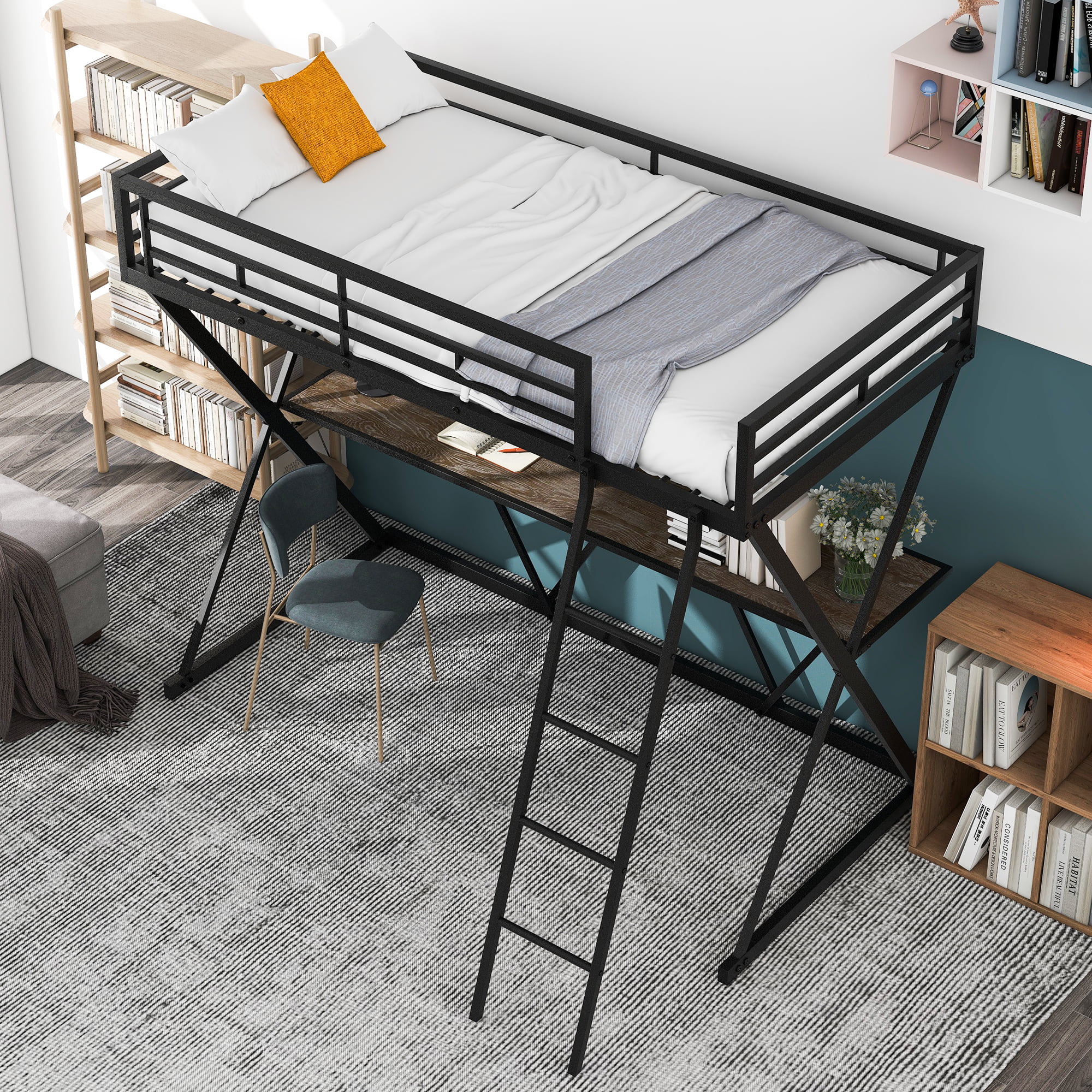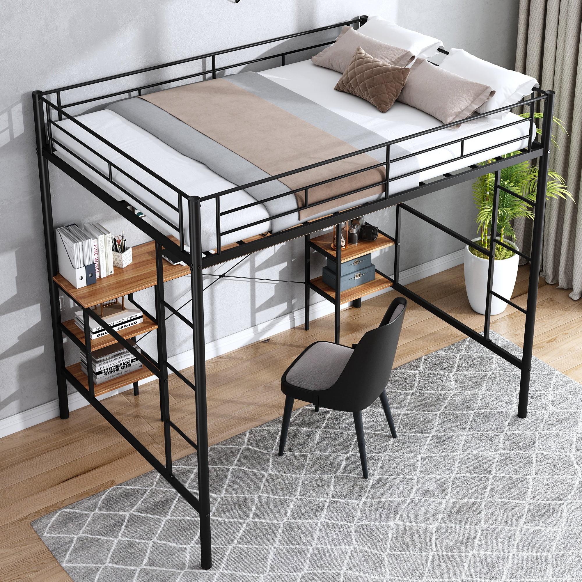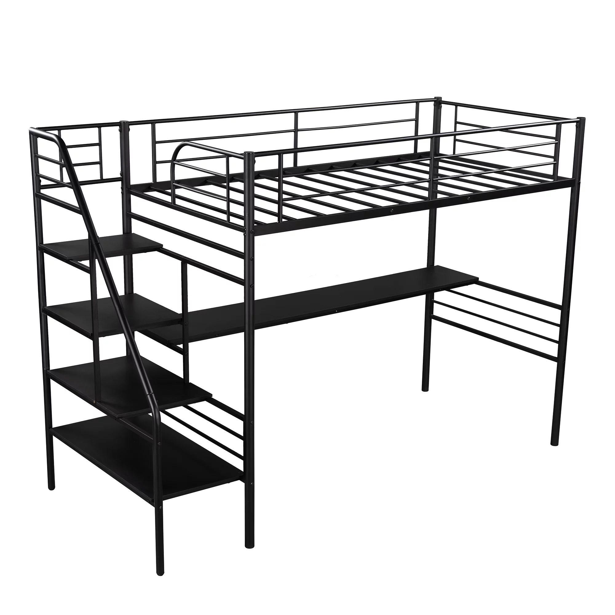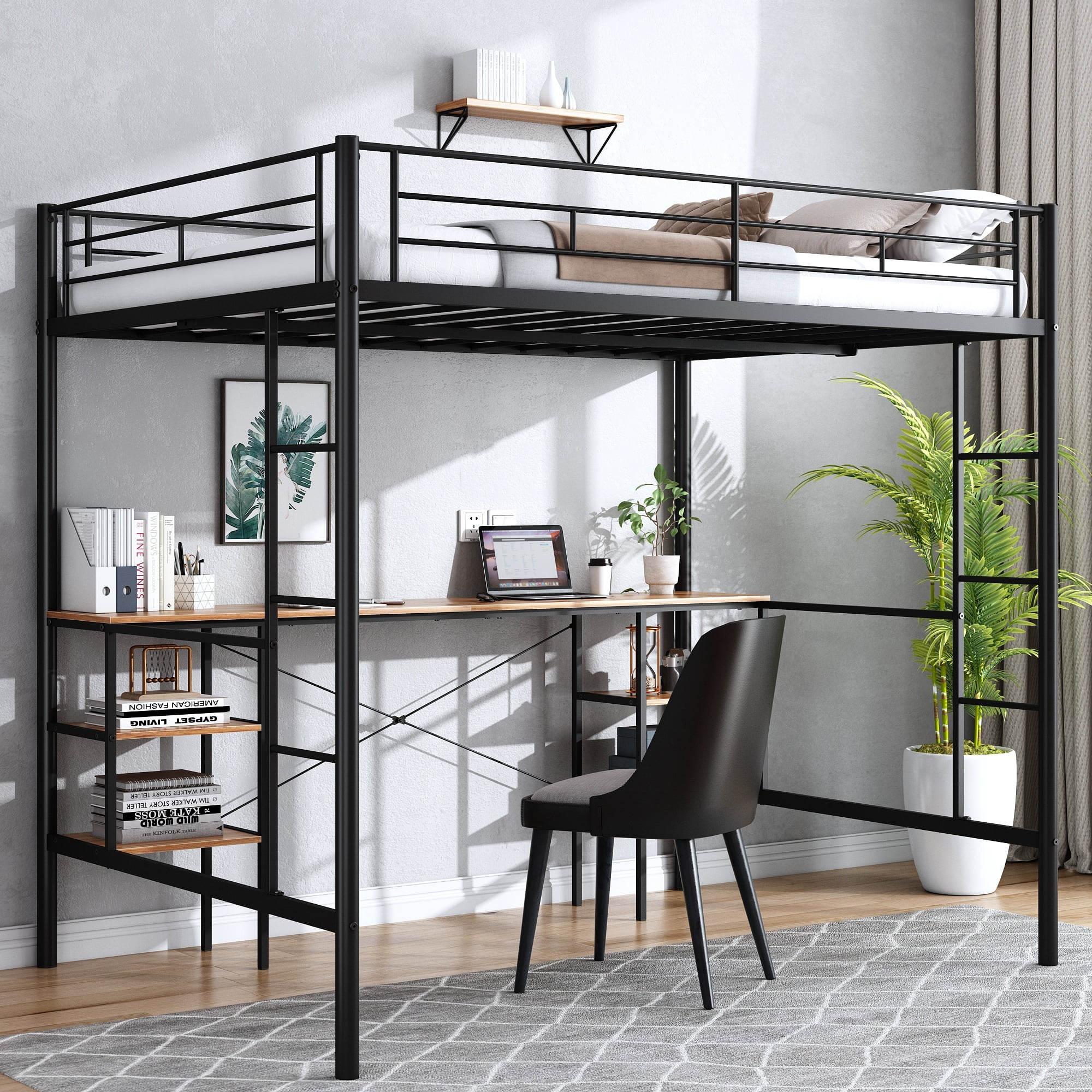 Twin Size Metal Loft Bed with 2 Shelves, a Desk and a Hanging Clothes Rack