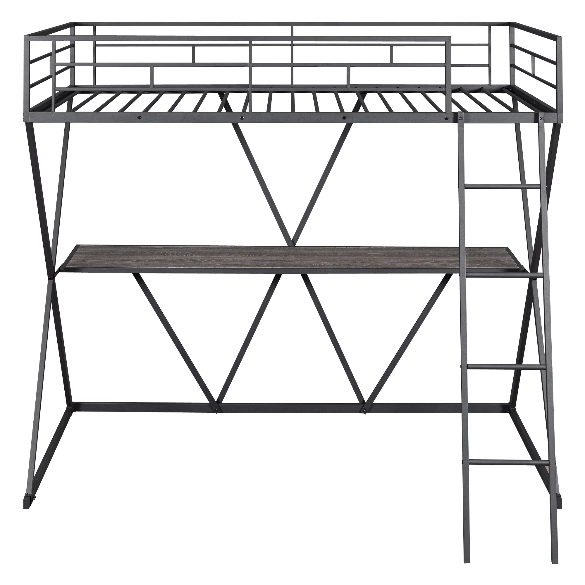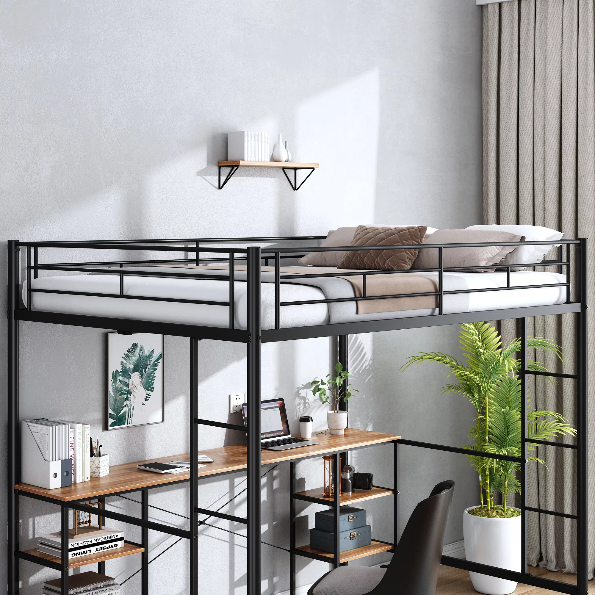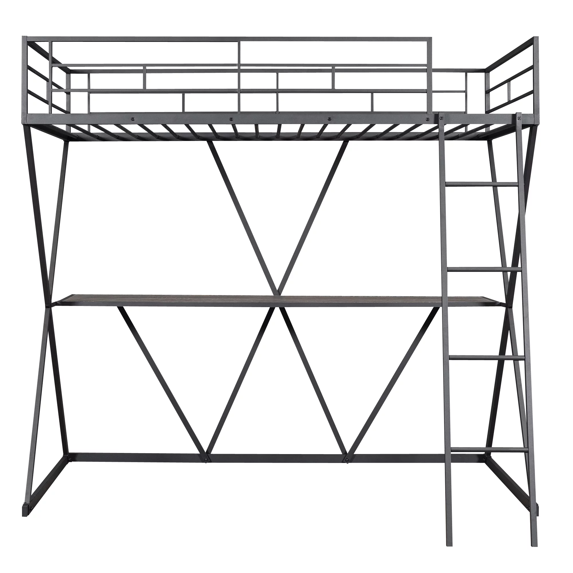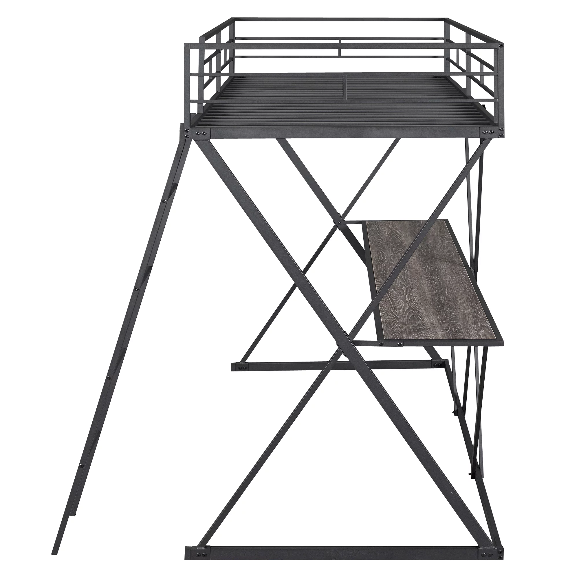 Twin Size Metal Loft Bed with 2 Shelves, a Desk and a Hanging Clothes Rack