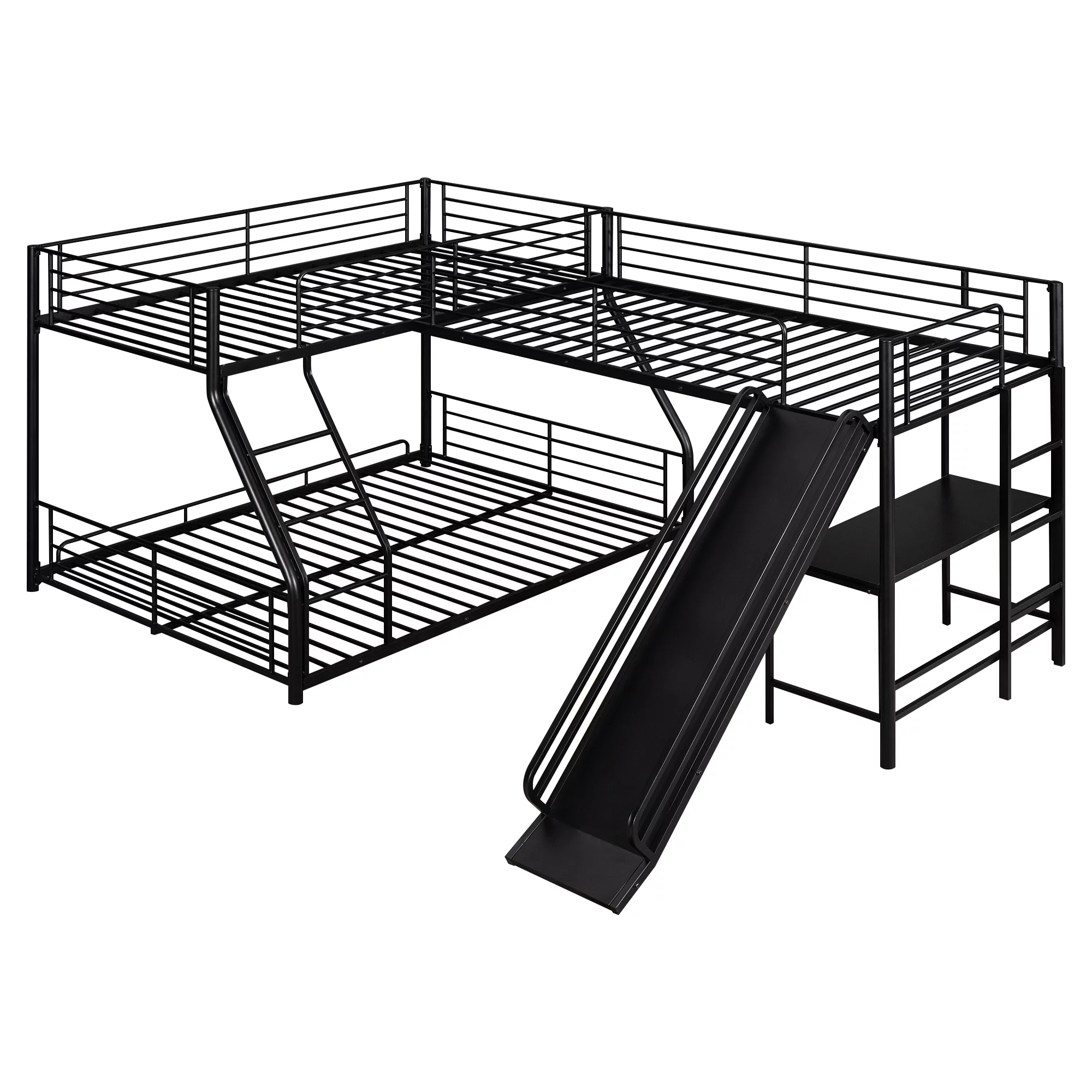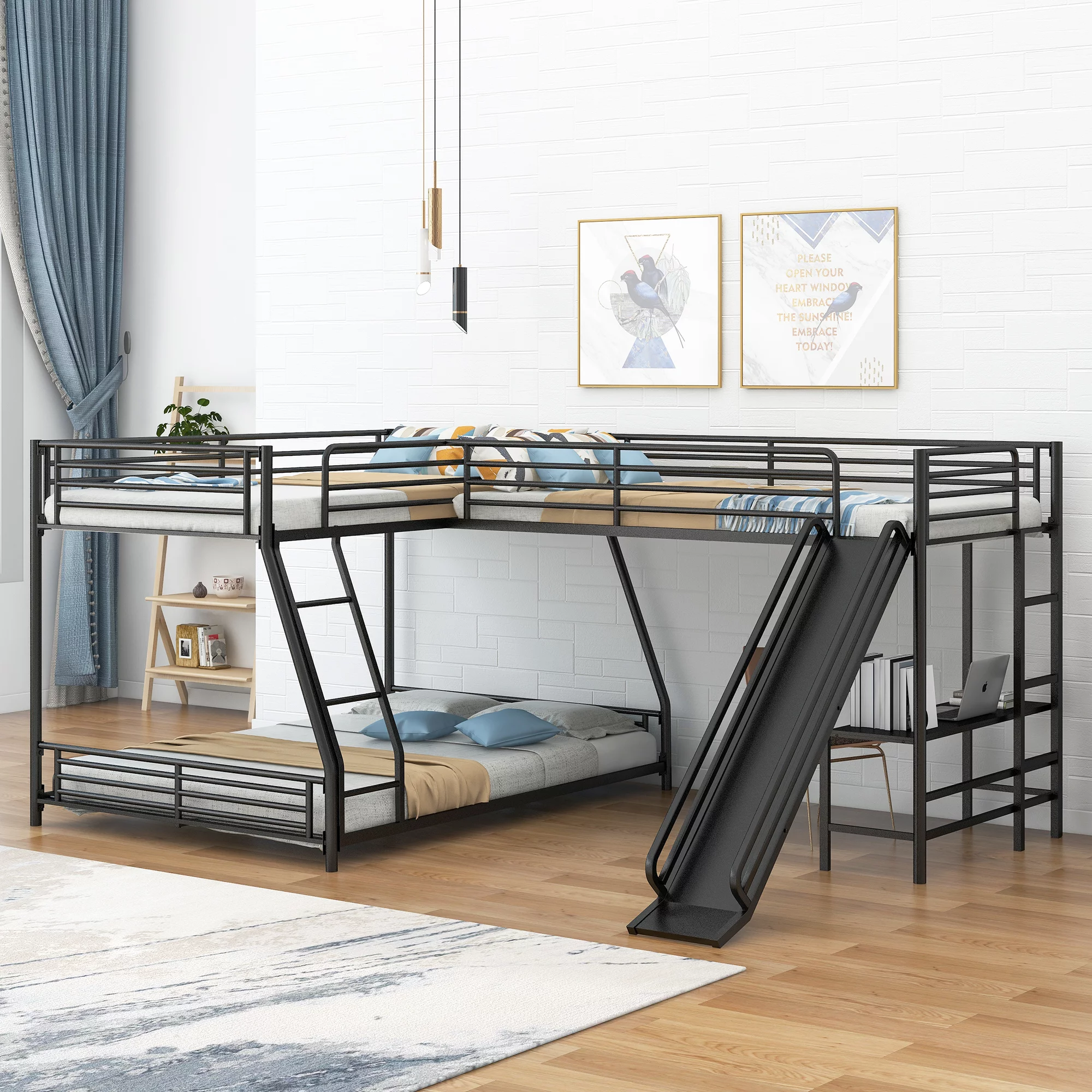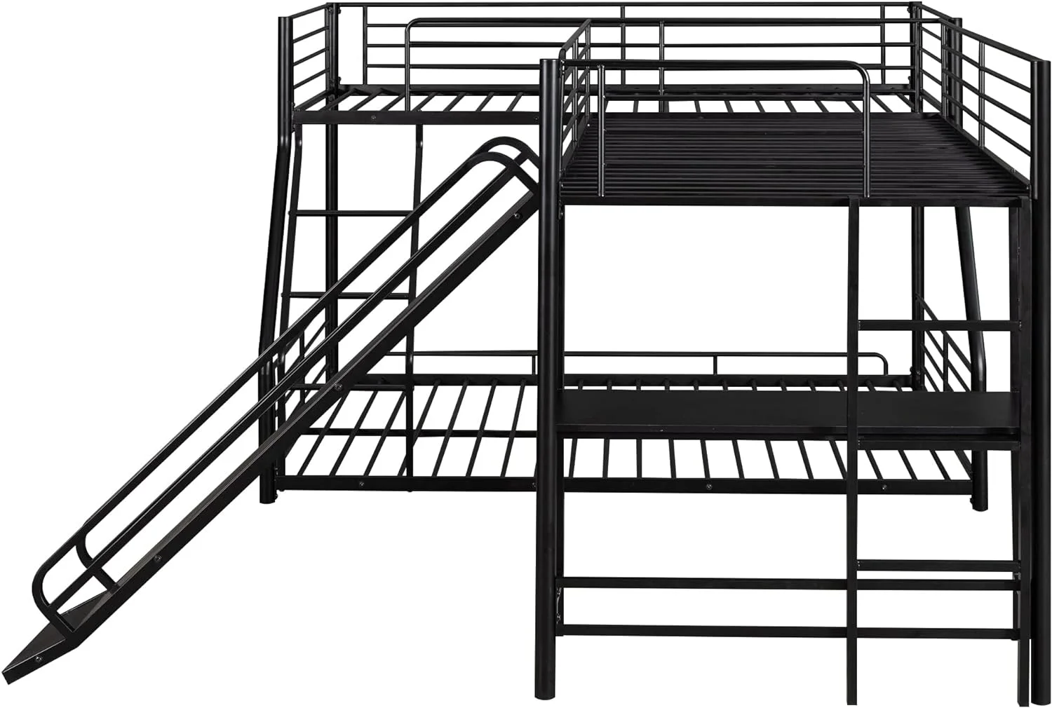 Euroco Metal L-Shaped Twin over Full Bunk and Twin Loft Bed with Desk and Slide for Kids Teens Adults, 3 Beds in 1, Black