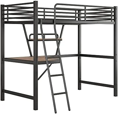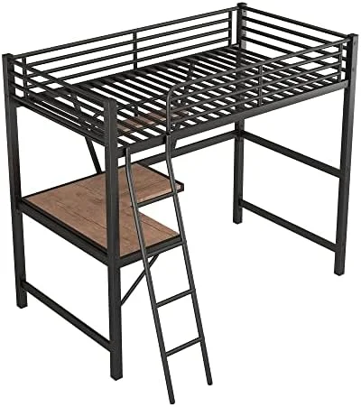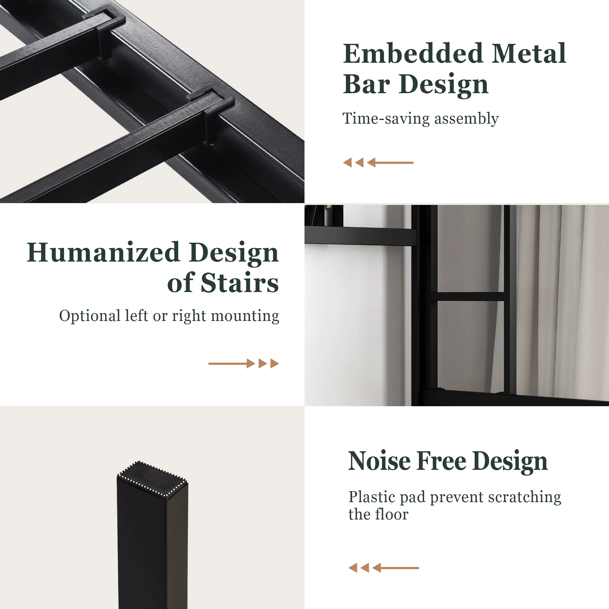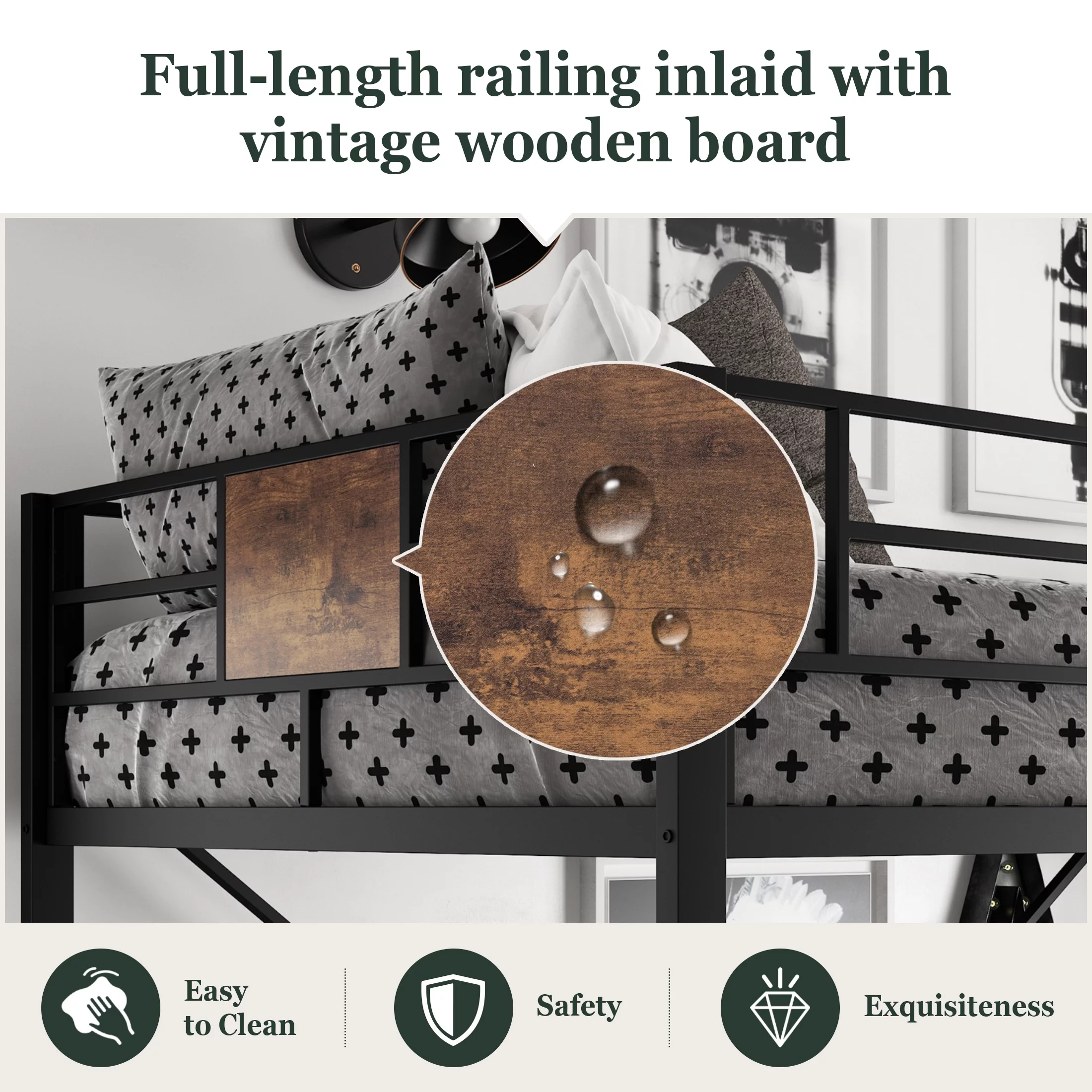 Amolife Metal Twin Size Loft Bed Frame with Stairs & Full-Length Guardrail, Rustic Wood, Black Frame (Desk not included)