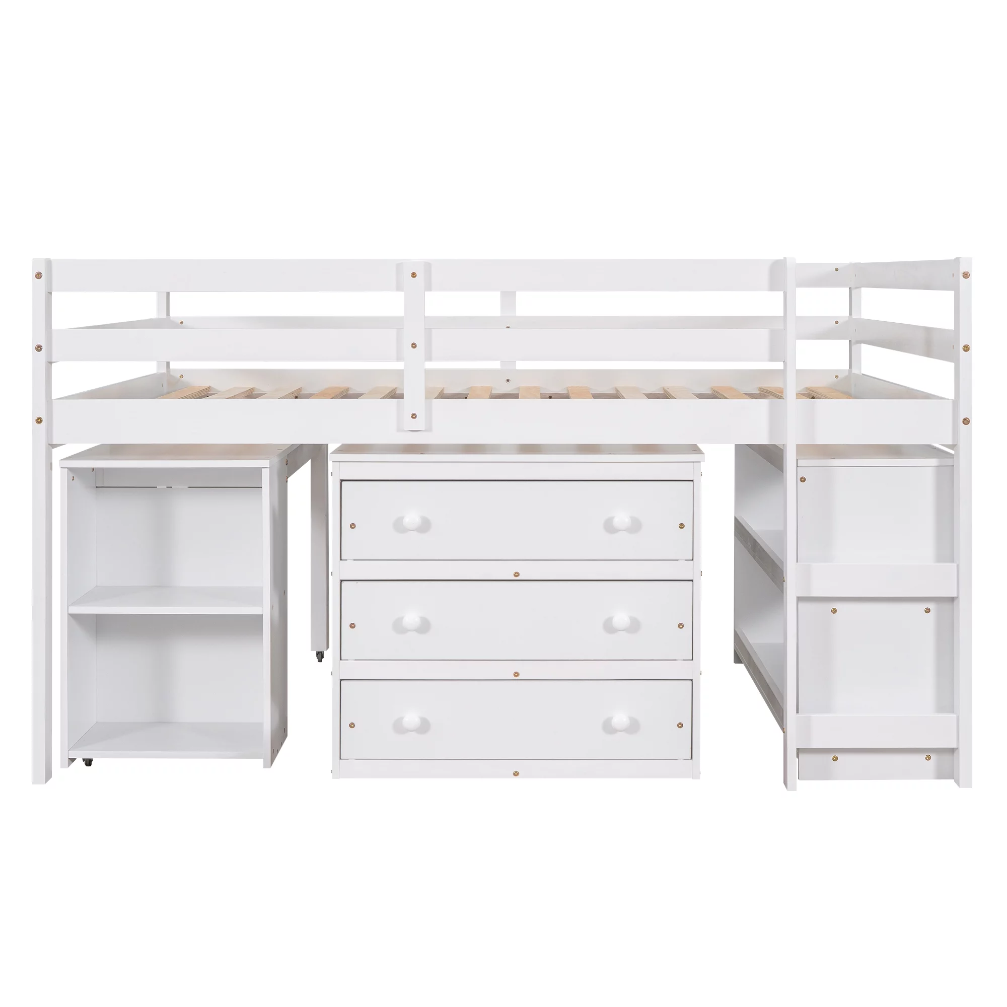 Low Study Full Loft Bed with Cabinet ,Shelves and Rolling Portable Desk ,Multiple Functions Bed- White