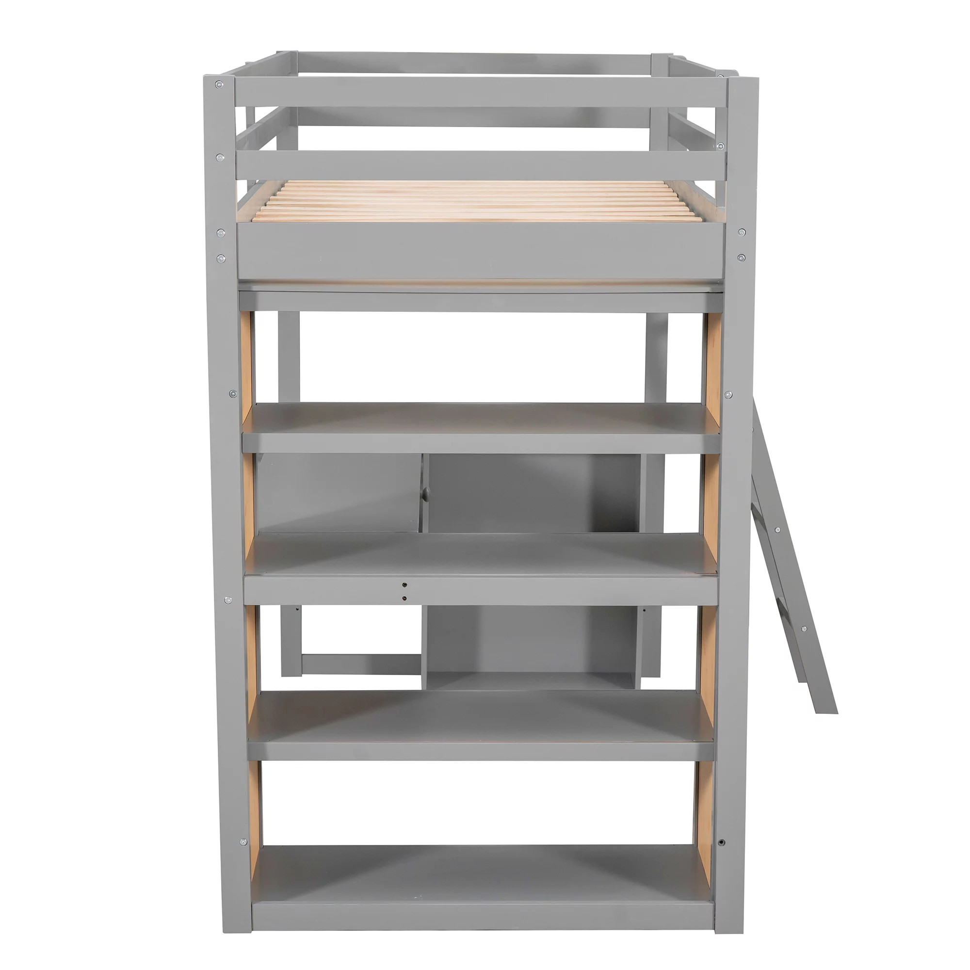 Euroco Wood Twin over Twin Bunk Bed with Desk and Slide, 4 Drawers and Shelf, Bookcase and Storage Staircase for Kids, Gray