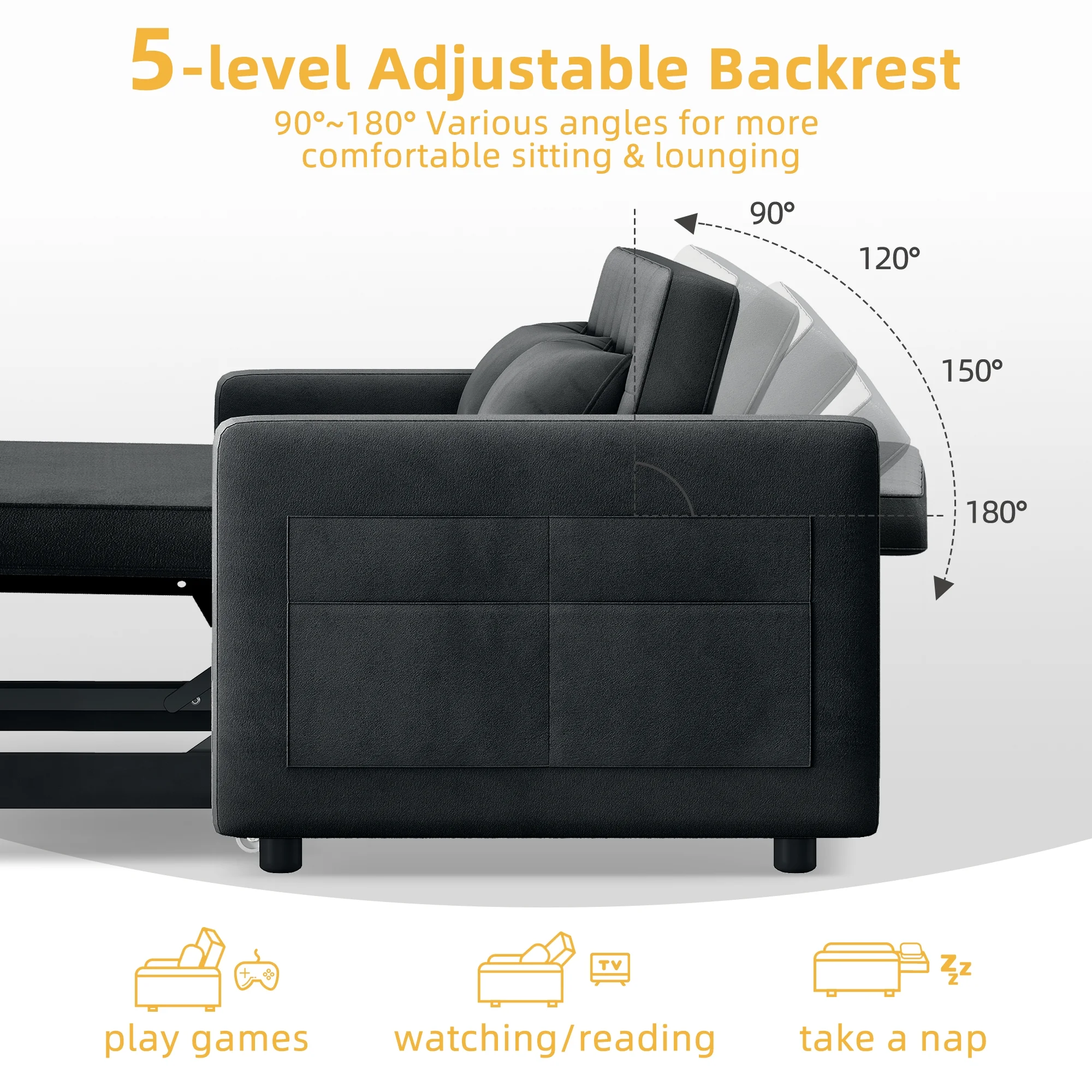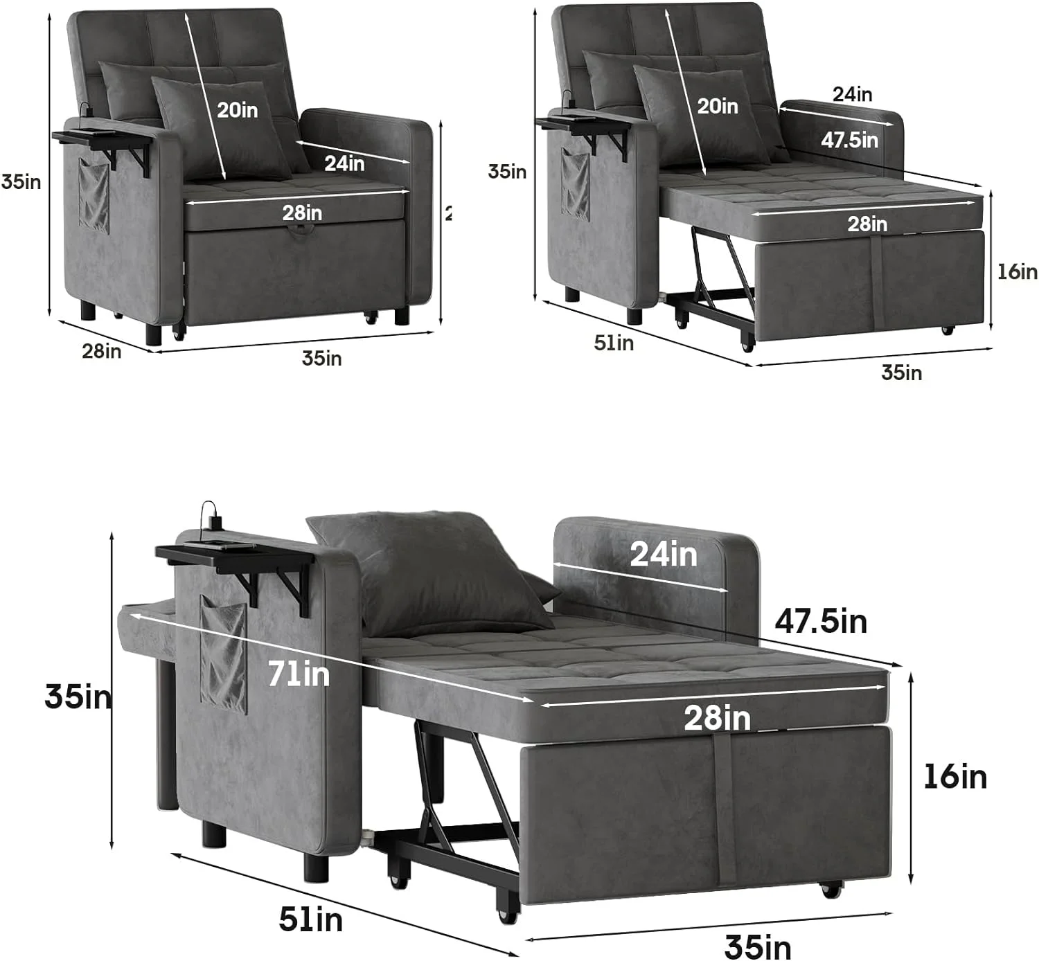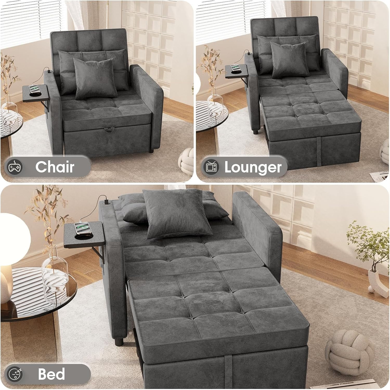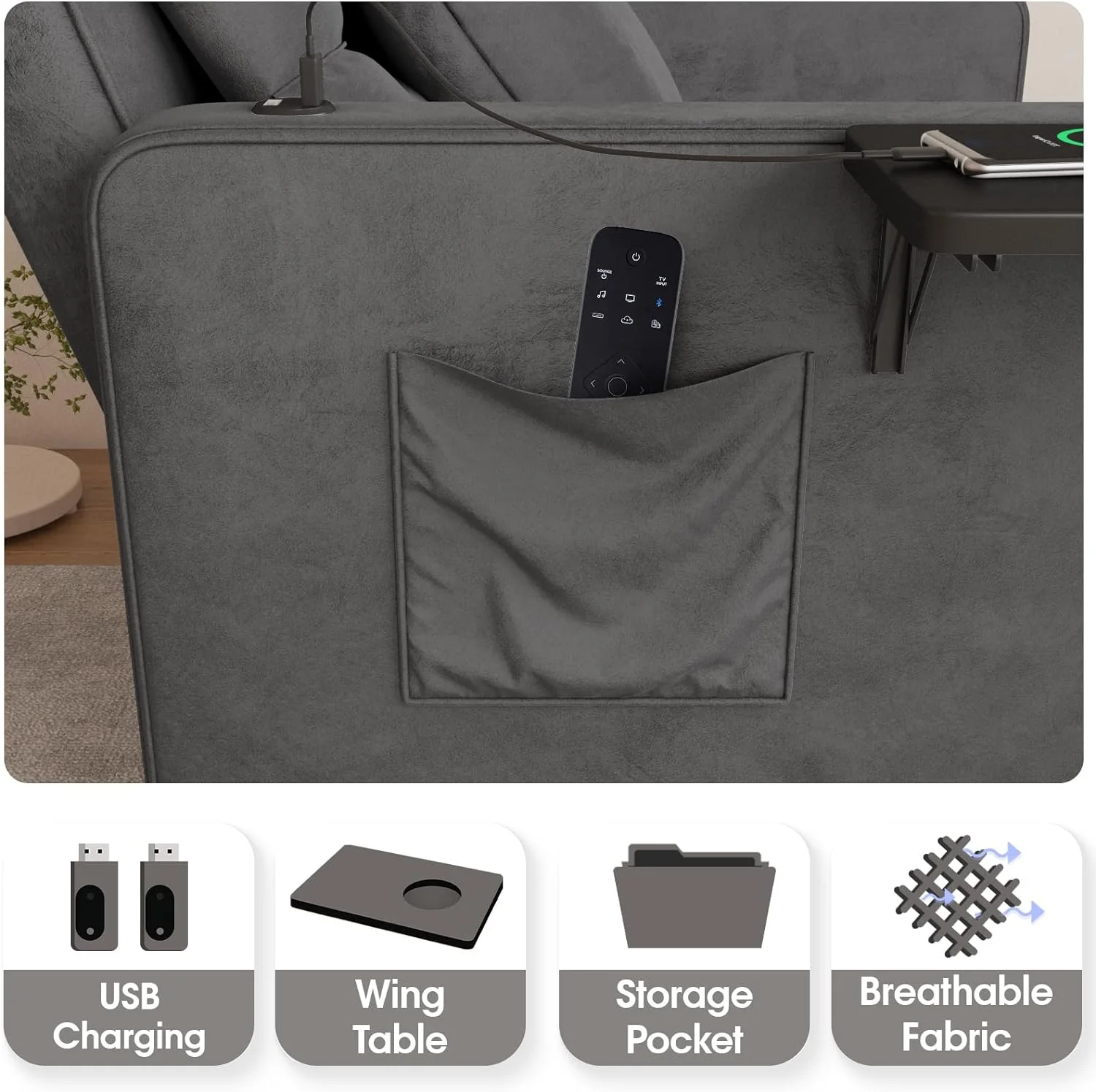 Vabches 3 in 1 Sofa Recliner with USB Port, Velvet, Convertible Bed and Chair, for Home or Office, Gray