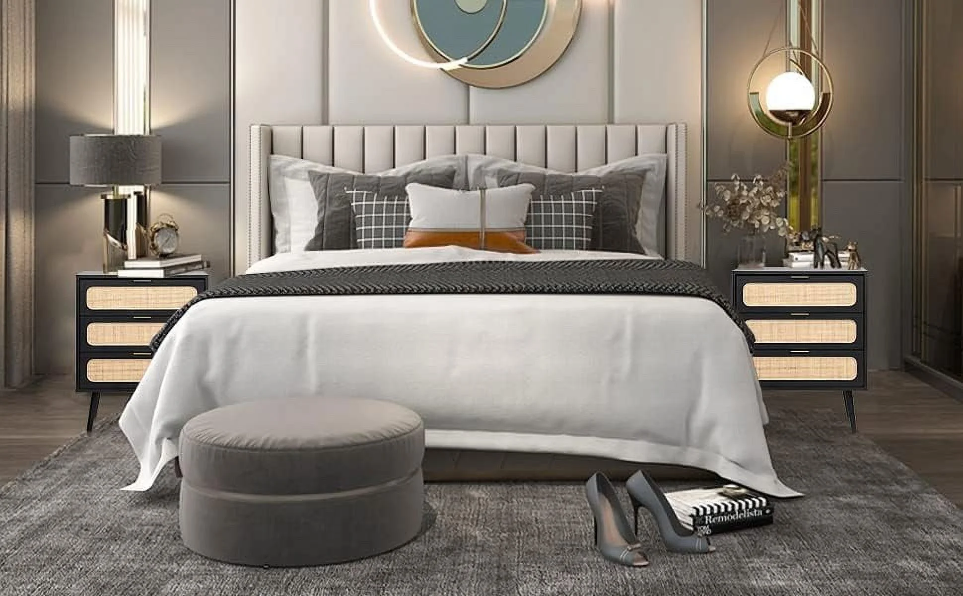 Home Square 3-Piece Set with Tufted Full Bed Armoire Wardrobe Cabinet Nightstand