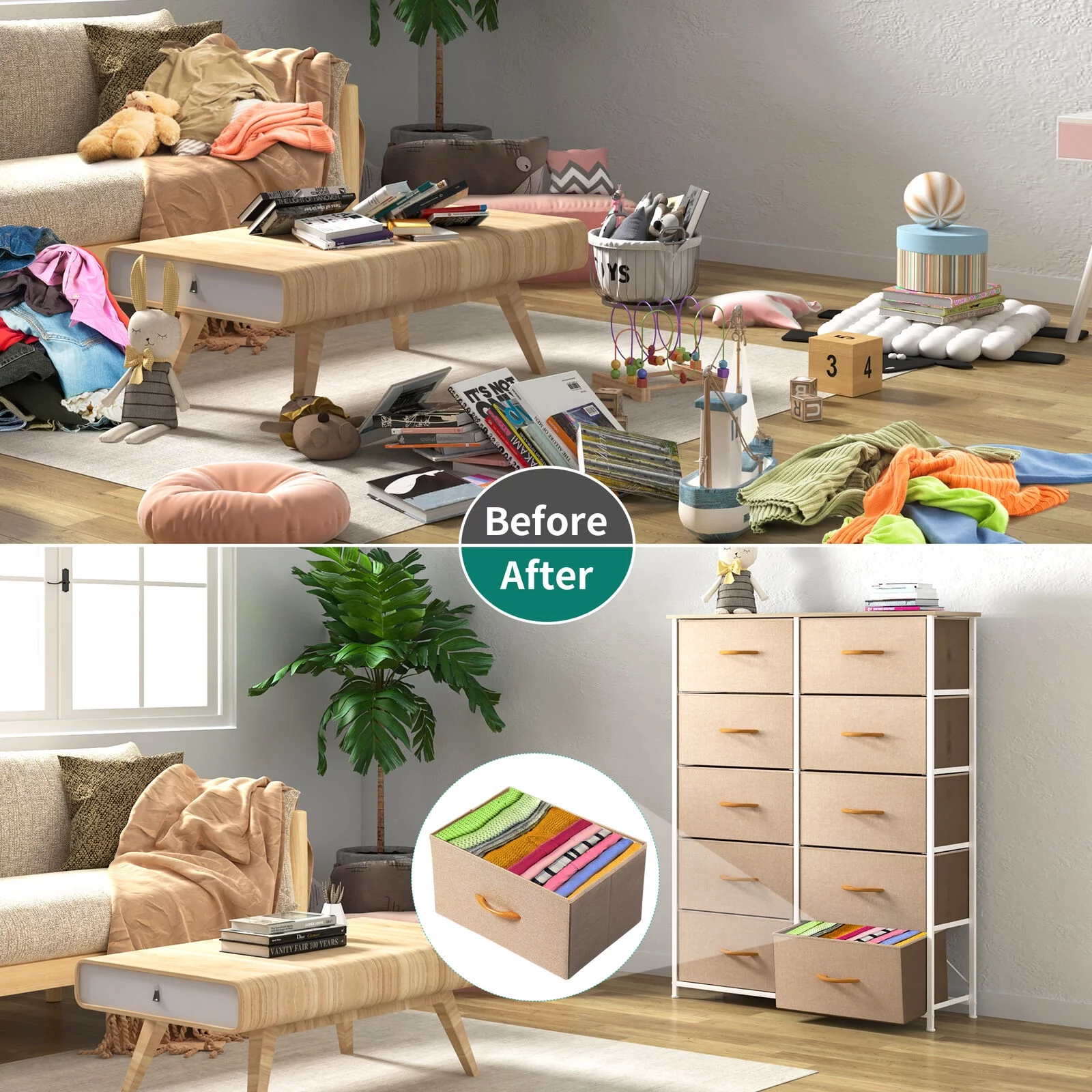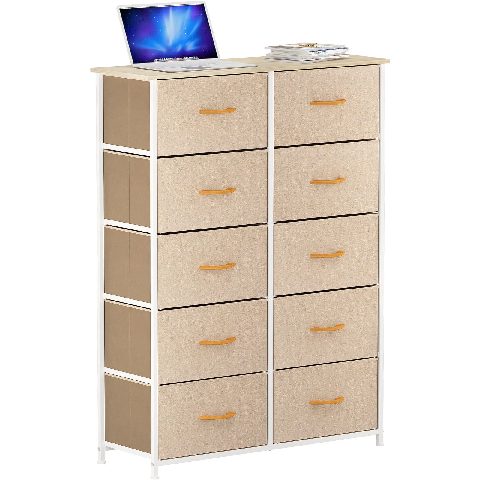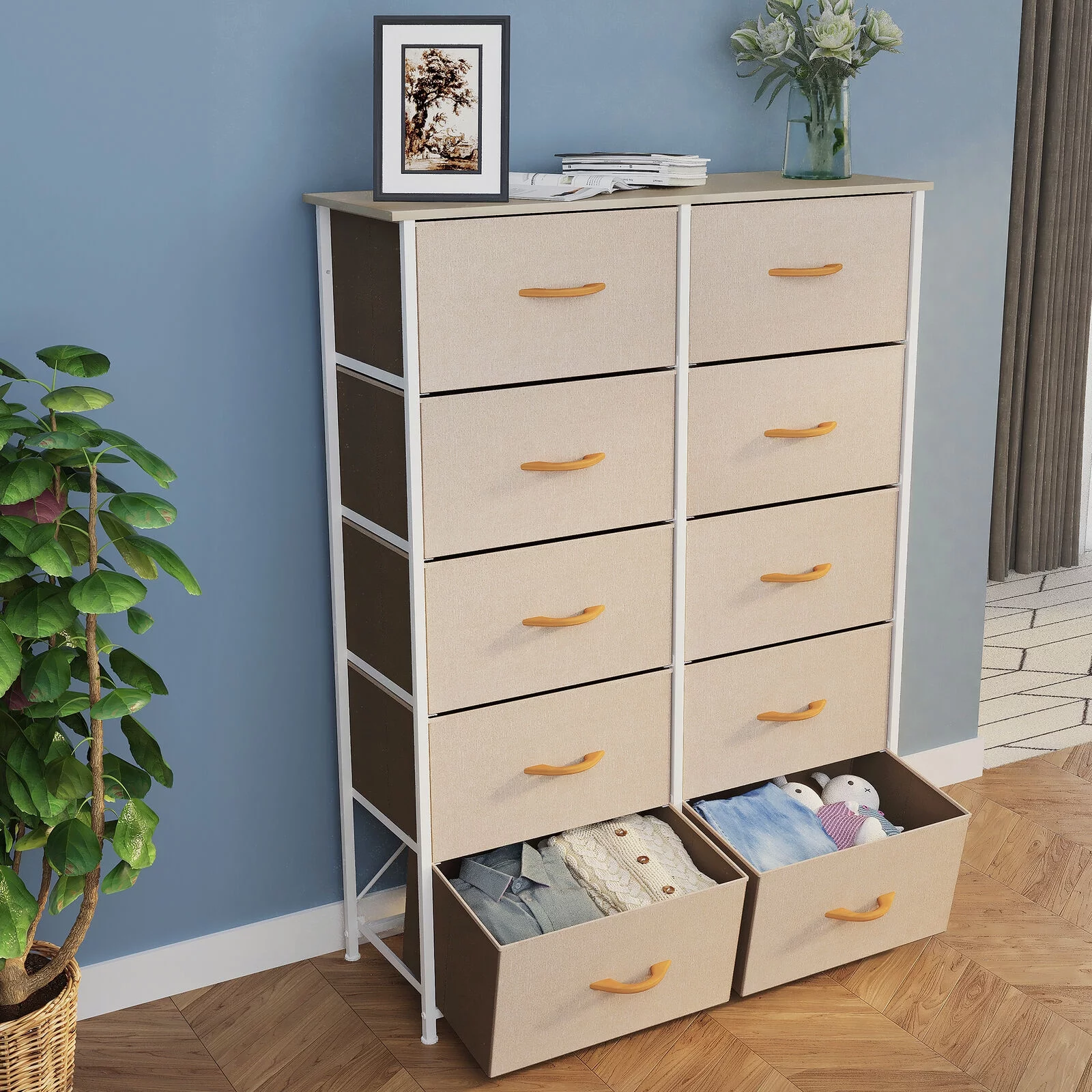 DWVO 10 Drawer Dresser Chest of Storage Dresser Tall Fabric Dresser Storage Cabinet Bin Nightstand Cabinet, Beige