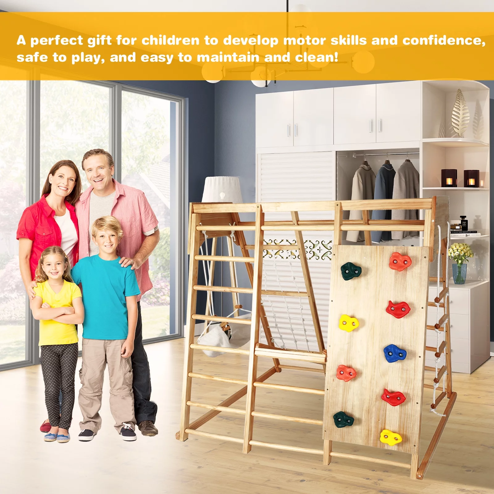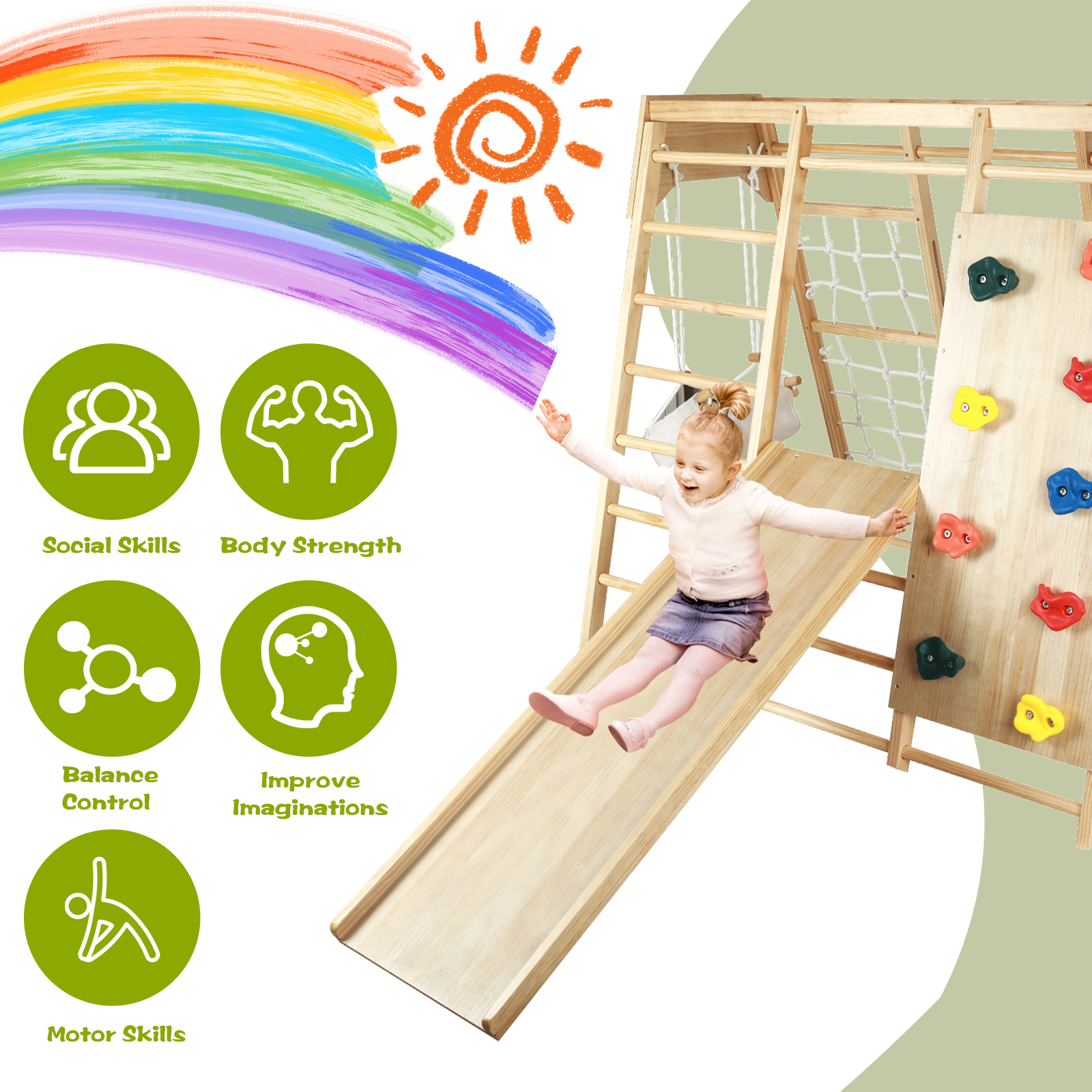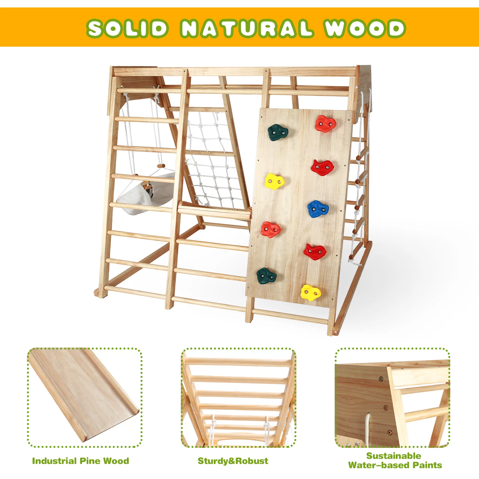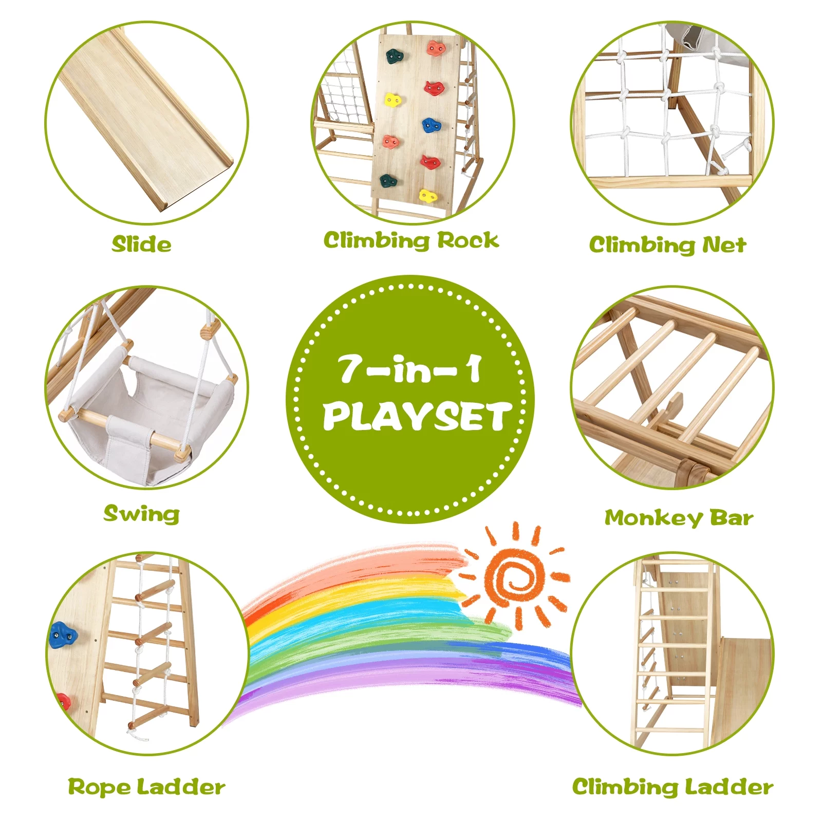 Fionafurn Indoor Outdoor 7-in-1 Kids Gym Playground Climbing Toys, with Swing, Slide, etc, Girls& Boys, Wooden, Natural