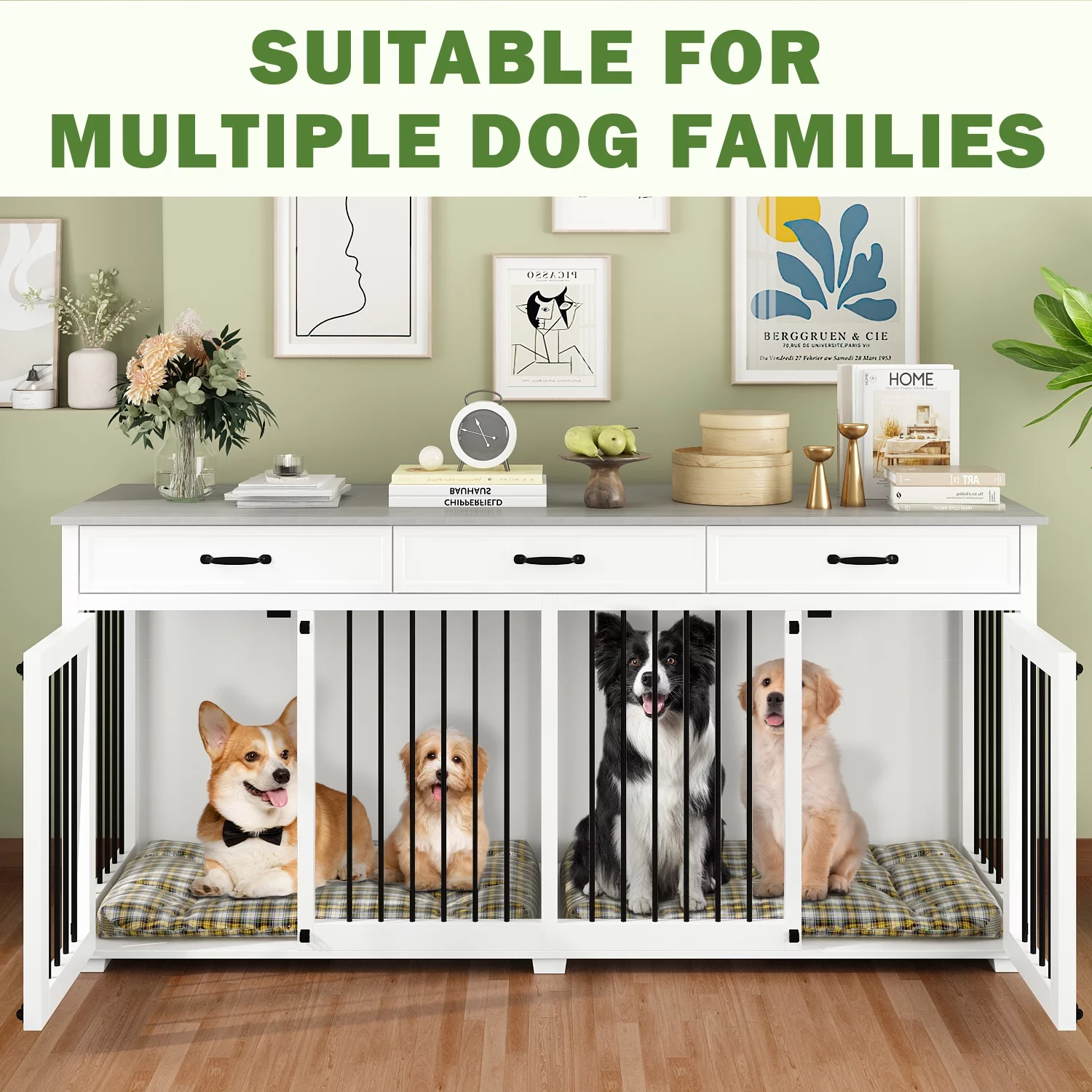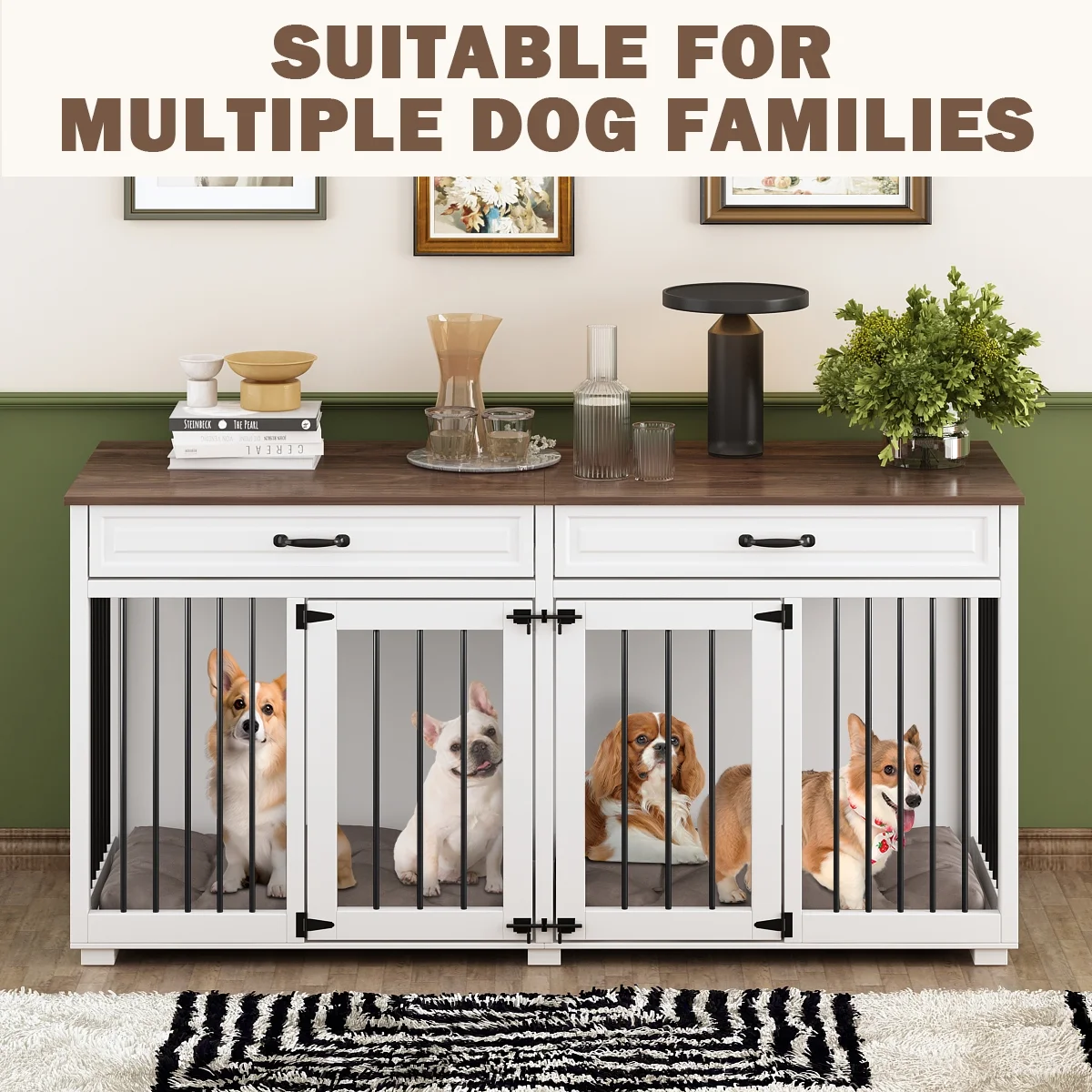 NARTRU 64.6" Large Double Dog Crate Kennel Furniture with Divider and 2 Drawers for 2 Small or Medium Dogs Indoor, White