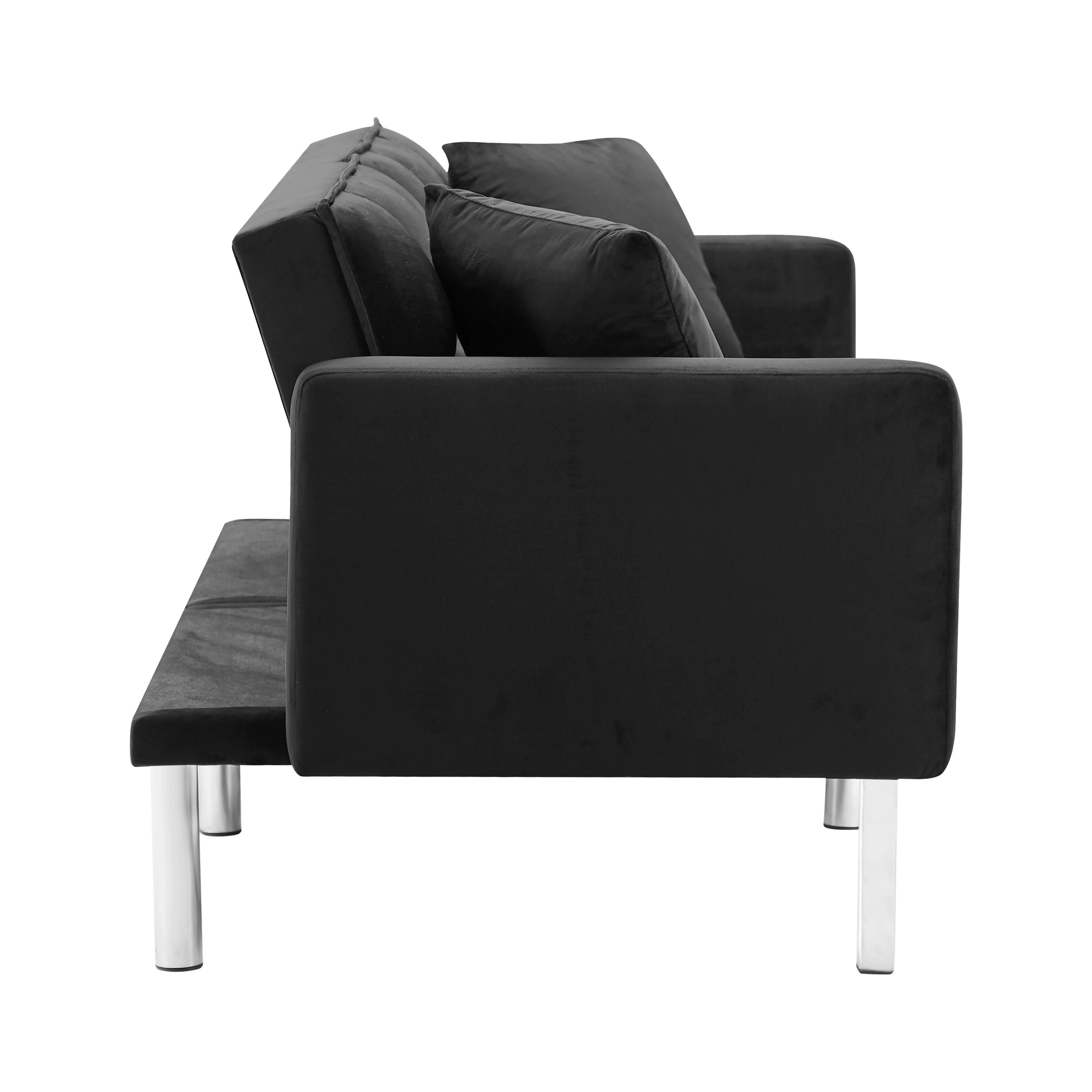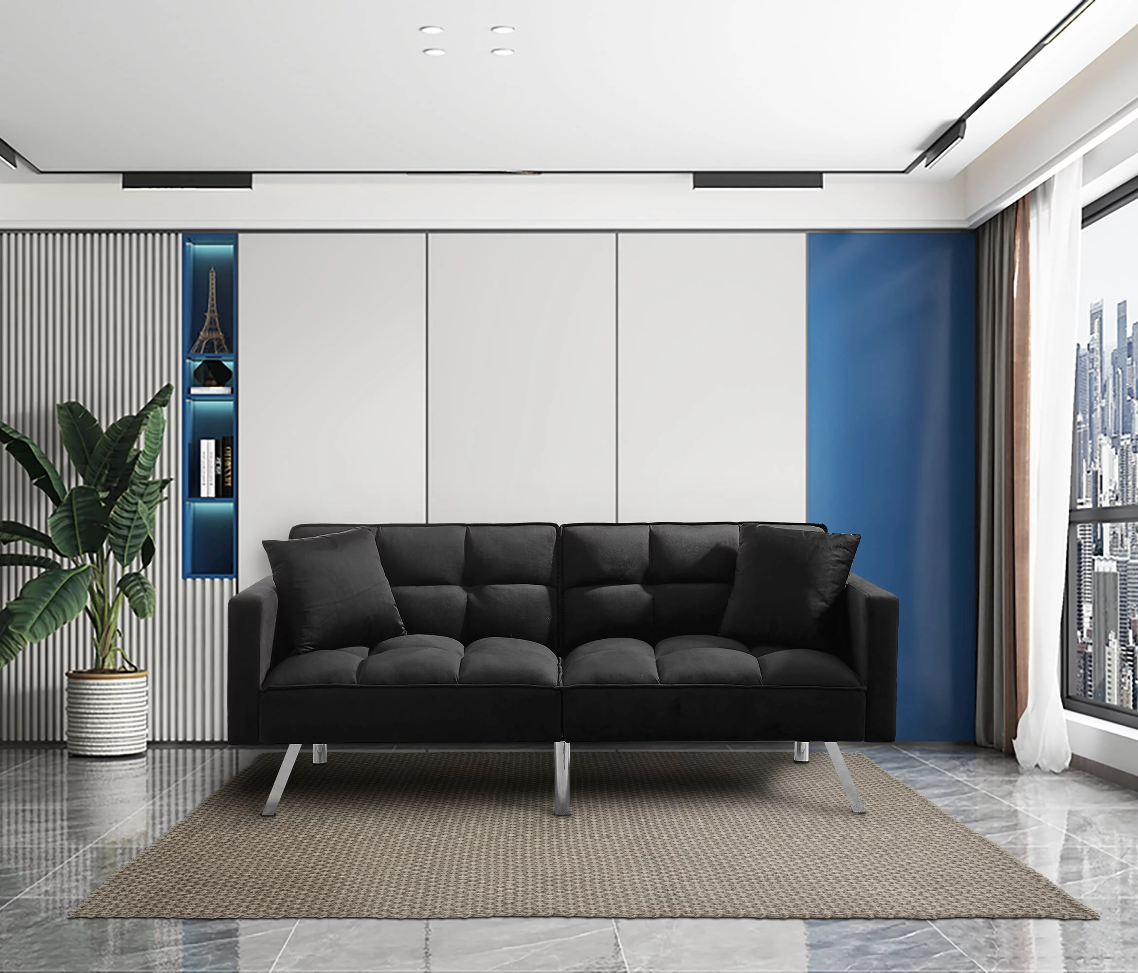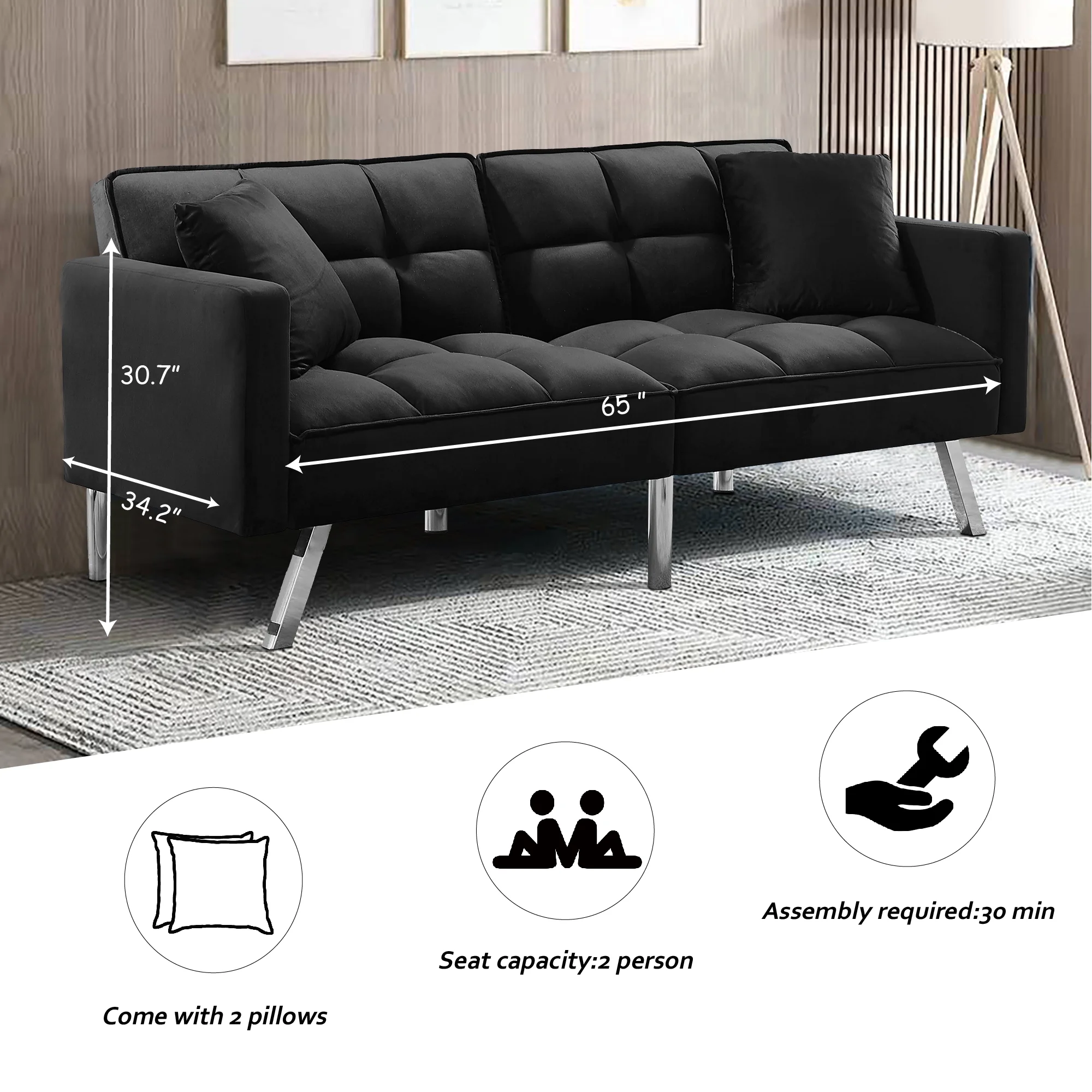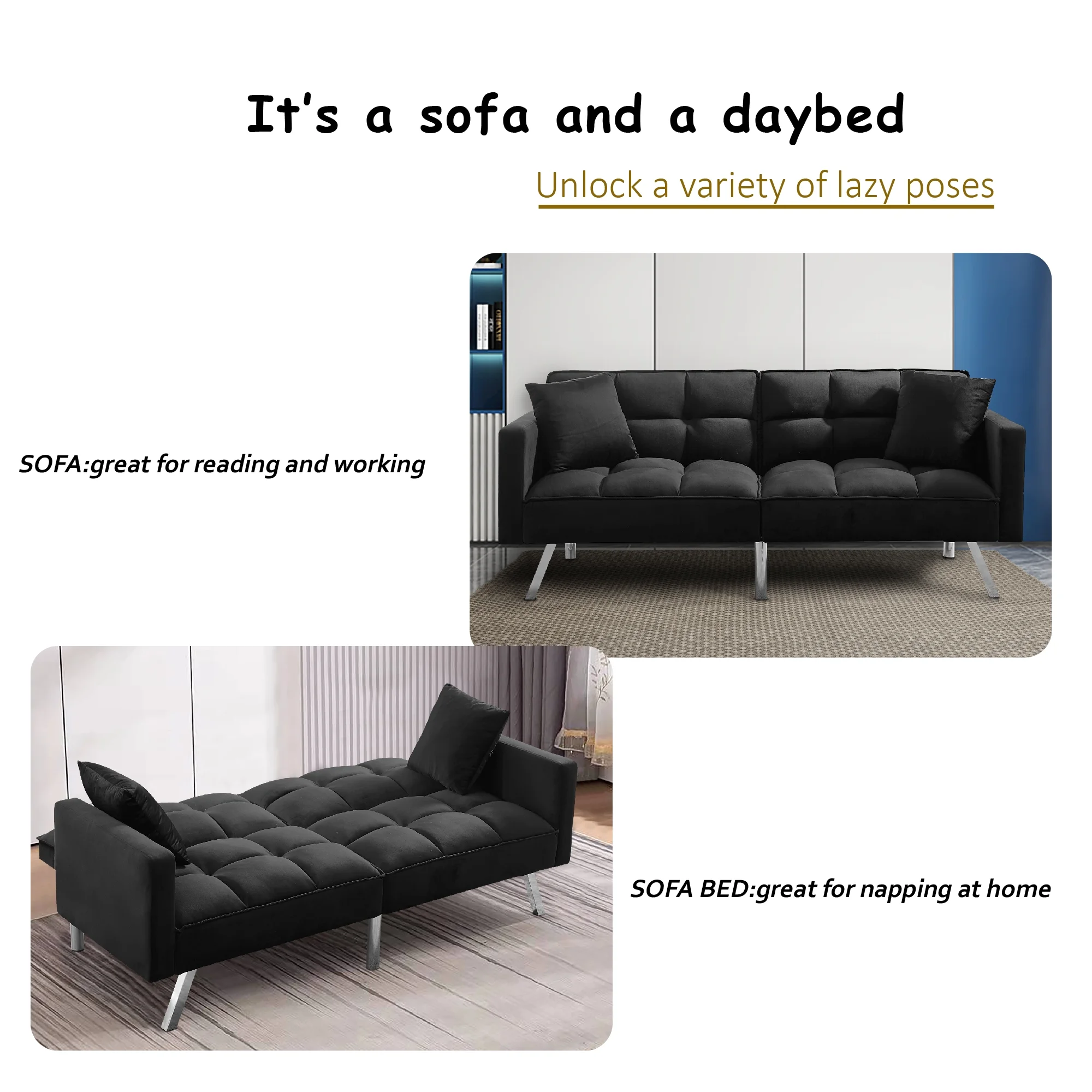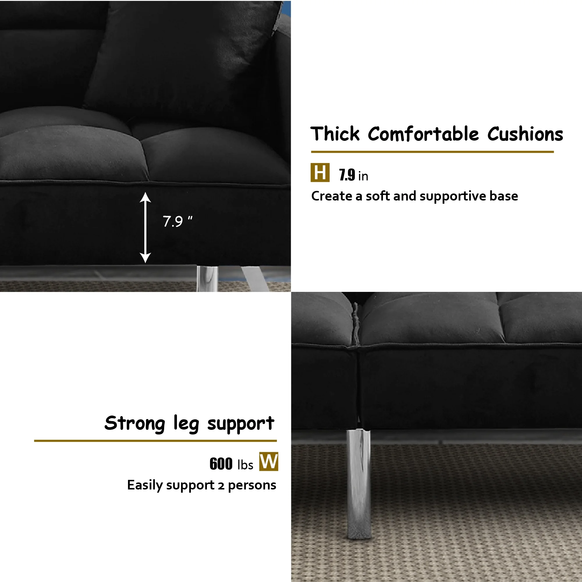 BSHTI Convertible Sofa Bed,Velvet Futon Sofa ,Sleeper Couch with Armrest and 2 Pillows for Living Room,Office( Black)