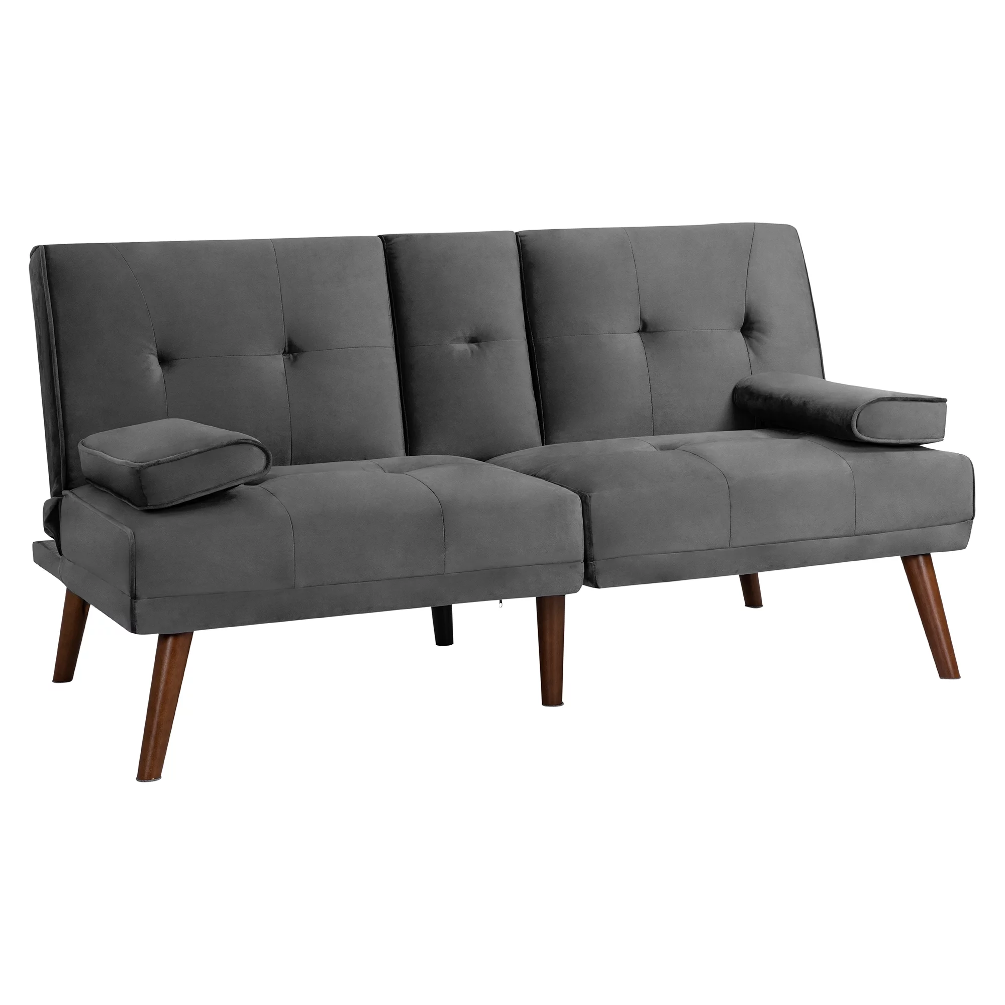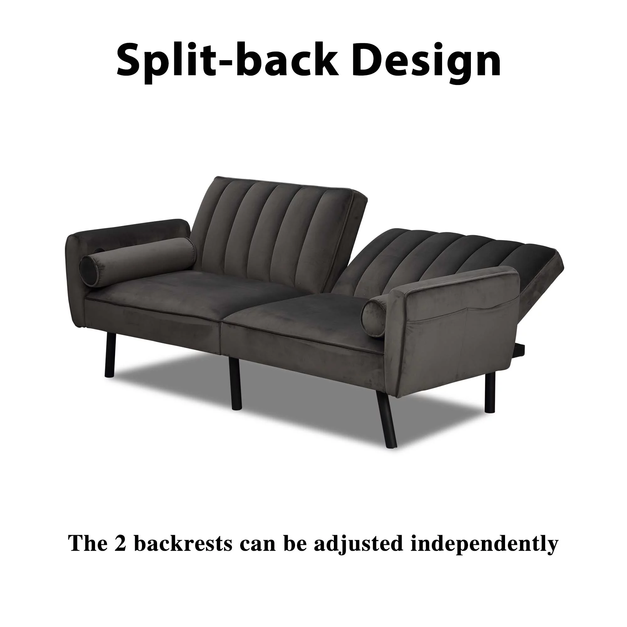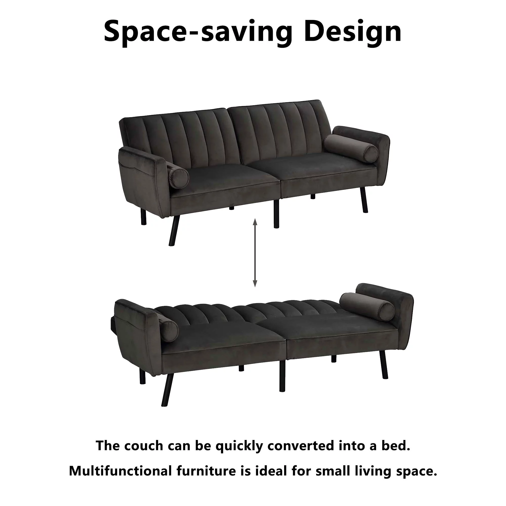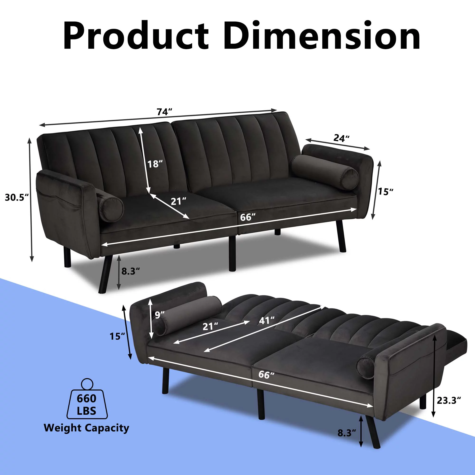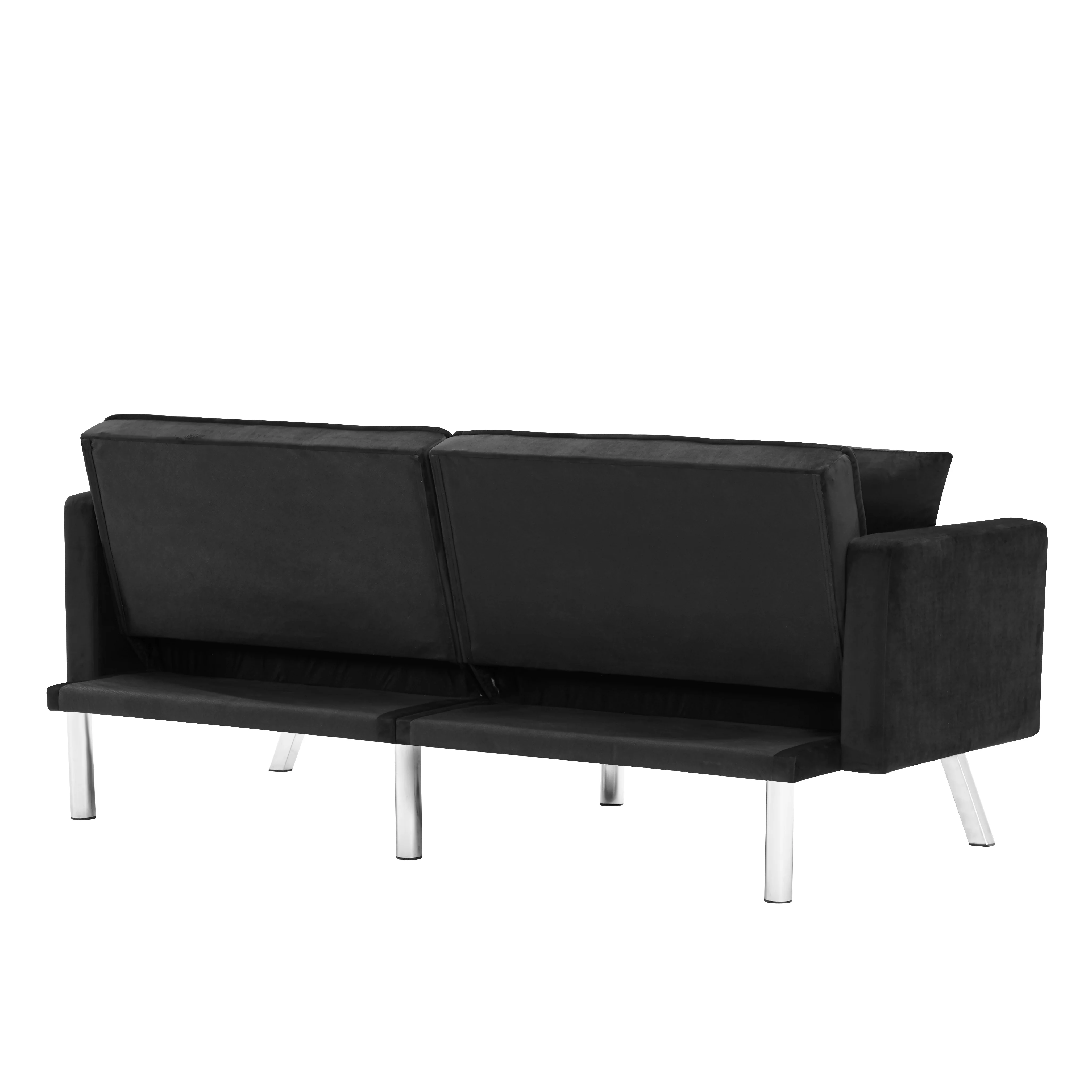 BSHTI Convertible Sofa Bed,Velvet Futon Sofa ,Sleeper Couch with Armrest and 2 Pillows for Living Room,Office( Black)