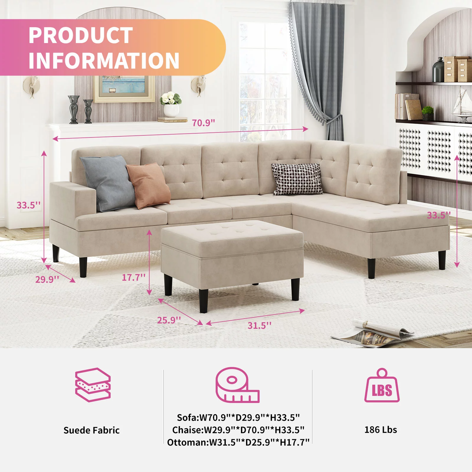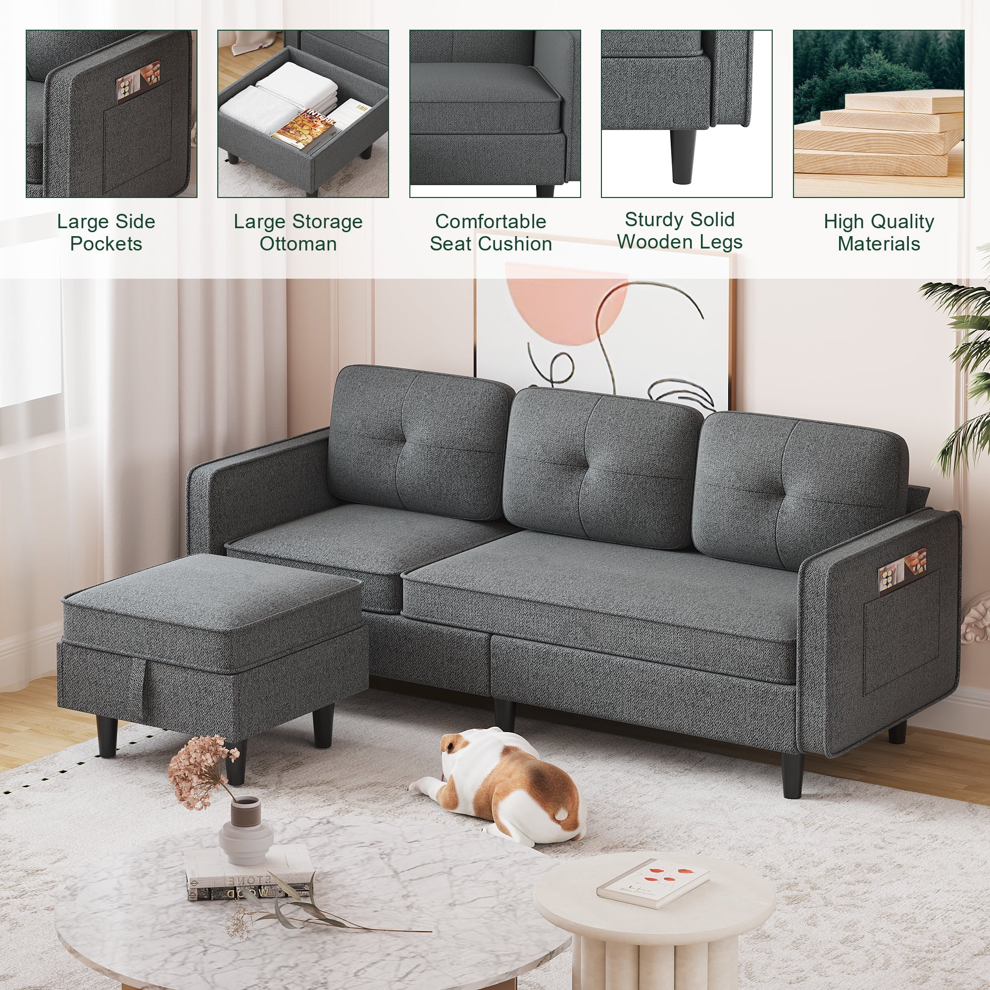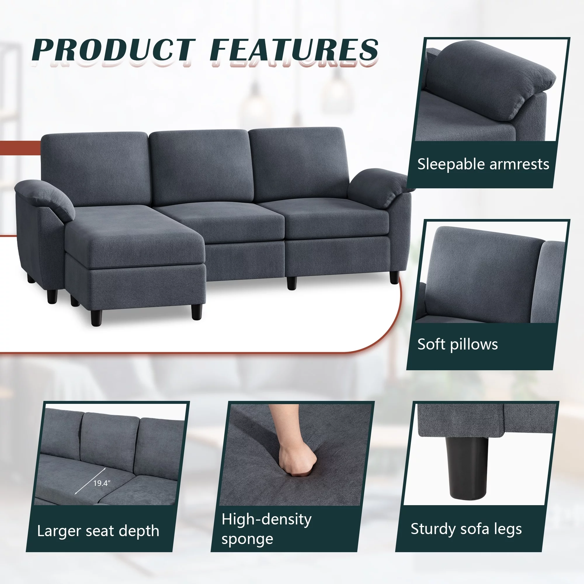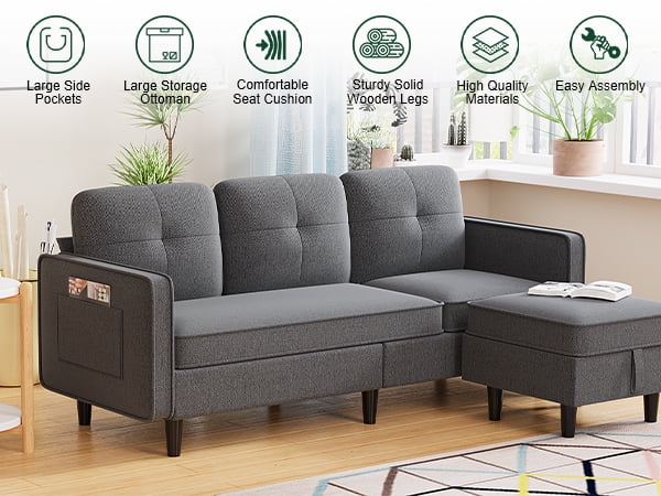Futzca Sectional Sofa Couch, 3 Seat L Shaped Sofa with Removable Pillows Dark Grey
