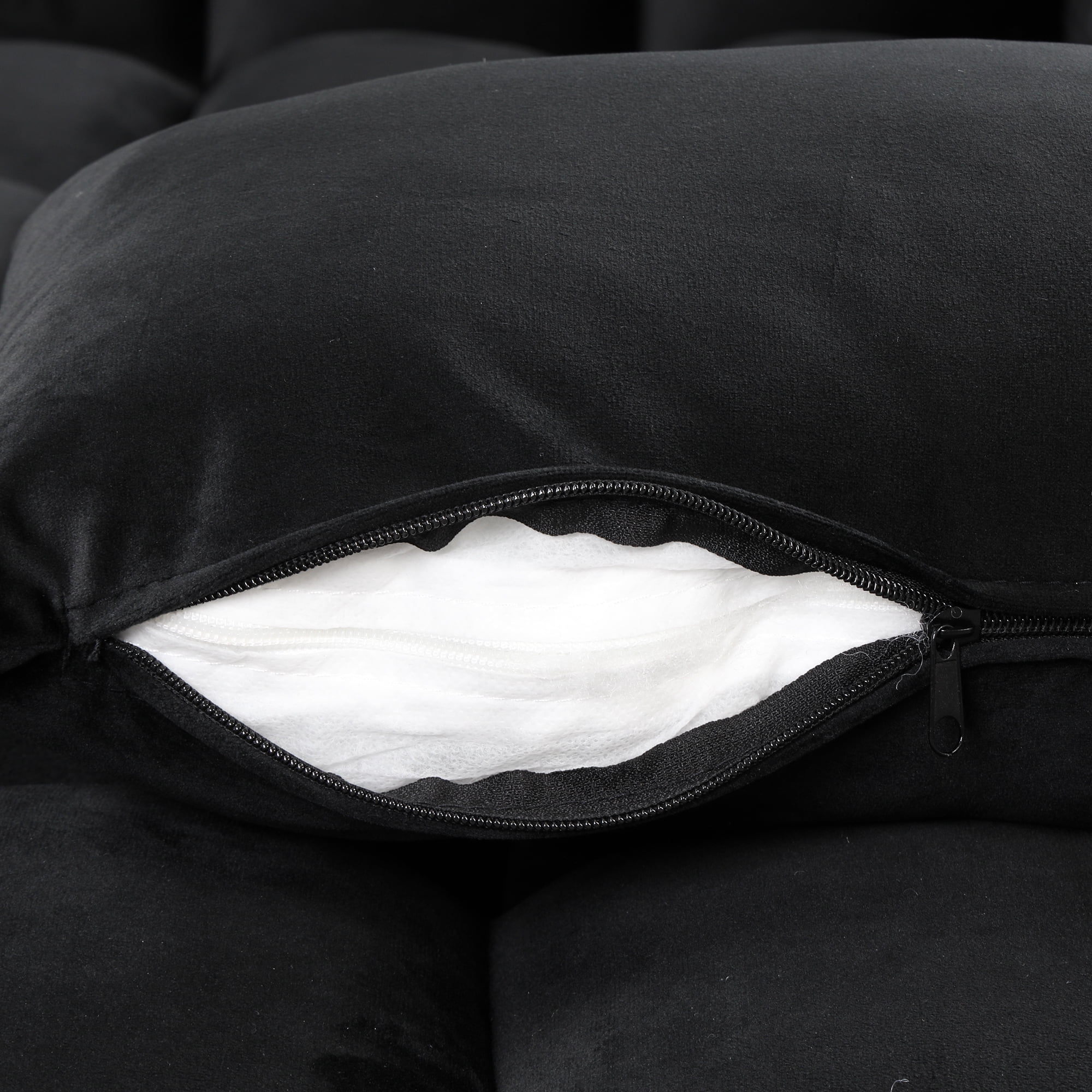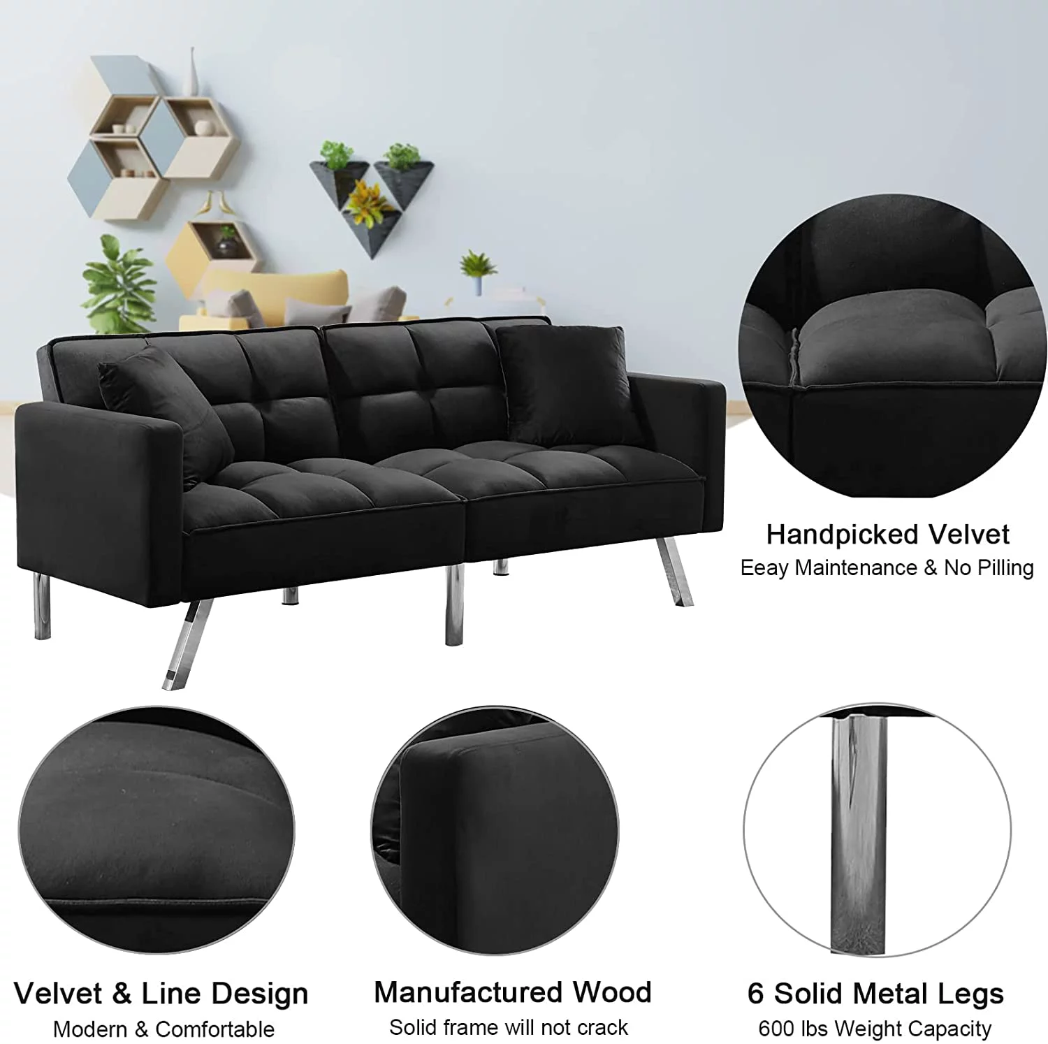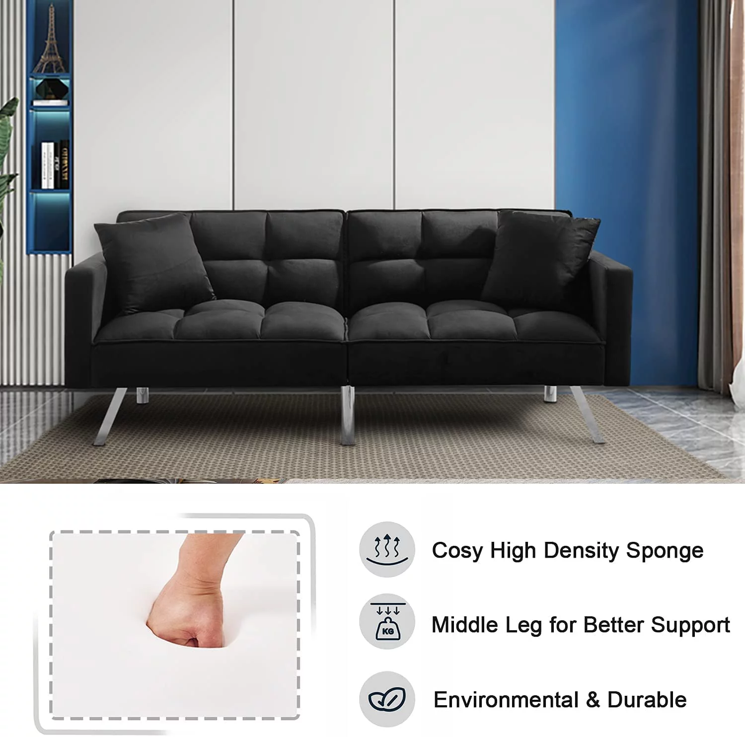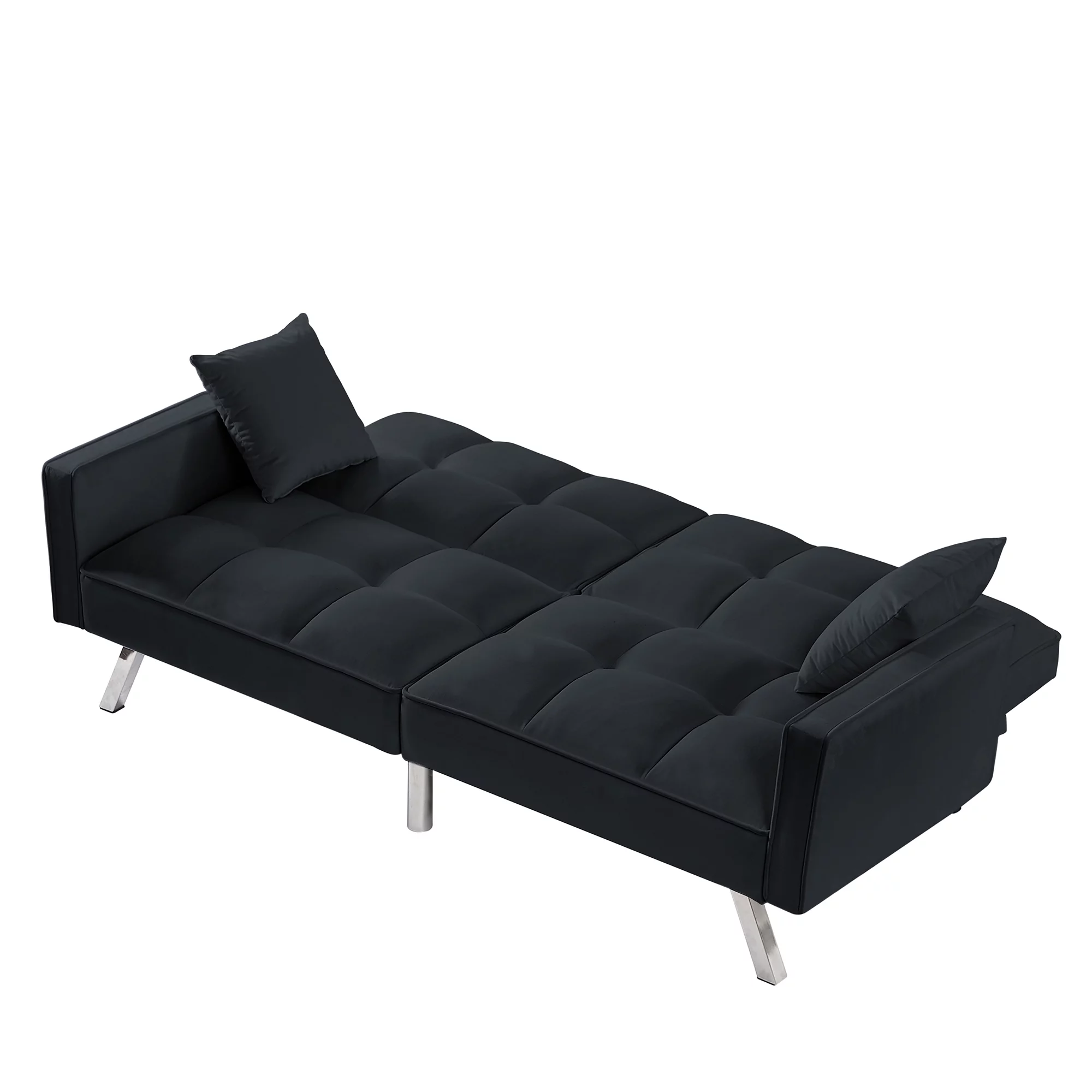 Holaki Modern Velvet Sofa Couch Bed with Armrests and 2 Pillows for Living Room and Bedroom, BLACK