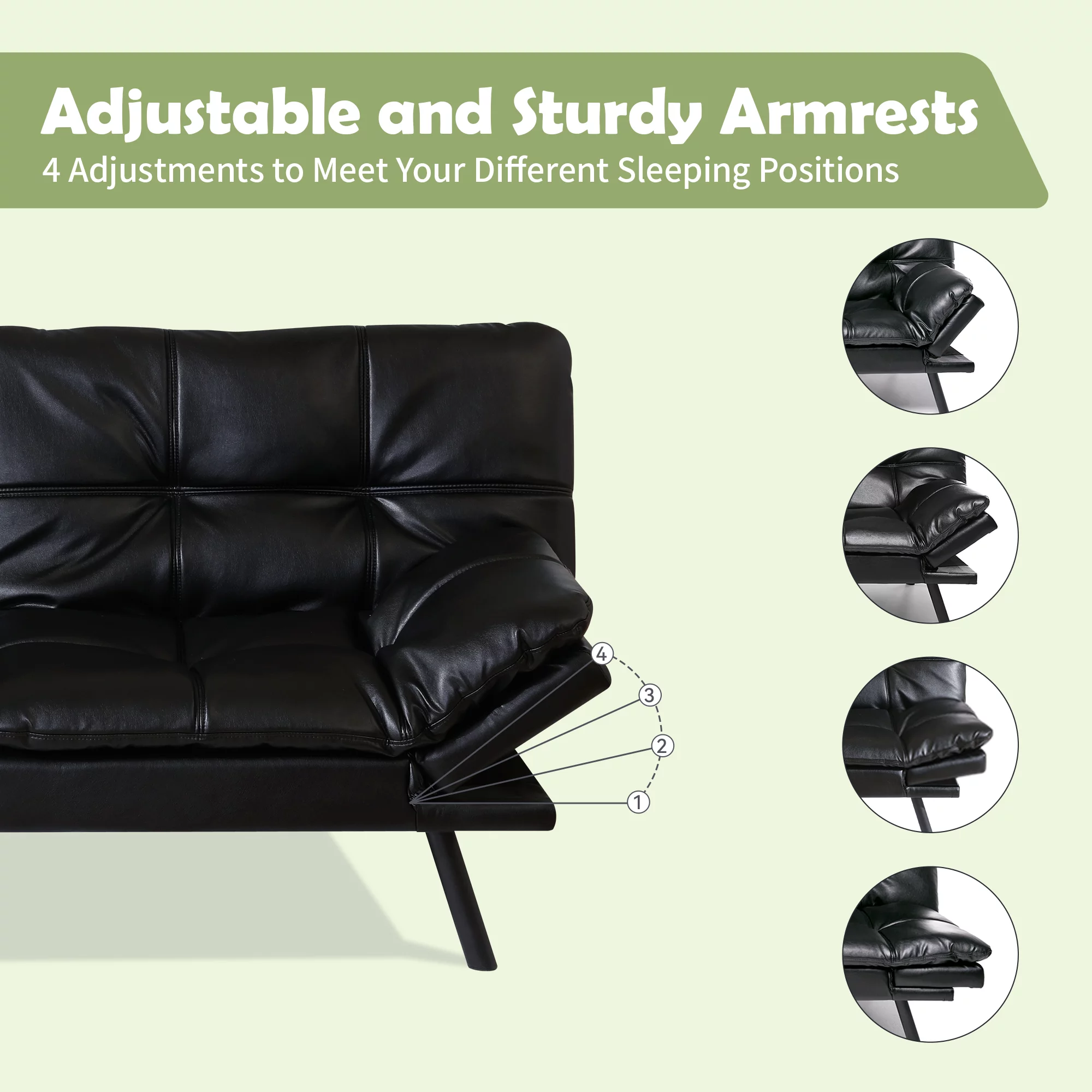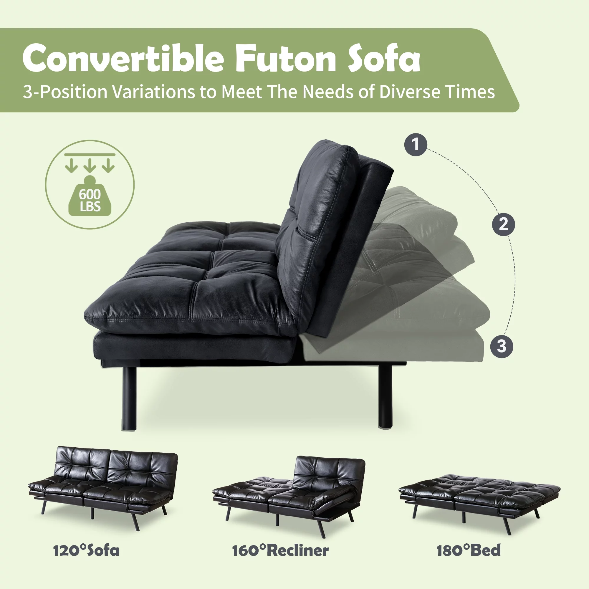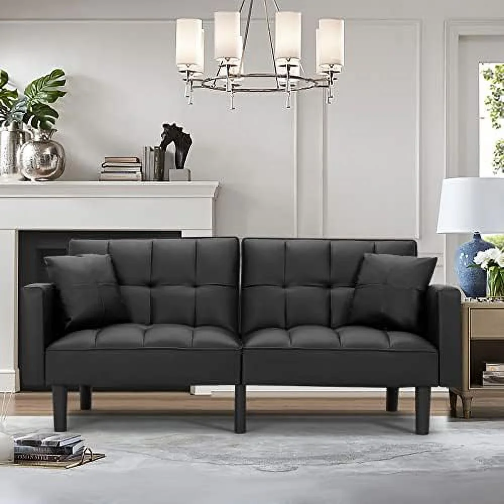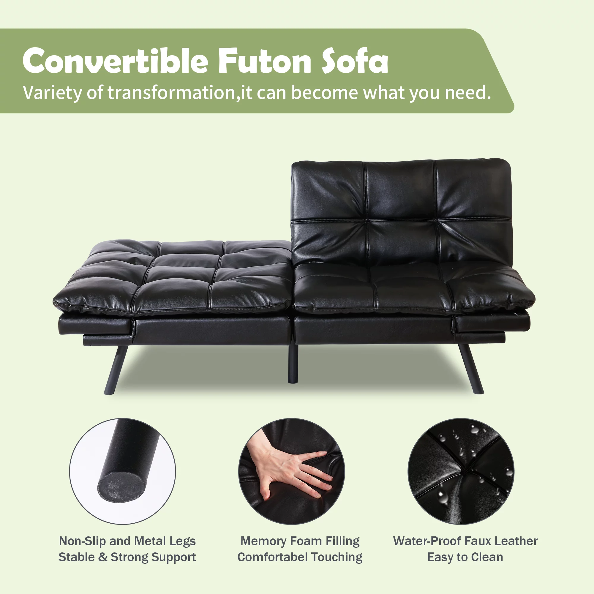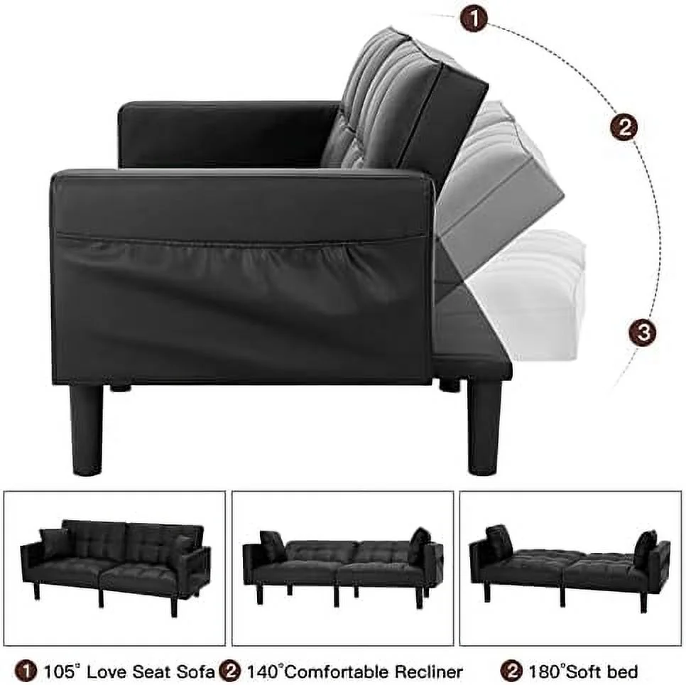 Hcore Memory Foam Convertible Sofa Bed/Couch/Futon Sets with Black Faux Leather for Living Room