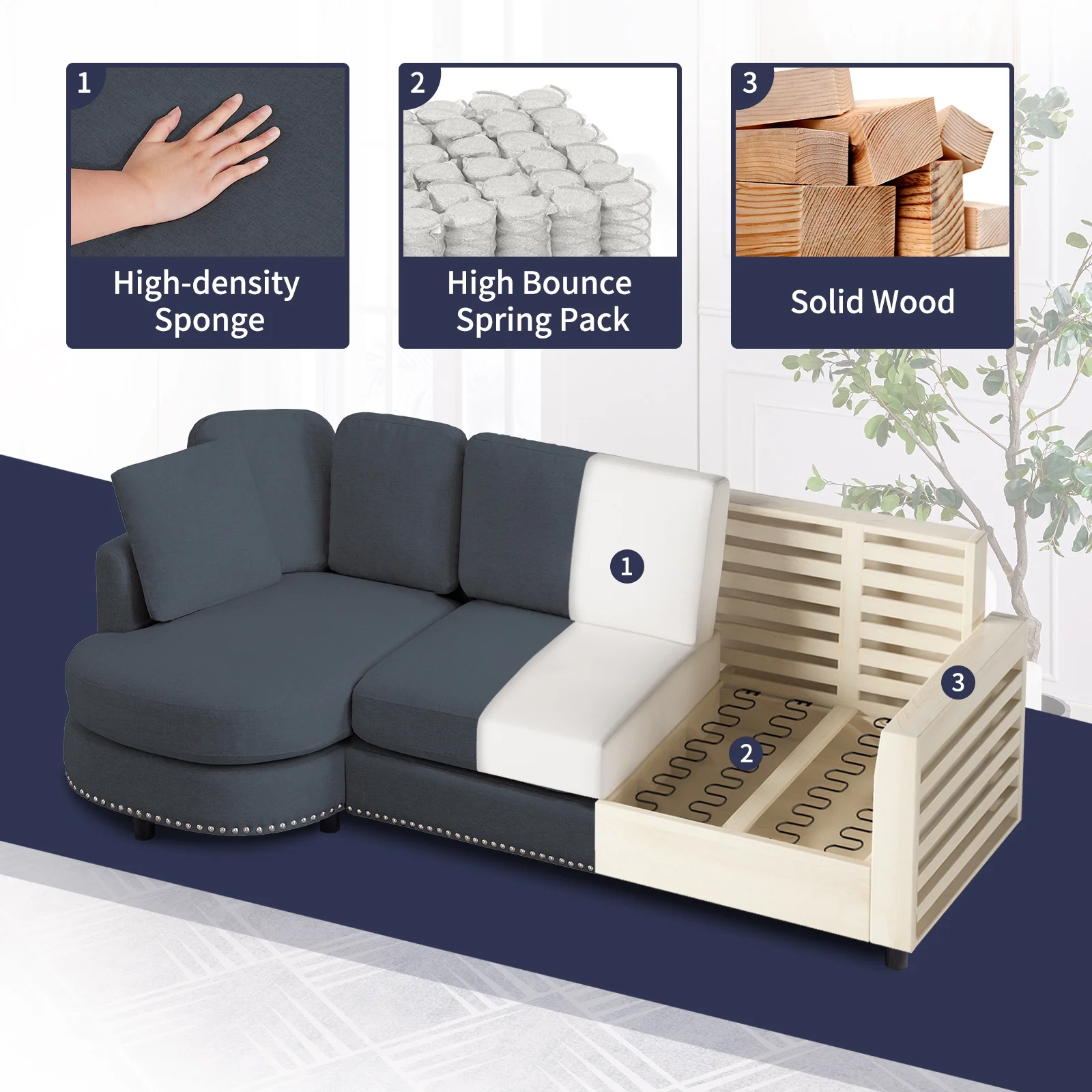 ZAFLY 3 Seater Sofa Couch, L Shaped Couch with Chaise, Curved Couches for Living Room - Dark Grey