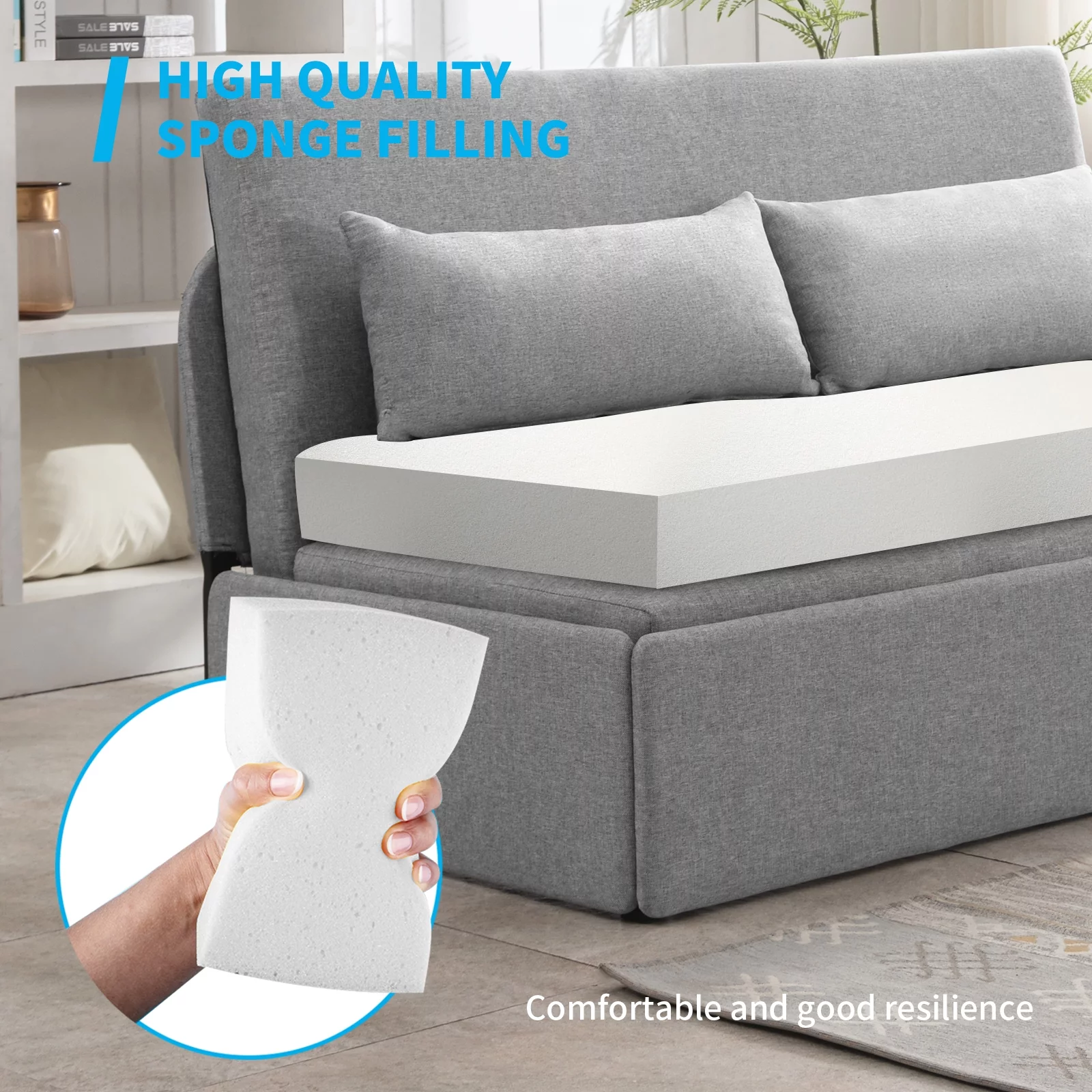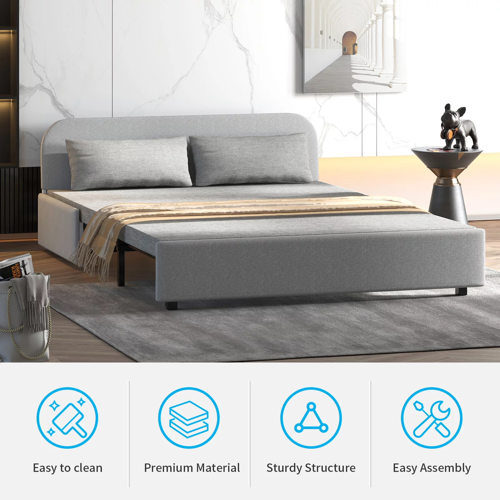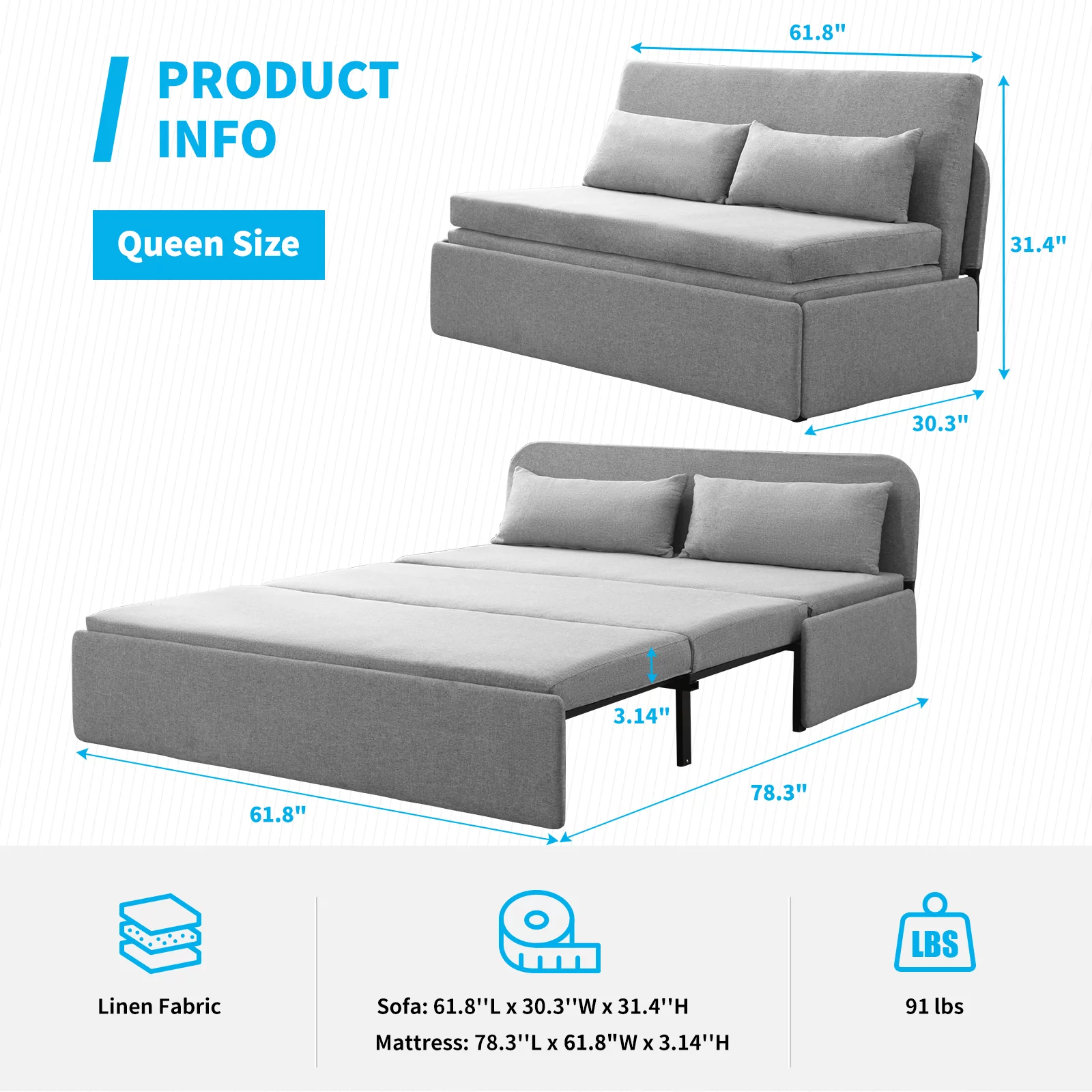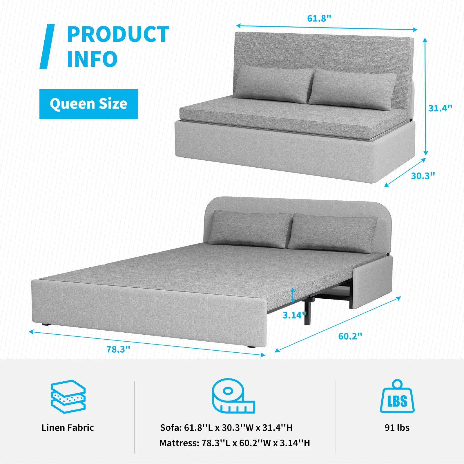 BALUS 61"W Convertible Sofa Bed, Queen Daybed, Linen Fabric Couch, Upholstered Loveseat Sleeper, Light Gray